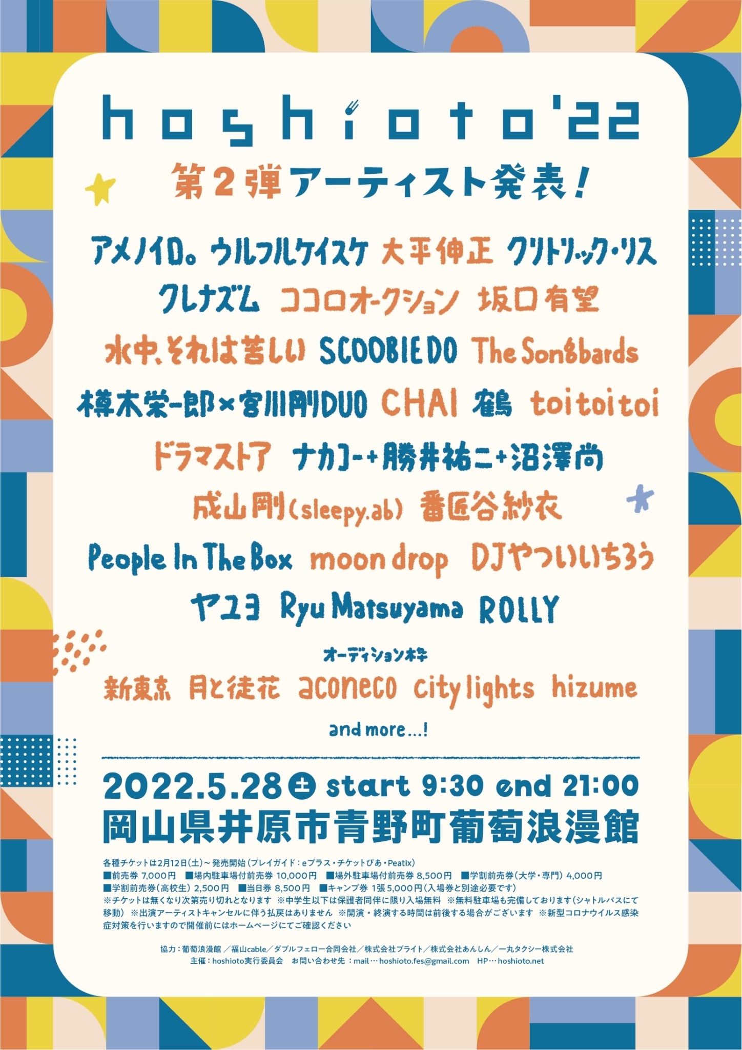 5月28日(土)に岡山県井原市青野町 葡萄浪漫館にて3年ぶりに開催される岡山の野外フェスティバル『hoshioto'22』の第二弾アーティストが発表された。
