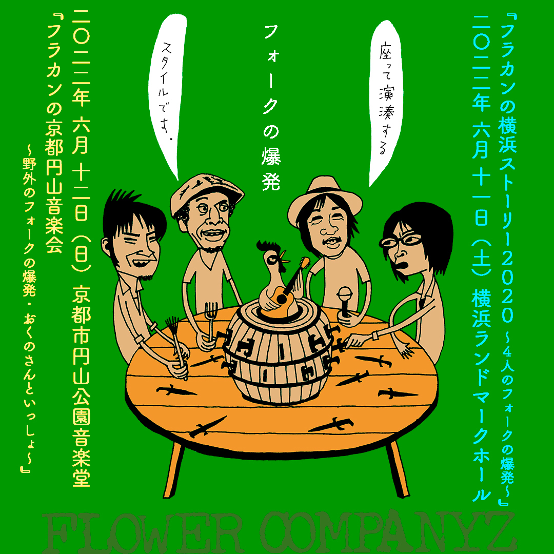 初日・6月11日(土)は、横浜ランドマークホールにて、2020年開催した『フラカンの横浜アリーナ』から続く<フラカンの横浜ストーリー>シリーズを今年はアコースティックver.で開催。そして2日目・6月12日(日)は、京都市円山公園音楽堂にて、ゲストミュージシャンに奥野真哉(ソウル・フラワー・ユニオン)を迎えて、初の野外での『フォークの爆発』を開催する。