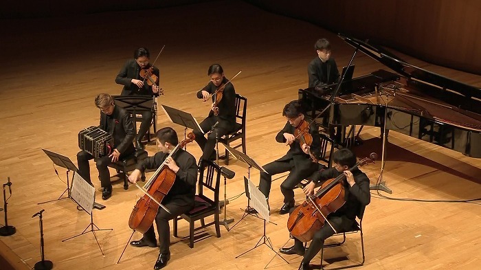 リサイタルが後半に差し掛かると、アンサンブルの人数が少しずつ増えてくる。宮田とウェールズ弦楽四重奏団に山中も加わって、《アディオス・ノニーノ》と《アレグロ・タンガービレ》が演奏されたが、特に心に残ったのは《アディオス・ノニーノ》だった。「さようなら、ノニーノ(ピアソラの父のニックネーム)」を意味する《アディオス・ノニーノ》は、父の死に立ち会えなかったピアソラがその死を悼んで書いた特別な作品であり、作曲家自身も生涯大切に演奏し続けた。《鮫》とは対照的な静かな世界が広がる。宮田もこの作品をとりわけ大切にして、アルバムも《アディオス・ノニーノ》で締めくくっている。新型コロナウイルスによるパンデミック、そしてウクライナでの戦争。この数年、私たちは暗く悲しいニュースに日々向き合ってきた。《アディオス・ノニーノ》はピアソラが個人的な悲しみを乗り越えるために作曲した「喪の仕事」だが、今を生きる私たちにも必要な音楽に感じられた。《アディオス・ノニーノ》はこの日のリサイタルのハイライトだった。