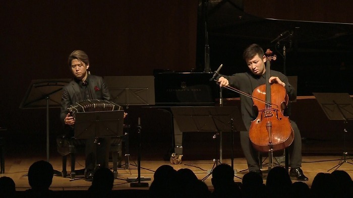 前半2曲目は作曲家の山中惇史をピアノに迎えて《タンガータ》が演奏された。山中はアルバムと今回のリサイタルで演奏されたほぼ全てのピアソラ作品を編曲している。宮田はそのアレンジを「ピアソラ&山中惇史」の作品と絶賛した。《タンガータ》でも山中のオリジナリティは随所に感じられる。ゆったりとした前半部分では、ピアソラの音楽が持つブエノスアイレスの空気を大切にしながらオリジナルのテクスチャを活かしているが、後半に入りテンポが上がると山中ワールドとなる。それは確かにピアソラの音楽だが、纏う空気は2020年代の東京そのものだ。作曲家のオリジナルを尊重しながらも、アクチュアリティを注ぎ込むことも忘れないのが山中版ピアソラの魅力である。