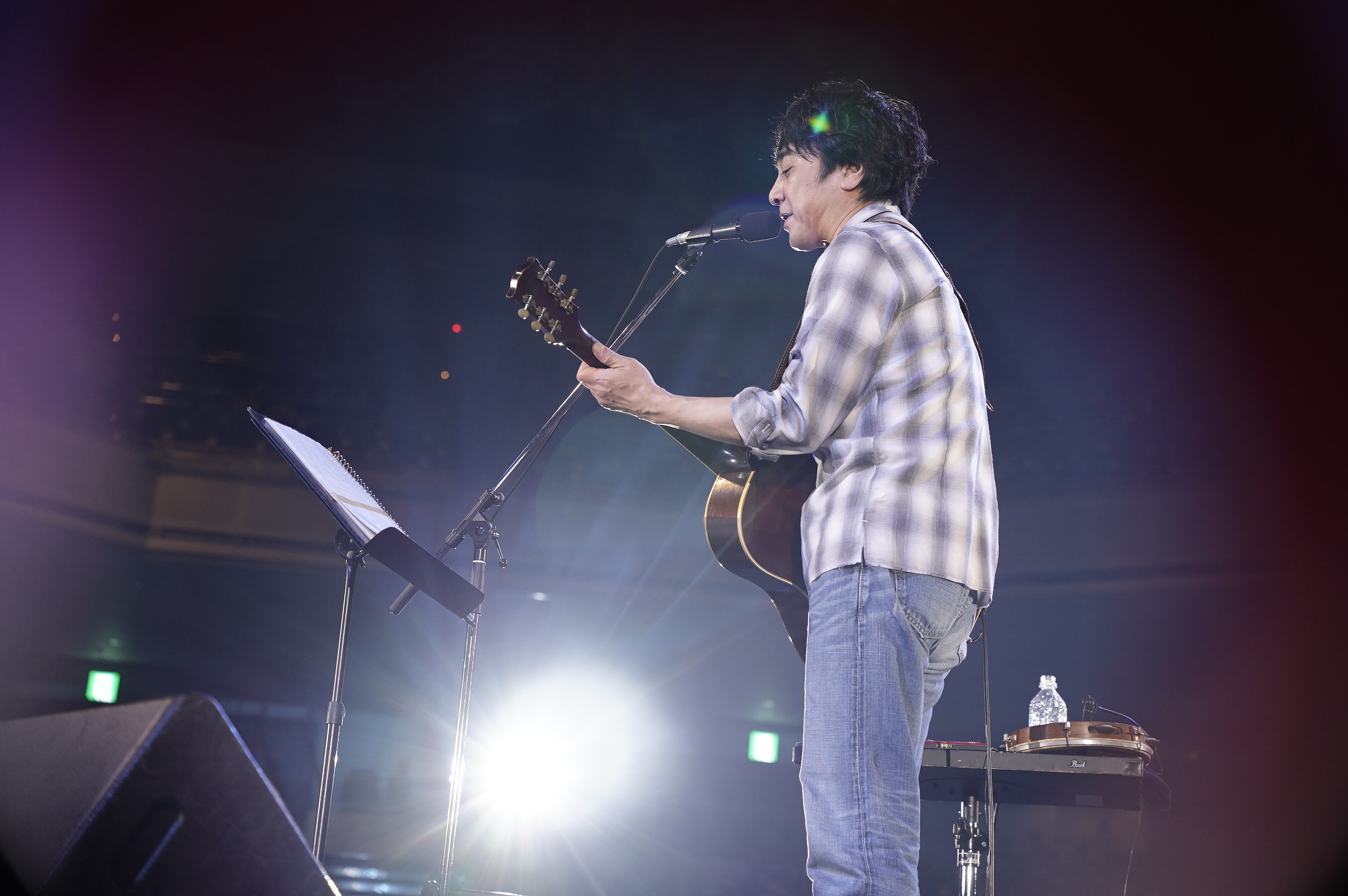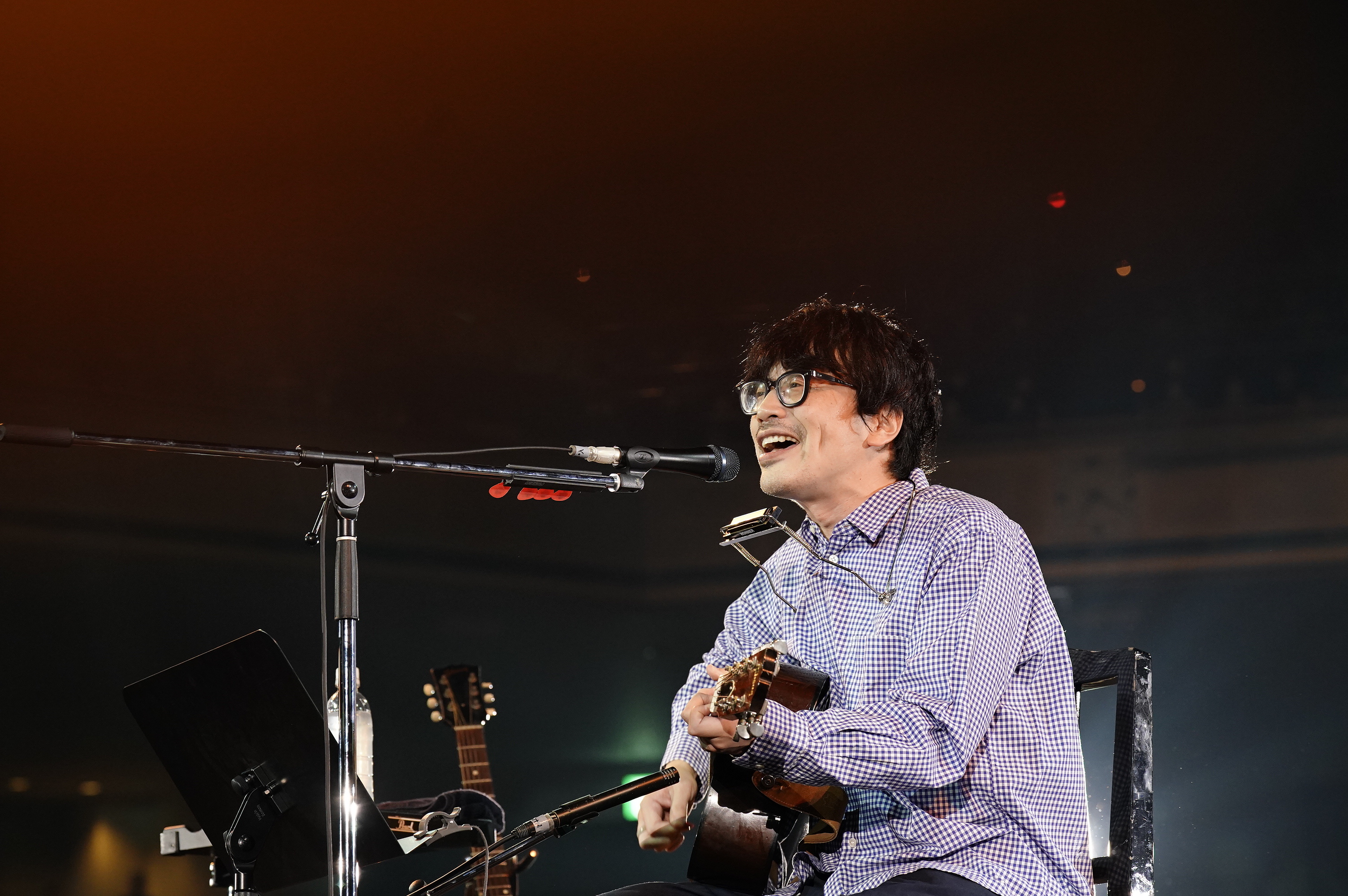 “アコースティックギターの名手”として名高い山崎まさよしは、ループマシンにパンデイロの音を刻み、リズムが流れる中で「アレルギーの特効薬 ~ What'd I Say(Ray Charlesカバー)」を披露し、序盤からオーディエンスを興奮に誘う。それから映画「男はつらいよ」の寅さんのモノマネをしながら「新曲をやります」と告げて昨年リリースのアルバム『STEREO 3』から「Hello ヘヴン」をパフォーマンス。3曲目には珠玉のバラードソング「One more time, One more chance」を届け、その伸びやかな歌声に観客は聞き入っていた。ラストに選ばれたのは趣味のDIYを生きがいとする思いを綴った歌で、“DIY仲間”の斉藤和義からタイトルをつけたという新曲「斉藤さん」。山崎はタイトルに名前を使用していいか、本人に電話をかけて確認したそうだ。