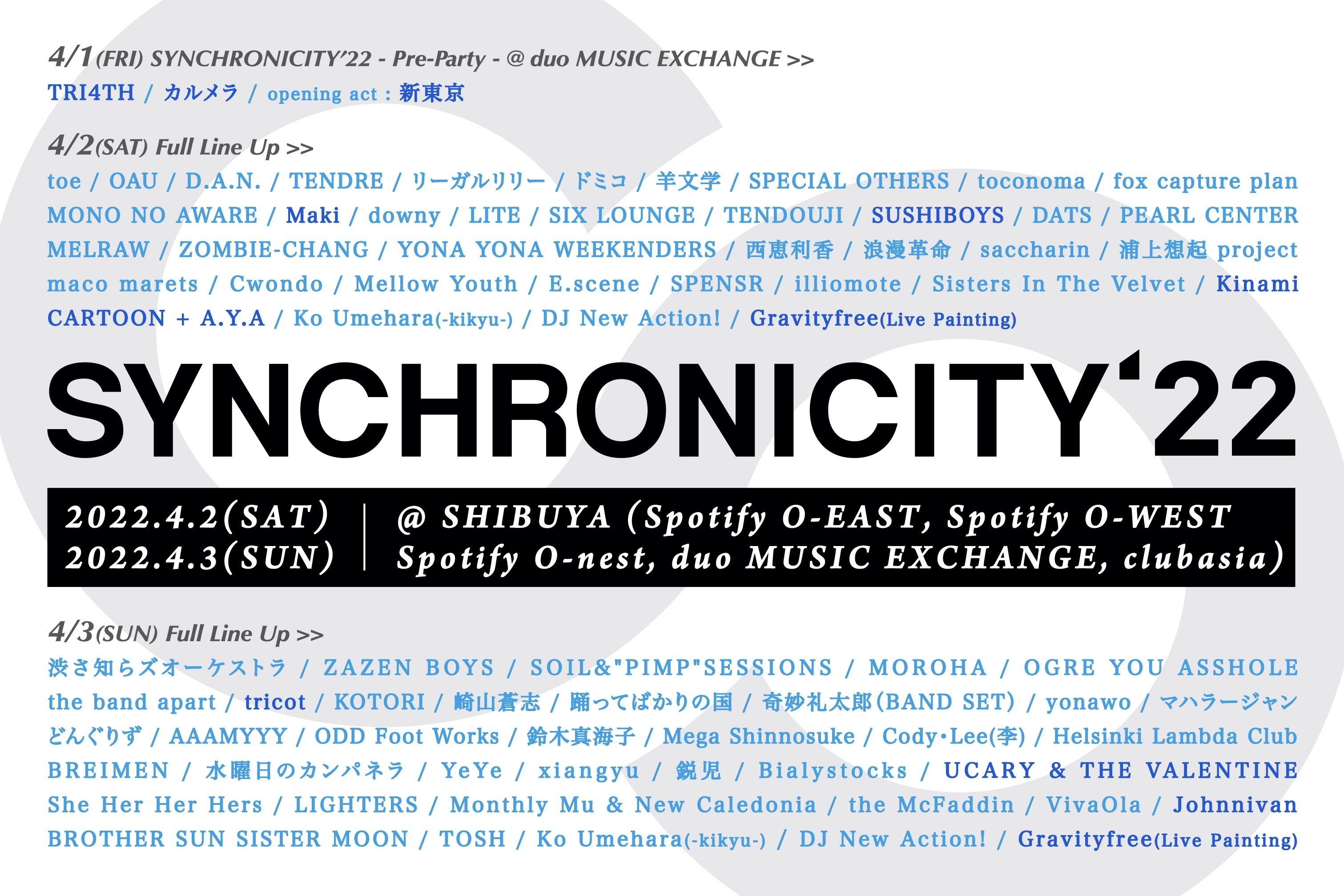 2022年4月2日(土)〜4月3日(日)に東京・渋谷にて開催の都市型フェスティバル『SYNCHRONICITY’22』のタイムテーブル、及び、最終ラインナップが発表となった。