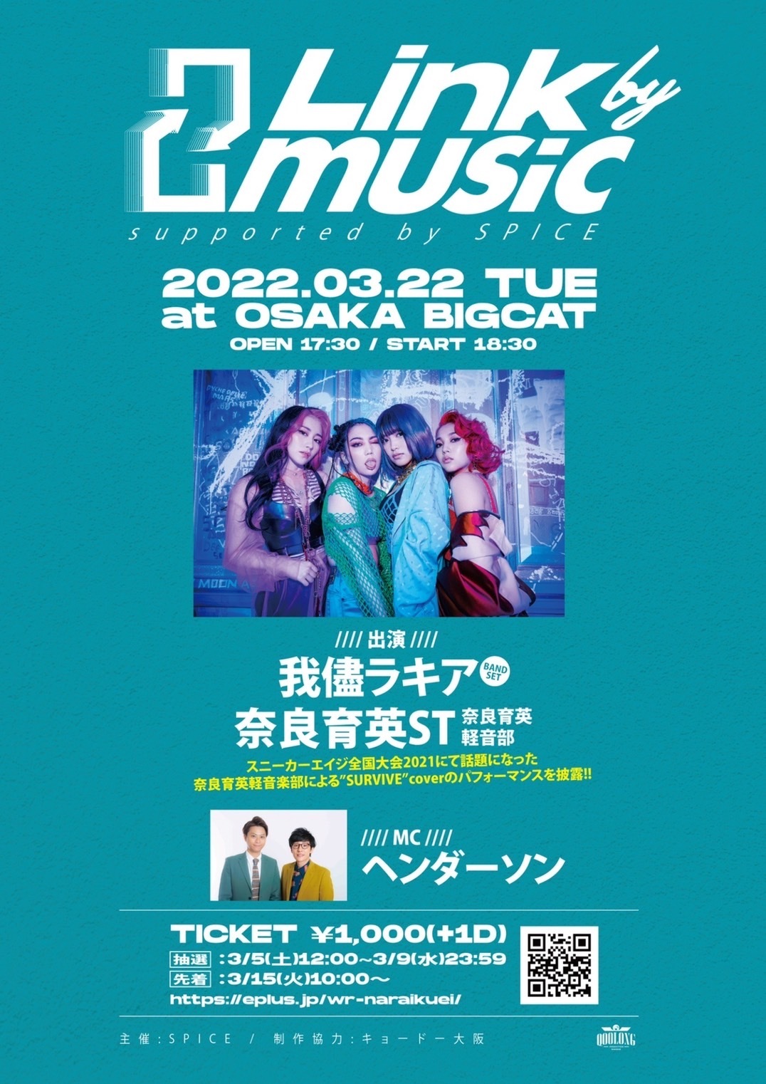 3月22日(火)大阪BIG CATにて開催されるSPICE主催イベント『Link by music supported by SPICE』、本イベントはSPICEがPOWER PUSHする日本一カッコいいアイドル我儘ラキアと、昨年の全国高校軽音楽部大会・スニーカーエイジで関西代表として、我儘ラキアの楽曲「SURVIVE」で大阪府知事賞を受賞した奈良育英高等学校の軽音楽部が、実際に共演を果たすということで話題を呼んでいる。