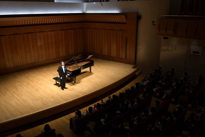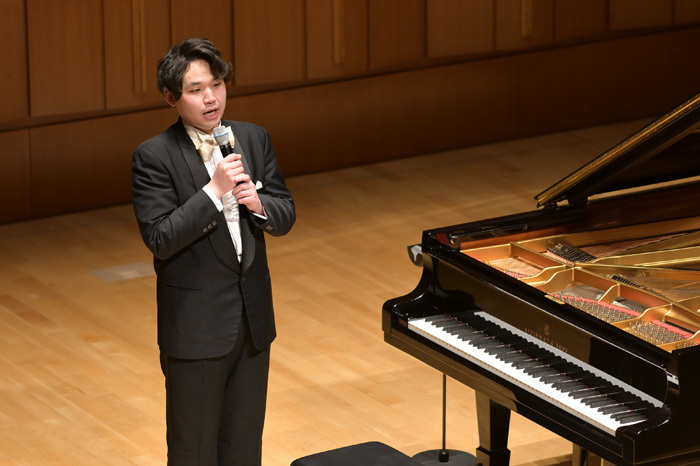 終曲を弾き終え、満場の拍手に迎えられる髙木。幾度となく丁寧なお辞儀で応えると、マイクを持って客席に挨拶。