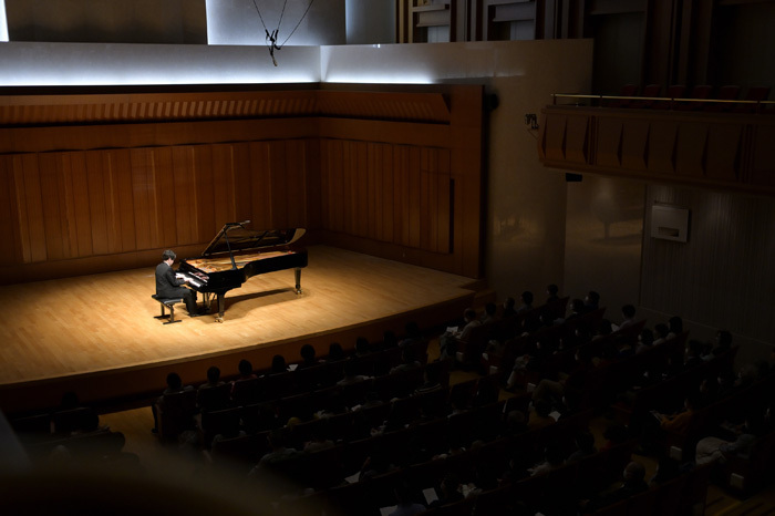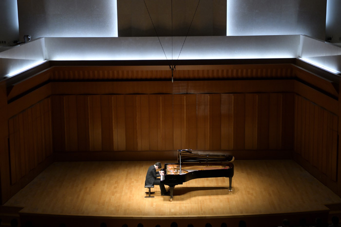 本日の演奏曲目の第一曲目はショパン 24の前奏曲 作品28より 第15番「雨だれ」。お馴染みのこの曲もピアニスト髙木竜馬の手にかかると冒頭から深淵なる世界へと誘われる。髙木自身、事前のインタビューで「非日常的な時空間へと誘う “結界” にふさわしい一曲」と語っている。