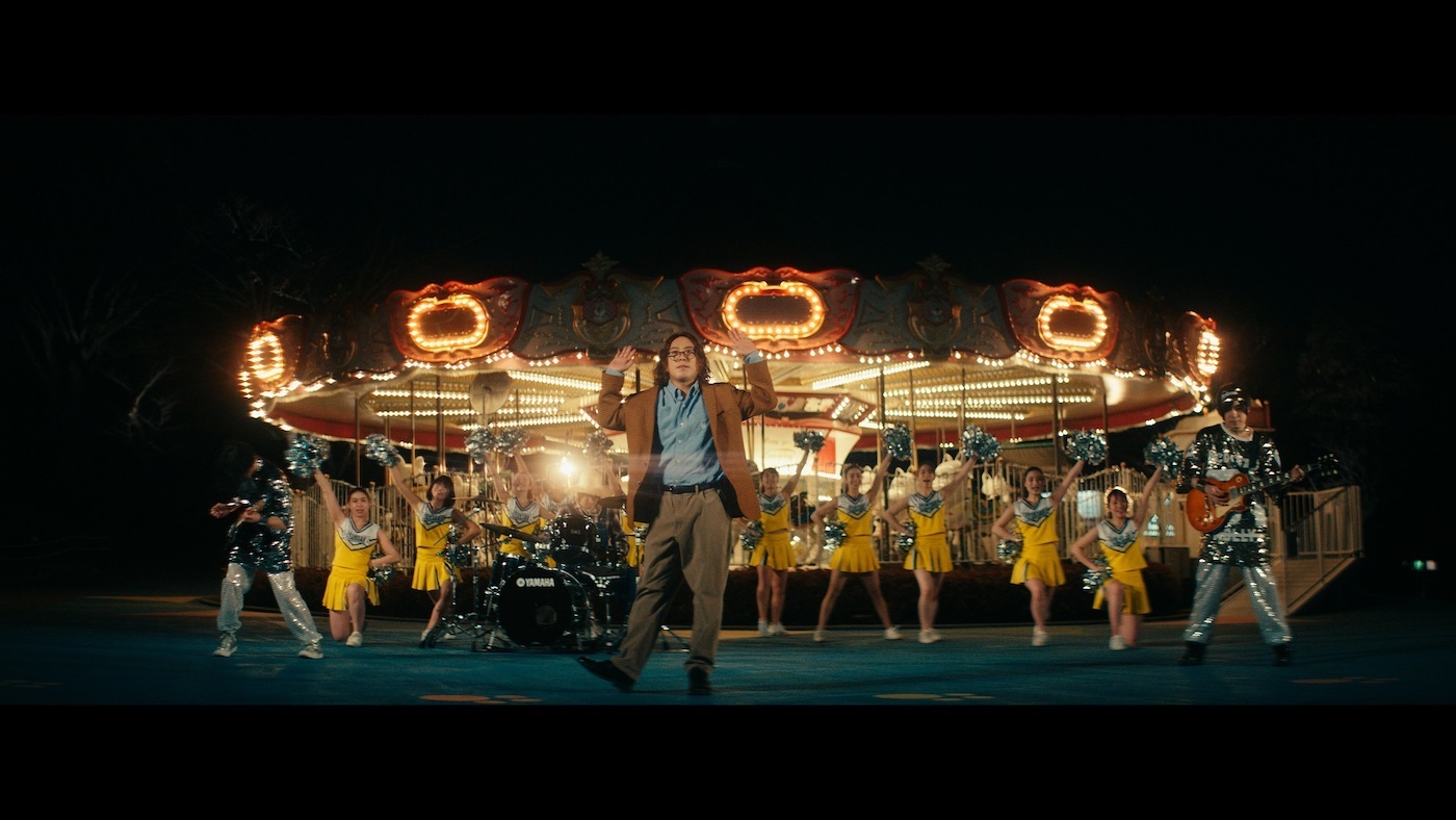 本日公開となったMVでは、コインランドリーやメリーゴーランドを舞台に、どこか奇妙な世界観の中でコミカルな衣装をまとった登場人物によるストーリーが展開され、夢と現実の境目を彷徨う主人公としてジャケット姿の谷口鮪(Vo/Gt)がぐるぐる回って、走って、踊る作品に。