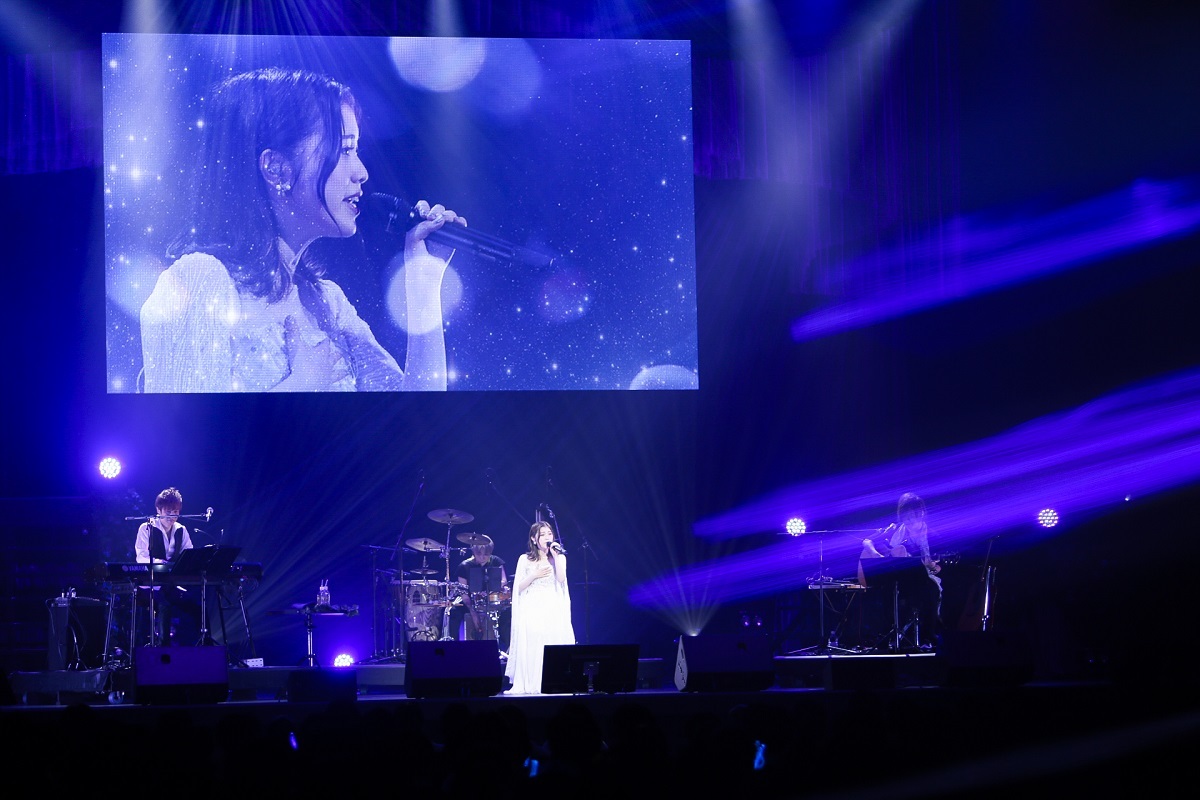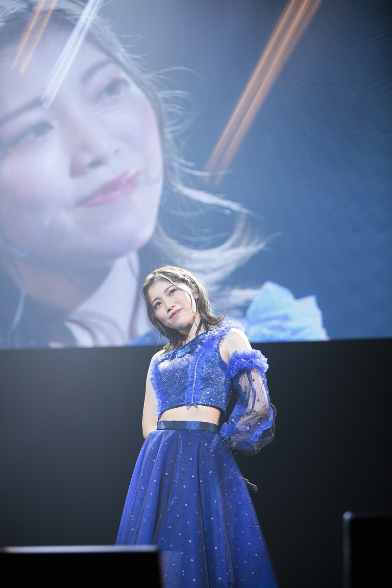 青のドレスに着替えた彼女が現れ「Page Flip」を披露。過去のライブ映像がフラッシュバックのようにいくつも流れ出る演出はやっぱり感慨深い気持ちにさせられる。「新しい1ページを増やせるように、アコースティックに初挑戦したり、スタッフの皆さんと試行錯誤しながら作ってみました。いつも元気な私も良いな!って思いつつも、こうしてしっとりと歌えるような年齢になったのか……と自分でもちょっとビックリしました(笑)」と公演も終盤戦に差し掛かったタイミングでこれまでのライブを振り返った。