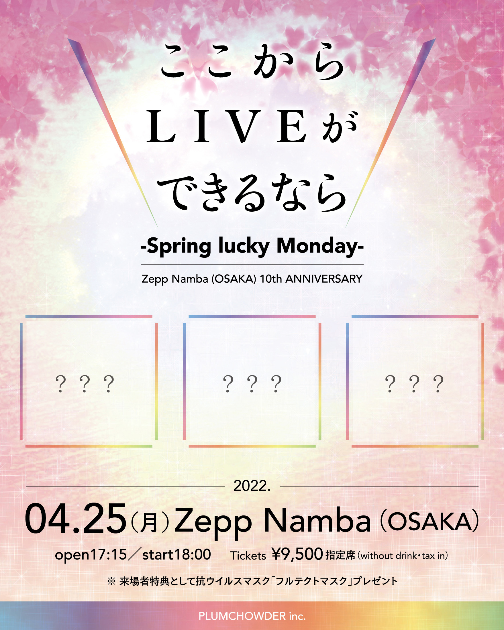 「ロックロックこんにちは!」や「そこから奏でまSHOW!」などエンターテイメント要素満載のライブ企画制作を行なってきたPLUMCHOWDERが、2022年4月に開館10周年を迎える、Zepp Namba(OSAKA)で春のスペシャルライブが開催決定。