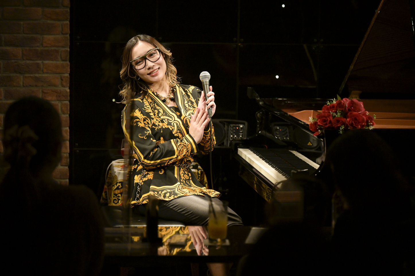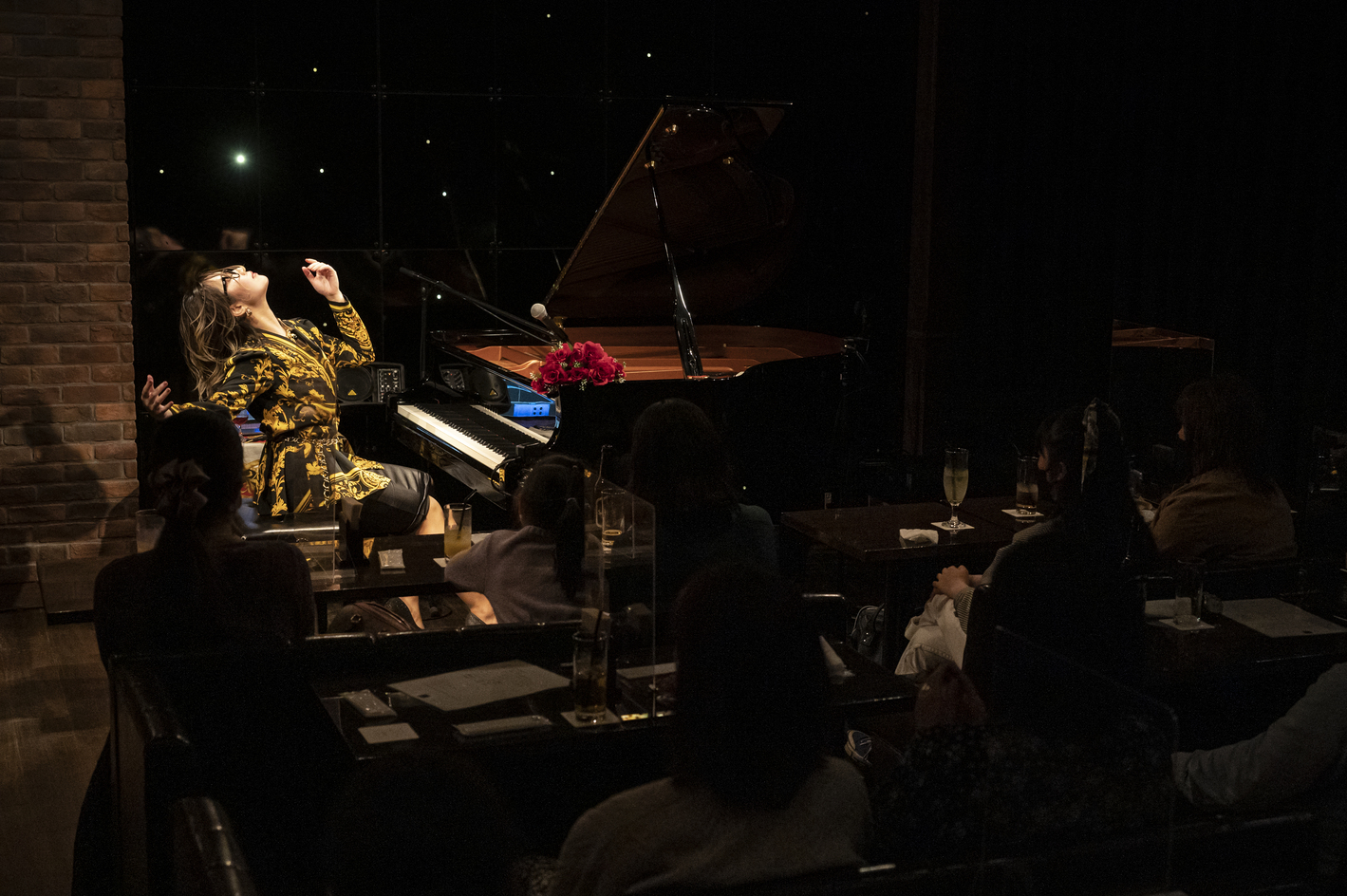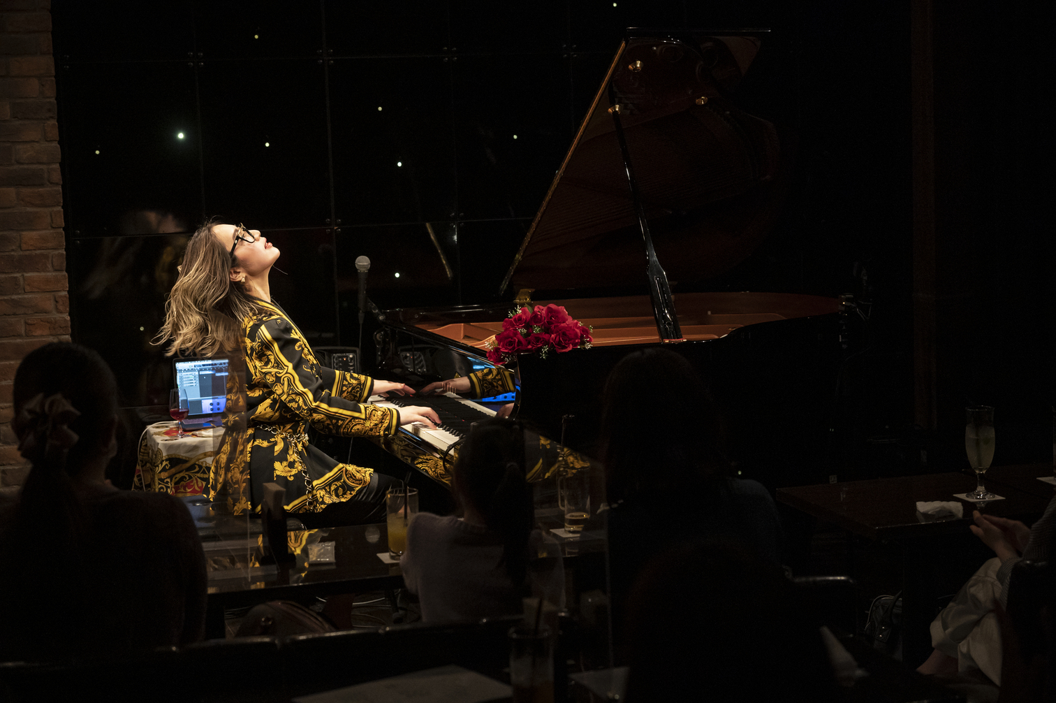 “ライブレストラン”として、ジャズコンサートなどで使用されているこのお店。ステージにグランドピアノが配置された大人の雰囲気漂う店内は、子供から年配の方まで幅広い客層で満員御礼。開演時間となり客席の照明が落ちると、おゴージャスな衣装に身を包んだ五条院凌が、一輪の真っ赤な薔薇を手に華麗にステージに登場。「みなさん、ご機嫌麗しゅう。五条院凌でございます、お拍手」と挨拶すると、どこか緊張している感のある観客に「麗しいピアノの音色にみなさま、ご存分に癒やされて下さいませ」と優しく言葉をかけ、1曲目「ARTEMIS ~美しきお月光に照らされ、君は何を想ふ~」の優しく美しいピアノの音色でコンサートが始まる。