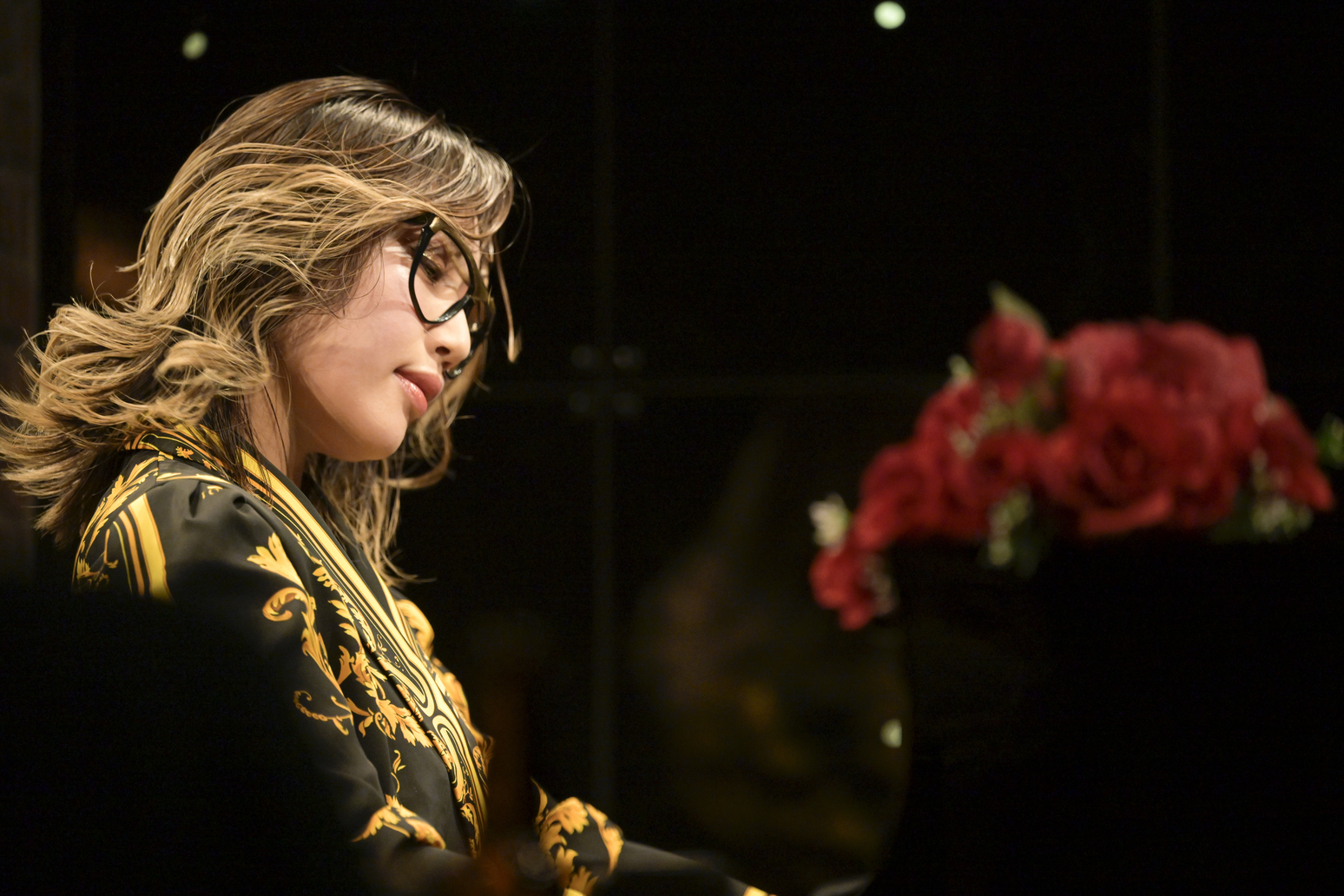 続いて、「私がYouTubeやTikTokに乗せてる曲で、SNSなどで大変人気の曲を続けて演奏させていただきます。おアゲな曲なので、お手拍子をお願いします」と紹介して披露した曲は、「六兆年とお一夜物語」、「おKING」。ハイテンポな今どきの流行り曲をクラシカルにテクニカルにアレンジし、気品や品格をまとわせた格調高いピアノアレンジは聴き応え抜群。「紅蓮のお弓矢」では勇ましい曲調に観客が興奮ぎみに手拍子を合わせ、パワフルな演奏にさらなる熱気が生まれる。ピアノで生み出すグルーヴに身体を揺らし、激しい曲調に髪を振り乱しながら、凛とした姿勢は決して崩さずに演奏する五条院の美しいパフォーマンスも見逃せない。