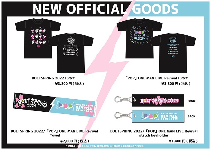 また、4月9日(土)に開催されるワンマンライブ『BOLTSPRING 2022 & 「POP」ONE MAN LIVE Revival』のグッズも発表となった。Tシャルやタオルのほか、キーホルダーなどもラインナップされるとのこと。ライブのチケットは両部ともsold outとなっている。