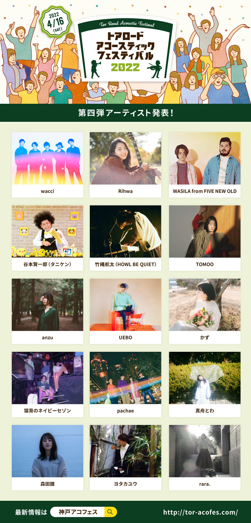 Kiss FM KOBEが主催するライブサーキットイベント『トアロード・アコースティック・フェスティバル2022』。4月16日(土)に開催する同イベントの第四弾出演アーティストが発表された。