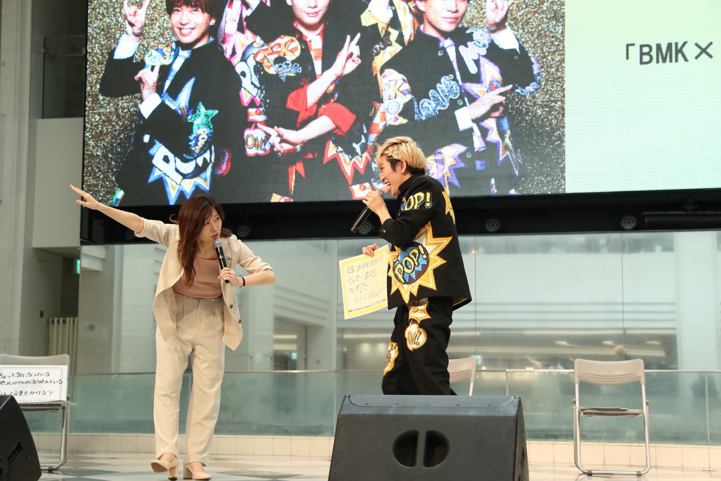 オープニングでは、BMKが単独でステージに上がり、本日発売の新曲「だって今日まで恋煩い」を生パフォーマンス。集まったファンからの手拍子を受けながら、コミカルでカワイイ歌と振付を披露した。