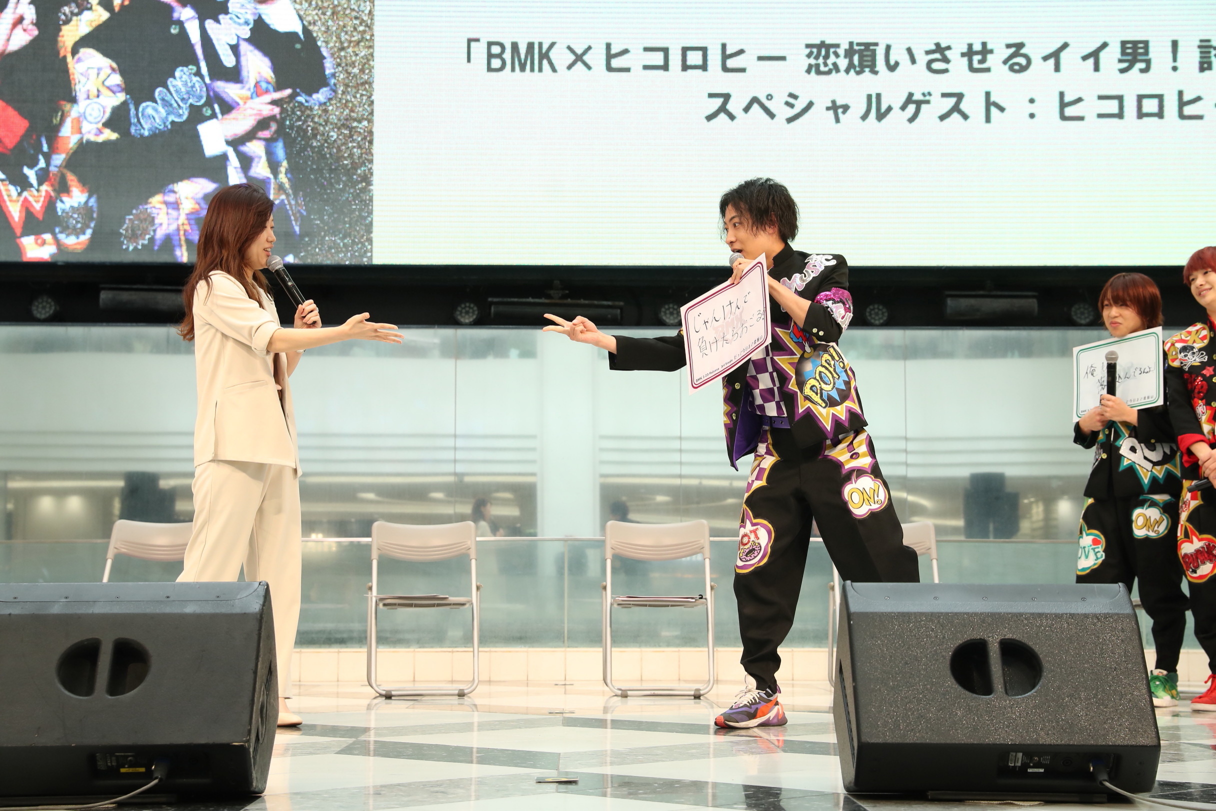 パフォーマンス後は、スペシャルゲスト・ヒコロヒーを呼び込みトークイベントがスタート。シングルタイトル「だって今日まで恋煩い」に掛けて、「BMK×ヒコロヒー 恋煩いさせるイイ男!討論会」と題した今回のイベント。お題に沿って「イイ男ならこう言うであろう」回答をするものの、BMKメンバーからは「イイ男」には程遠い珍回答続出で、ヒコロヒーから鋭いツッコミの嵐が吹き荒れることになる。