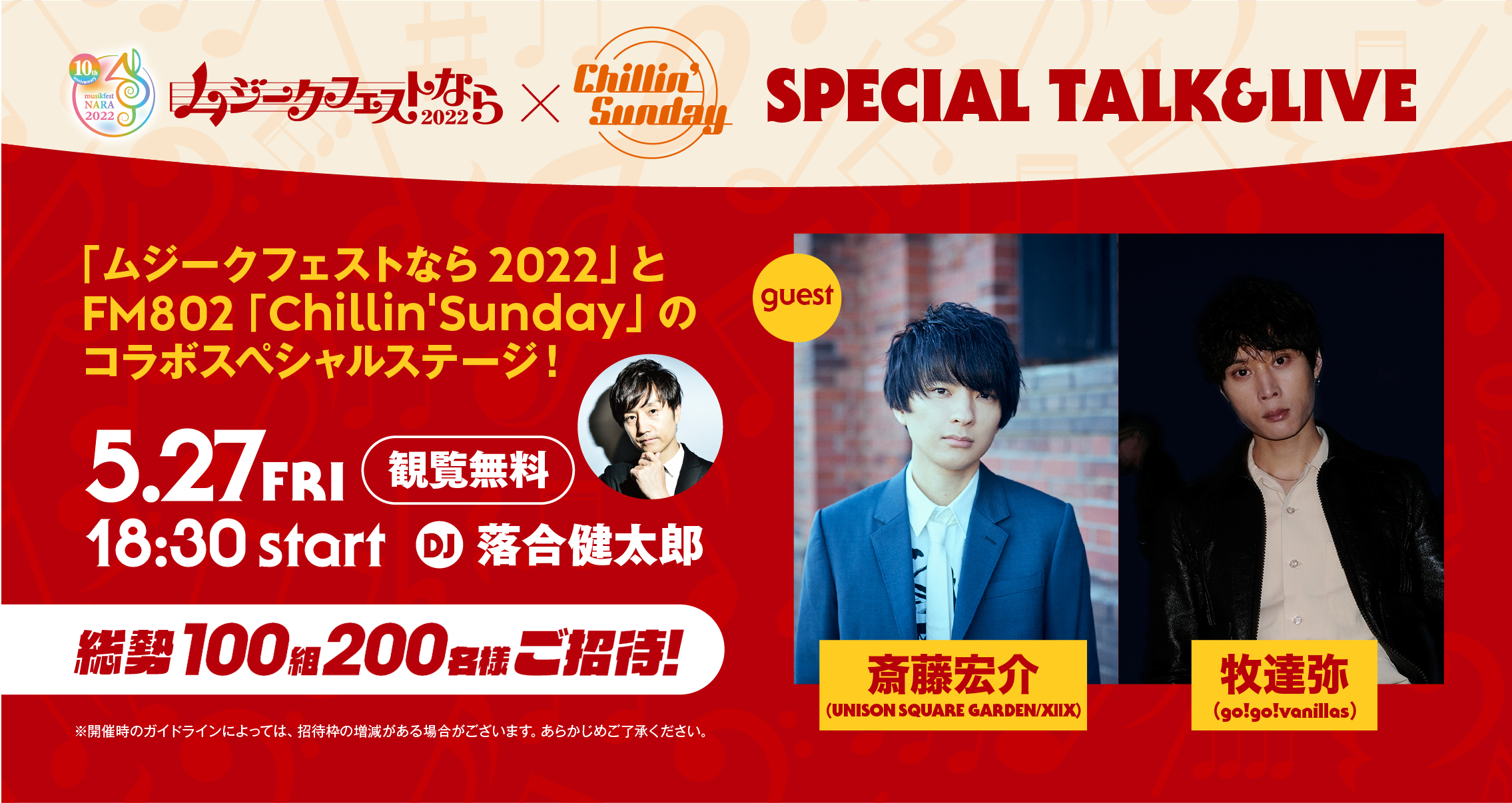 今回発表されたイベント『ムジークフェストなら2022×FM802「Chillin’Sunday」 SPECIAL TALK&LIVE』は、奈良の街中が音楽であふれるイベント『ムジークフェストなら2022』と、『Chillin’Sunday』のコラボにより実現した。ゲストは斎藤宏介と牧達弥の二組。観覧は無料で、本日から開始された受付にhて、100組200名が招待される。