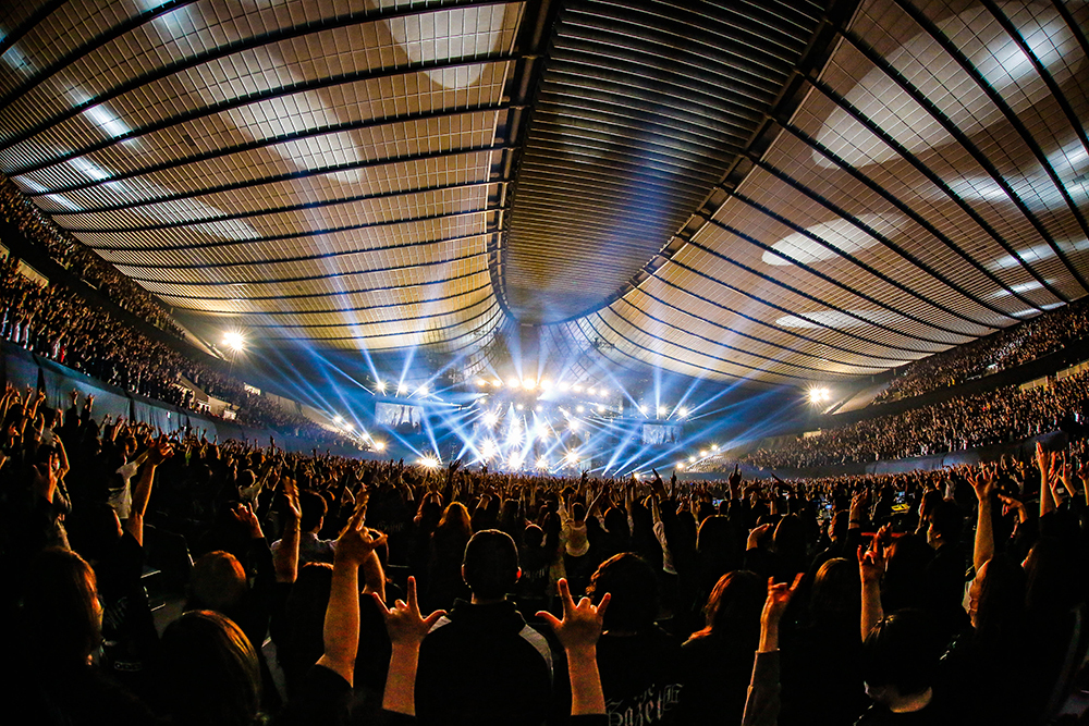 ファンとの絆を再確認し、そして20年間で培ったバンド力を爆発させた一夜の幕は、真紅のステージライトから伸びるレーザー光線で切って落とされた。RUKIの柔らかなウィスパーが一瞬で咆哮に変転し、打ちあがるファイヤーボールと共に始まった1曲目は「UNDYING」。凄まじいブラストビートに唸るような重低音とデスボイスが、広大なアリーナ空間に見えない亀裂を入れていくと、その傷を今度は流麗な旋律が優しく撫でてゆく。その繰り返しに頭を振り、腕を伸ばすオーディエンスの様は、まさに“UNDYING=不滅”。生々しく息づくリアルな“生”を感じさせる。続く「Filth in the beauty」で、みっちり二階席まで詰まった客席が一斉にジャンプする様も壮観。野太いユニゾンで不敵なムードを撒き散らす「DAWN」での盛り上がりはクライマックス級で、序盤3曲にして既に精気まで吸い尽くされそうだ。