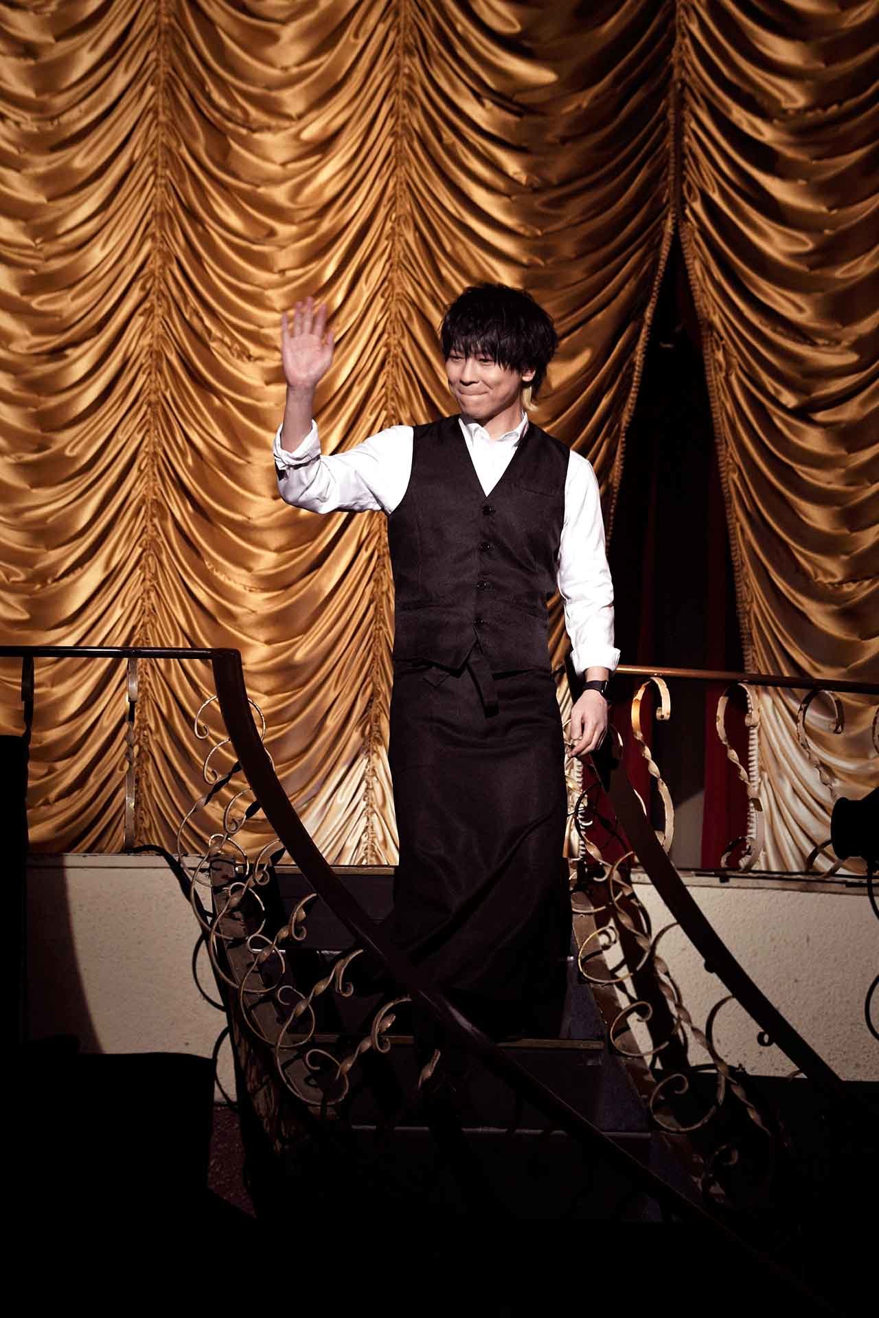 un:cのナレーションでカフェ・ド・ナナイロの開店が告げられ、ステージ下手から曲線階段でつながるサブステージにスポットライトが当たると、そこには白シャツと黒いバリスタエプロンが似合いすぎるun:cの姿が。