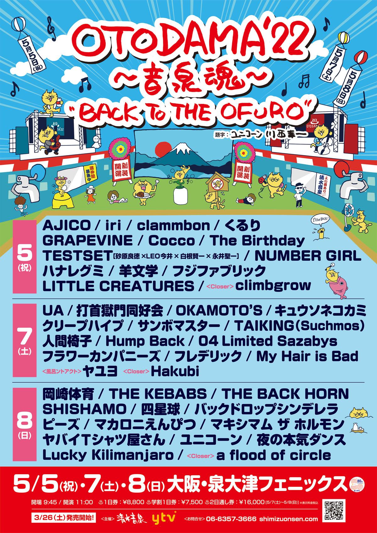 5月5日(祝)、7日(土)、8日(日)の3日間、大阪・泉大津フェニックスにて開催される『OTODAMA’22〜音泉魂〜”BACK TO THE OFURO”』の入浴順(出演順)が発表された。