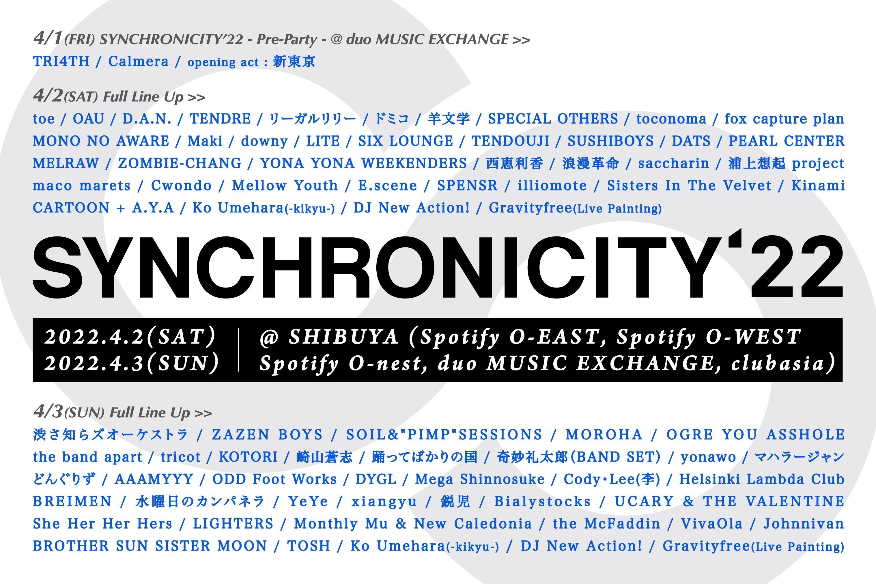 『SYNCHRONICITY』は、「CREATION FOR THE FUTURE」をテーマに渋谷のライブハウスを中心に、近隣の飲食店やショップも参加する地域一体型の都市型ミュージック&カルチャーフェスティバル。開催にはグリーン電力の使用やチケットレス化を進めるなど、サステナブルな意識を持ちながら「私たちの未来のためにできること」に取り組んでいる。2020年、2021年は新型コロナウイルスの影響により中止となり、2022年の4月1日(金)にTRI4TH、Calmera、新東京が出演のduo MUSIC EXCHANGEでの前夜祭を皮切りに、4月2日(土)〜4月3日(日)の本祭と3年ぶりの有観客開催を迎えることとなる。
