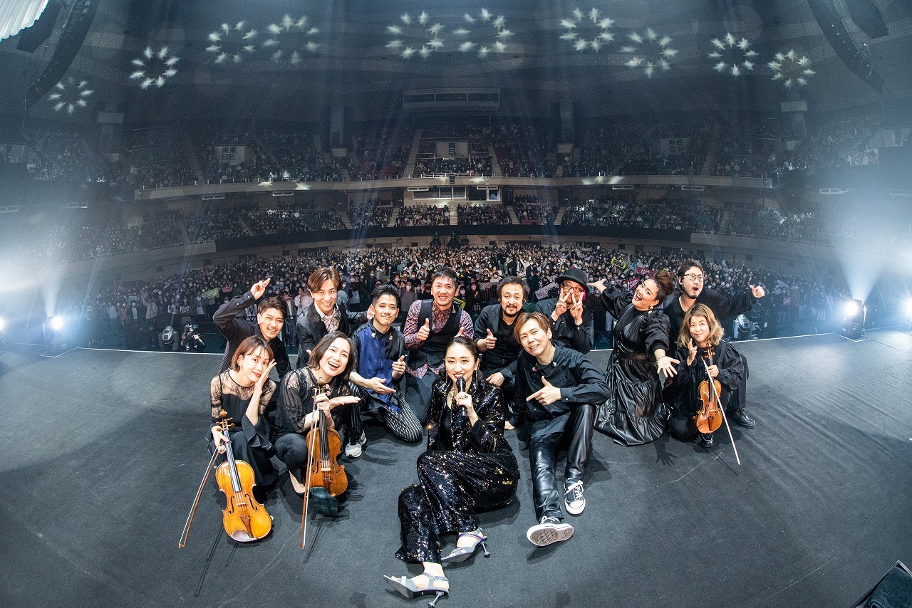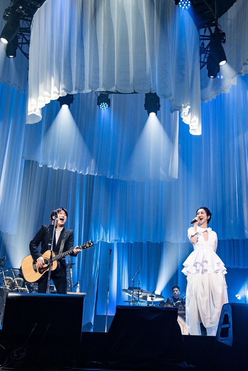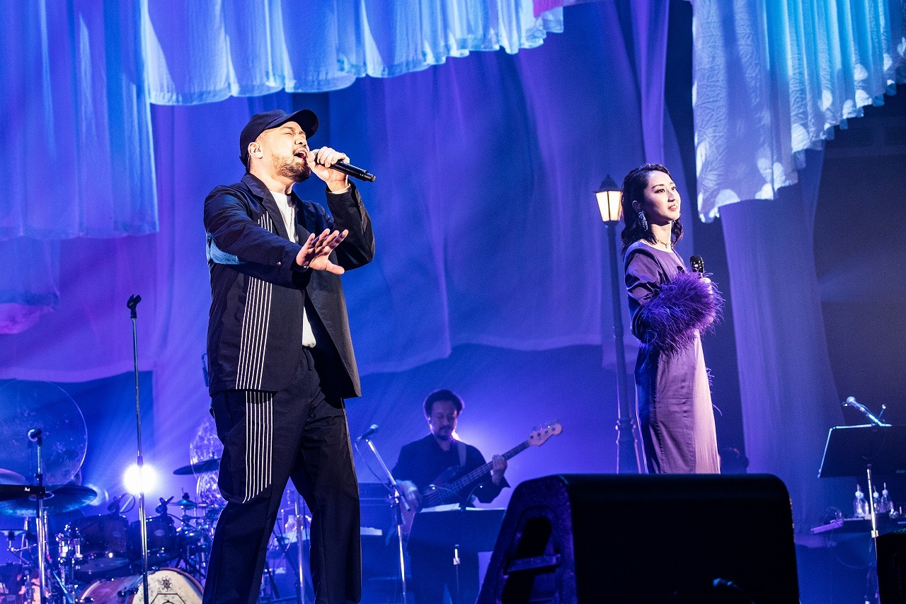 そしてスペシャルゲスト4名は、各セクションの要所に登場。最初のゲストはコブクロの小渕健太郎。アコースティックギターを抱えてステージに上がると、「10周年おめでとう!」と言ってMs.OOJAとグータッチ。小渕が2019年に彼女に提供した「WAY YOU ARE」をふたりで歌うと、一気に華やかに、賑やかに。中盤のカバーコーナーの最後には、彼女がフィーチャリング参加したJAY’EDとゴスペラーズの黒沢 薫が登場。JAY’EDとは、2014年にリリースされた『JAY’ED WORKS』に収録された人気デュエットナンバー「また君と」を歌い上げ、続けて黒沢と共に2015年の彼のソロデビュー10周年記念シングルに収録された「愛とは…」を熱唱。黒沢の抜けるような高音とMs.OOJAのハスキーな声が織りなすハーモニーは圧巻だ。そして終盤のオープニングには、地元名古屋で同じライブに出演していたときにレコード会社のスタッフに声をかけられたことが彼女のメジャーデビューのきっかけになったが、実はそのスタッフは彼を観に来ていたという、歌手になるきっかけを与えてくれた盟友、AK-69が登場。“いつか共演したい”というMs.OOJAの願いが10周年記念連続リリース企画の「I Remember You」で叶い、夢の武道館で共に向かい合うと、「やっとだね! 名古屋の誇り」とAK-69が声をかけた。