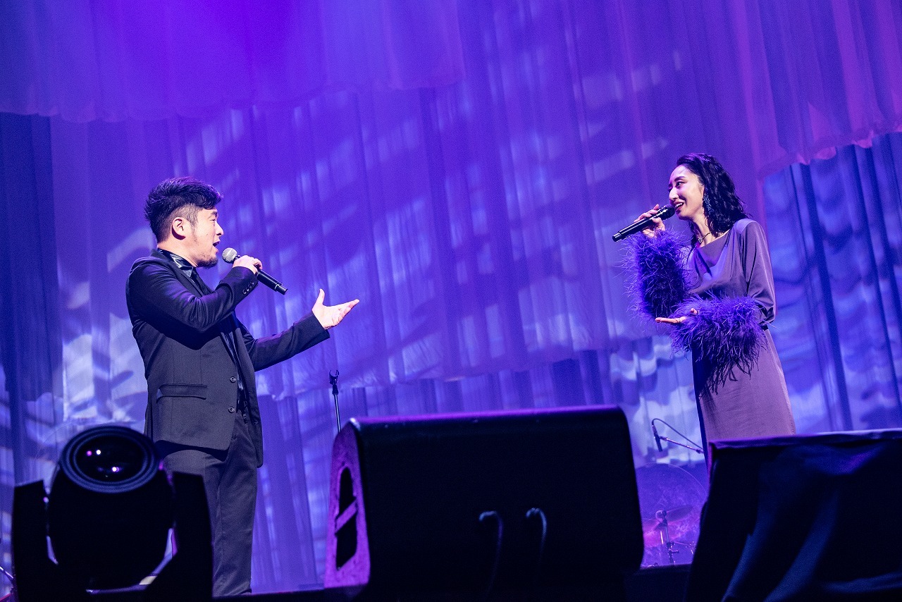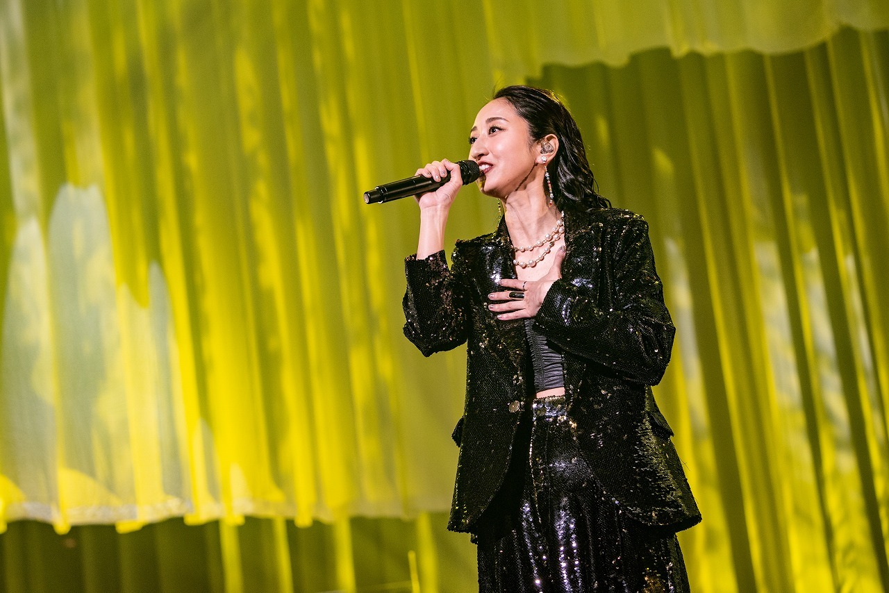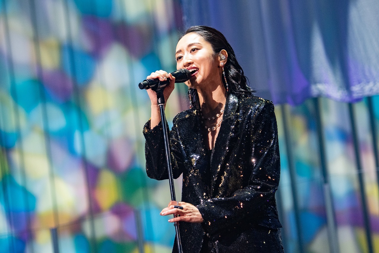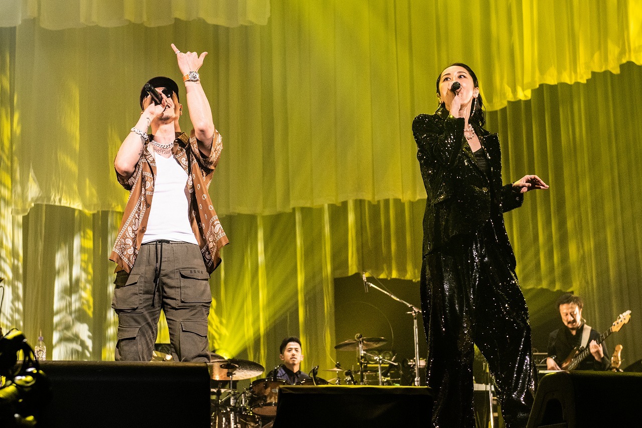 そしてスペシャルゲスト4名は、各セクションの要所に登場。最初のゲストはコブクロの小渕健太郎。アコースティックギターを抱えてステージに上がると、「10周年おめでとう!」と言ってMs.OOJAとグータッチ。小渕が2019年に彼女に提供した「WAY YOU ARE」をふたりで歌うと、一気に華やかに、賑やかに。中盤のカバーコーナーの最後には、彼女がフィーチャリング参加したJAY’EDとゴスペラーズの黒沢 薫が登場。JAY’EDとは、2014年にリリースされた『JAY’ED WORKS』に収録された人気デュエットナンバー「また君と」を歌い上げ、続けて黒沢と共に2015年の彼のソロデビュー10周年記念シングルに収録された「愛とは…」を熱唱。黒沢の抜けるような高音とMs.OOJAのハスキーな声が織りなすハーモニーは圧巻だ。そして終盤のオープニングには、地元名古屋で同じライブに出演していたときにレコード会社のスタッフに声をかけられたことが彼女のメジャーデビューのきっかけになったが、実はそのスタッフは彼を観に来ていたという、歌手になるきっかけを与えてくれた盟友、AK-69が登場。“いつか共演したい”というMs.OOJAの願いが10周年記念連続リリース企画の「I Remember You」で叶い、夢の武道館で共に向かい合うと、「やっとだね! 名古屋の誇り」とAK-69が声をかけた。