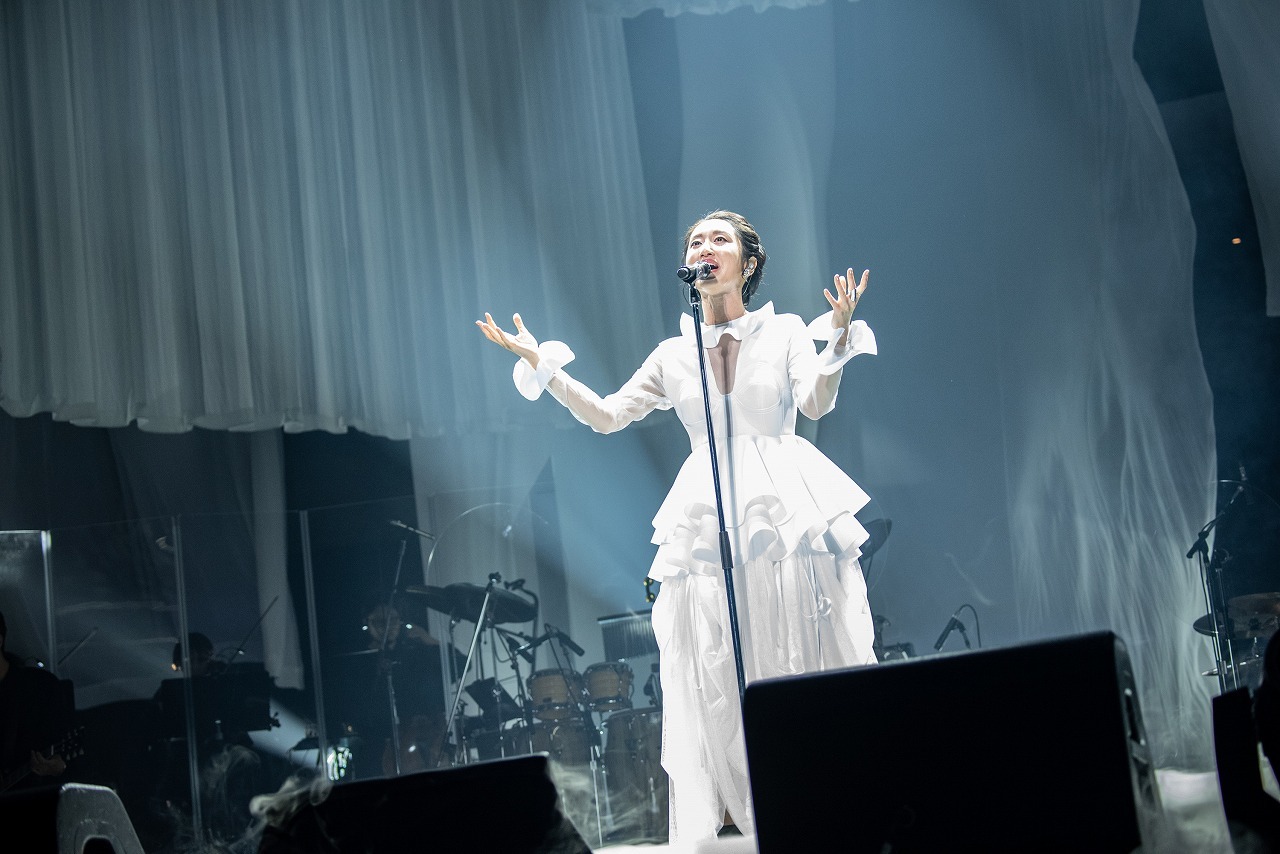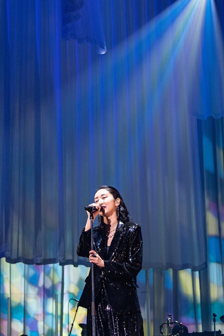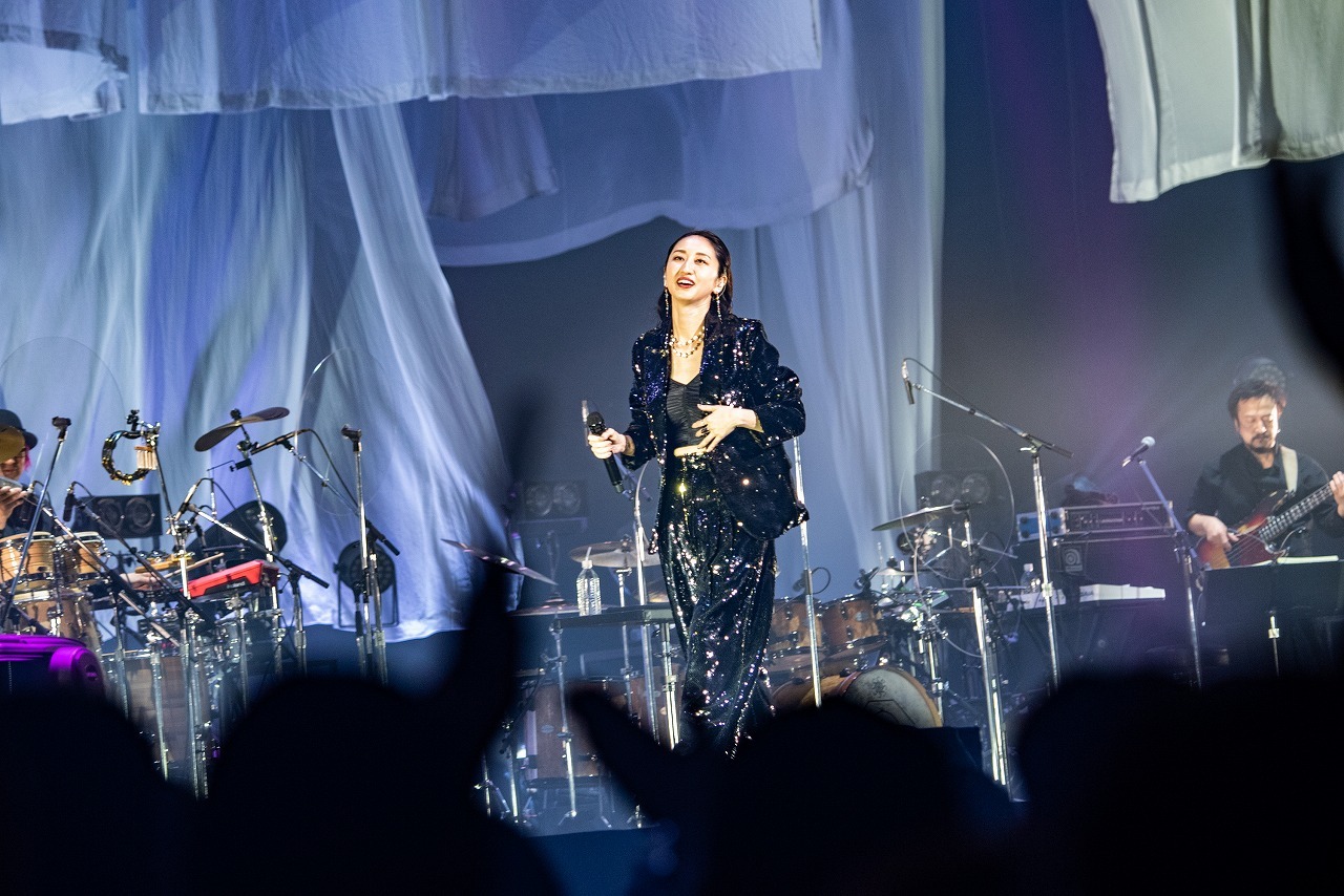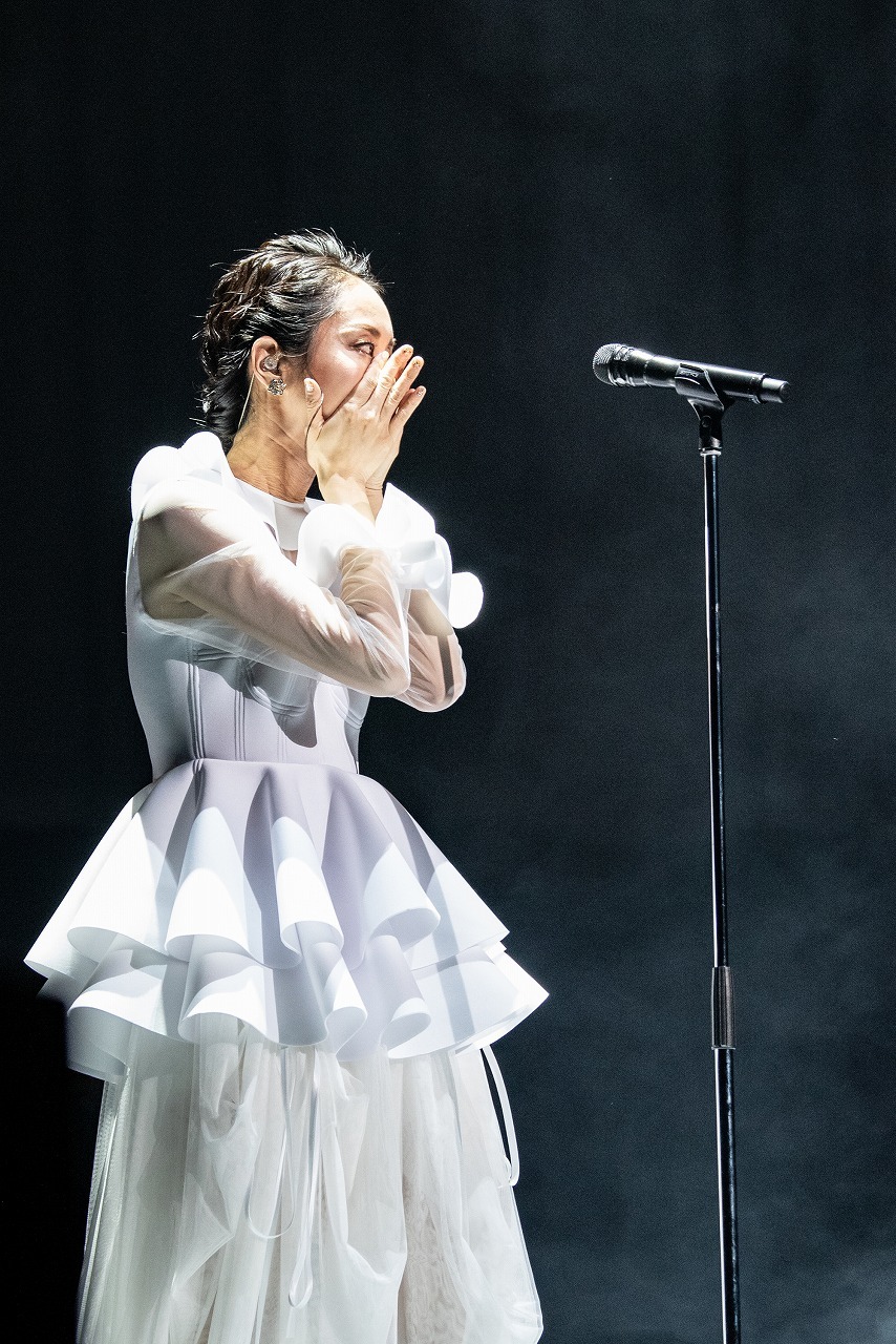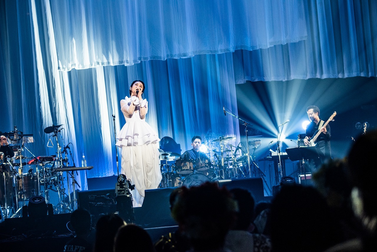 ドレープの寄った大きな白いプリーツの布が幾重にも折り重なったステージセットに、波の音が打ち寄せる。その音は徐々に深海へ……。そして海の底から、ステージ中央のプリーツのカーテンが上がると、白のドレスに身を包んだMs.OOJAが登場。武道館に向けての10周年記念13ヵ月連続リリース企画第1弾、そして本公演のタイトルにもなっている「はじまりの時」がオープニングナンバーに。武道館に響くMs.OOJAのアカペラ。その歌声に引き込まれたオーディエンスは、すぐに異変を感じた。逆光で表情は見えないが、鉄壁を誇る彼女の歌声が揺れていたのだ。それが涙声だとわかると、会場からは温かな拍手が沸き起こる。バンドが合流し、そのサウンドに支ええられた彼女は、客席を見渡して目を閉じる。ファンの手拍子の応援に「ありがとう」と言うと、ストリングスとコーラスが力強く後押しし、《もう迷わない》と歌うMs.OOJAの涙がスクリーンに映し出された。すべての人たちの万感の想いが伝わる美しい涙だった。2曲目以降は本調子。リズムに乗る伸びやかな声で、もう彼女の世界に引き込まれていった。