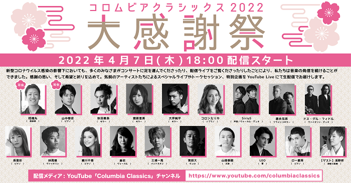 2022年4月7日(木)、日本コロムビア Columbia Classicsが公式YouTubeチャンネル生配信にて開催する『コロムビアクラシックス大感謝祭2022』。第2弾出演アーティストとして、ドス・デス・フィドル、林周雅、麻衣の3組が追加発表され、総勢18組のアーティストと総合司会として桂福丸氏の出演が決定した。