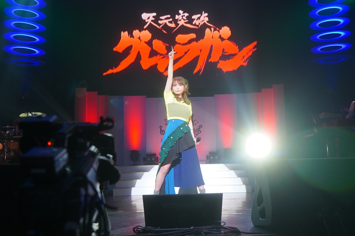 1曲目には、アニメの映像がバックスクリーンに映し出される中、「空色デイズ」(TVアニメ『天元突破グレンラガン』OP)を披露。観客が歌に合わせて高く拳を掲げれば、間奏では「みんなの右手を回して!回して!みんなのドリルで天を突け!」と力強く叫び、会場の螺旋力をどんどん高めていく。