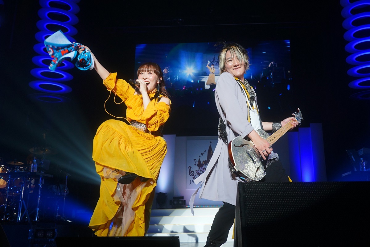 2曲の前では、スピリチュアルなことは普段信じないようにしている中でも、何かと様々なところで出くわすこともあり「運命を感じる」相手として、今回のMCのパートナーでもある緒方恵美をステージに呼び込んだ。そして二人で、作品の中で「兄と妹」を演じた『ダンガンロンパ』シリーズの楽曲から、「progressive-斬進-」(ゲーム『絶対絶望少女 ダンガンロンパ Another Episode』主題歌)をデュエットした。激しいロック曲に、間奏では頭を激しく振る緒方。最後は二人で背中合わせとなってキメポーズを取り、圧巻のパフォーマンスを締めくくった。