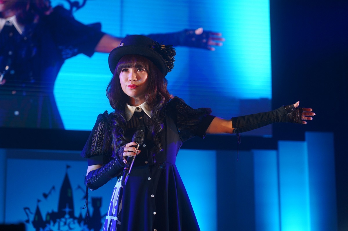 内田彩がステージを離れると、そのまま6番手として、メインMC・主催者の緒方恵美のソロステージへ。「ダンガンロンパメドレー」として「再生-rebuild-」(ゲーム『ダンガンロンパ 希望の学園と絶望の高校生』ED)、「断鎖 -break-」(ゲーム『ニューダンガンロンパV3 みんなのコロシアイ新学期』主題歌)の2曲を続けて披露した。曲の切り替わりの際にはステージ中央の階段を上り、背中を見せてスポットライトに照らされる姿は、まさに「ハンサムウーマン」。ゾクゾクするような低音ボイス、そして最後には手を高く挙げながら長めのロングトーンを響かせ、アーティスト・緒方恵美としての舞台を締めくくった。