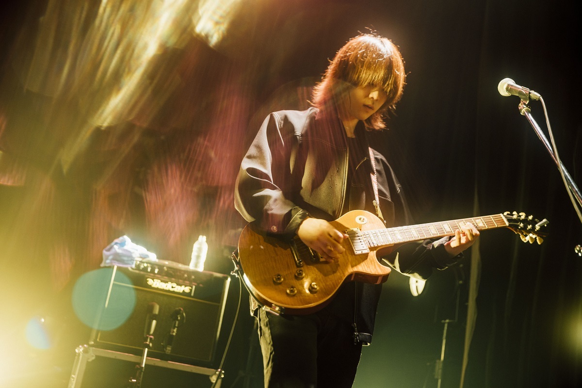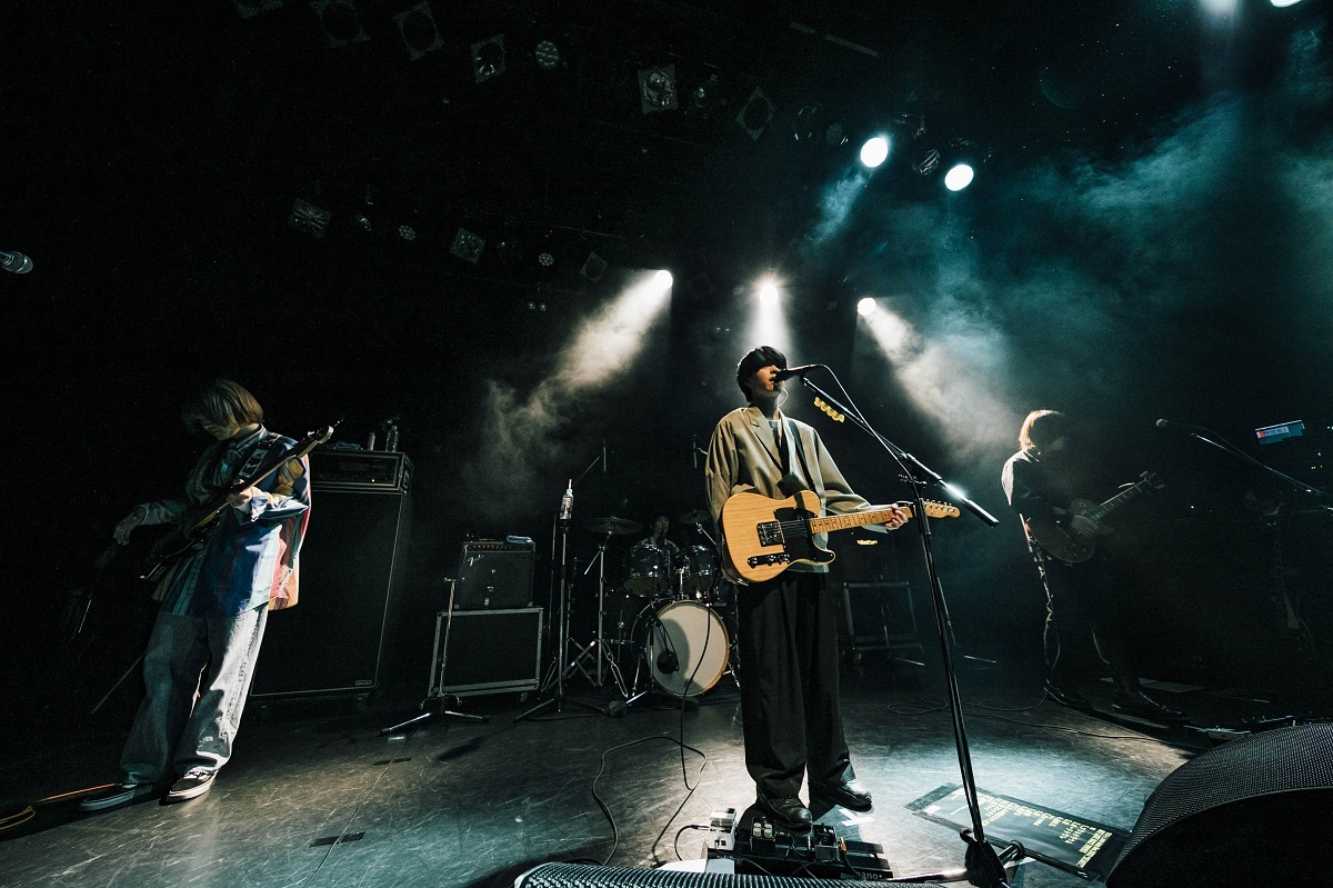 ボーカル&ギター、うきょうの元気のいい挨拶から始まった、1曲目は「プラネタリウム」だ。ミラーボールの光がまぶしく降り注ぐ下で、サポートドラマーを加えた4人の演奏はどこまでも小気味よくストレート。ベースのフジイタクミは笑顔を絶やさず体全体でグルーヴを表現し、ギターのおさみぃはクールなたたずまいと正確な指使いで色を添える。うきょうの独特のエアリーな歌声はライブでも変わらず、力強いバンドサウンドの中からくっきり浮かび上がって聴こえる。