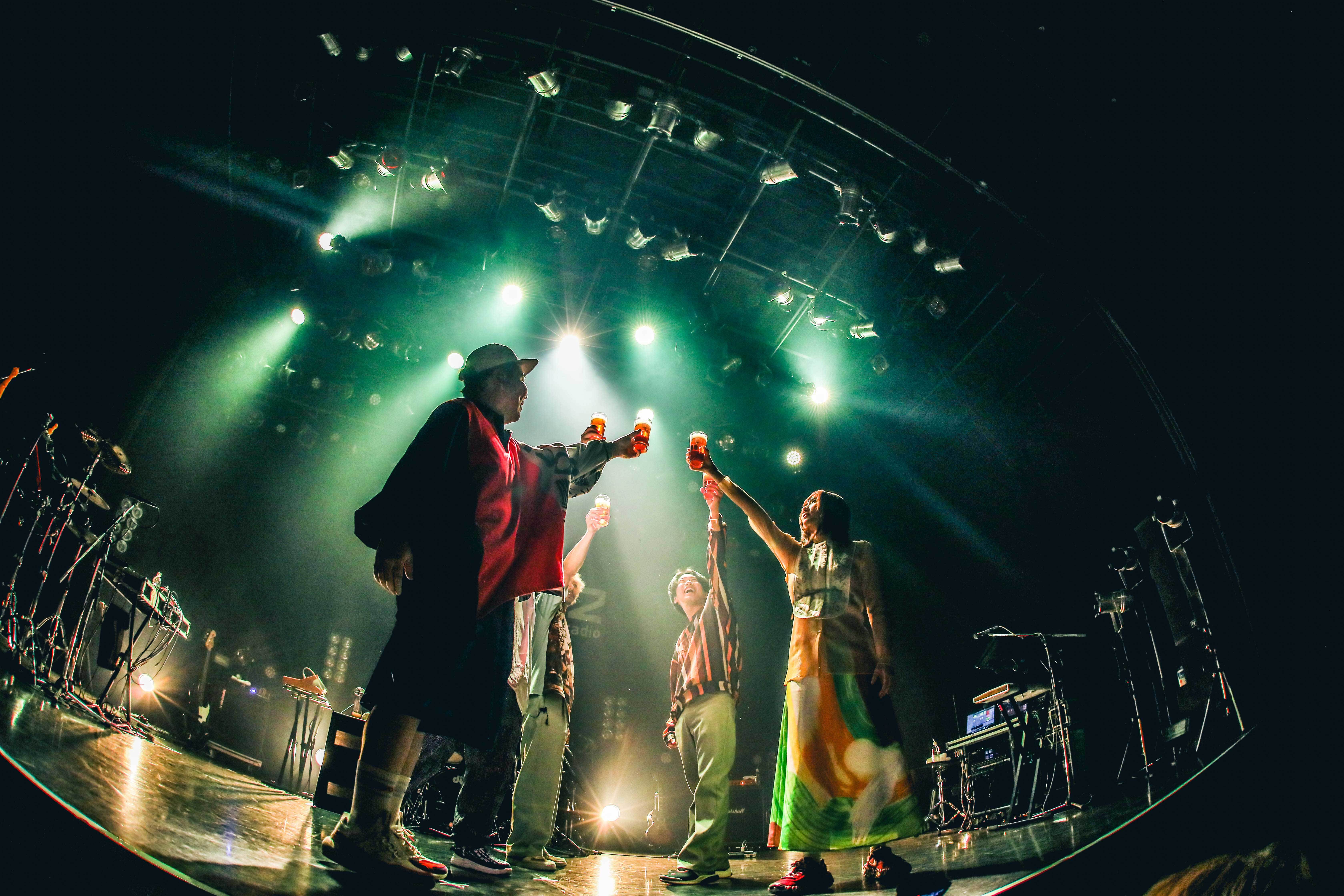 アンコールの拍手に応え、ビールを掲げたメンバーが中央に集結。「350ml Galaxy」の「ハッピーヒマラヤ」のリフレインが鳴れば乾杯の合図だ。会場のみんなも一斉にドリンクを掲げる。「ハッピーヒマラヤと申します」と熊木が遊び心たっぷりに登場すると、缶ビールを開ける音のSEが、宴が終わるさみしさを吹き飛ばしてくれるかのよう。そういえばコロナ禍のこの数年、一日の仕事を終えて家でビールを飲む瞬間が一番の癒しだった。もう長らく大勢でジョッキを鳴らして乾杯とかしてなかったなあ……なんて思いながら、<うまい酒がのみたい>というみんなの共通言語は無敵だとしみじみ思う。