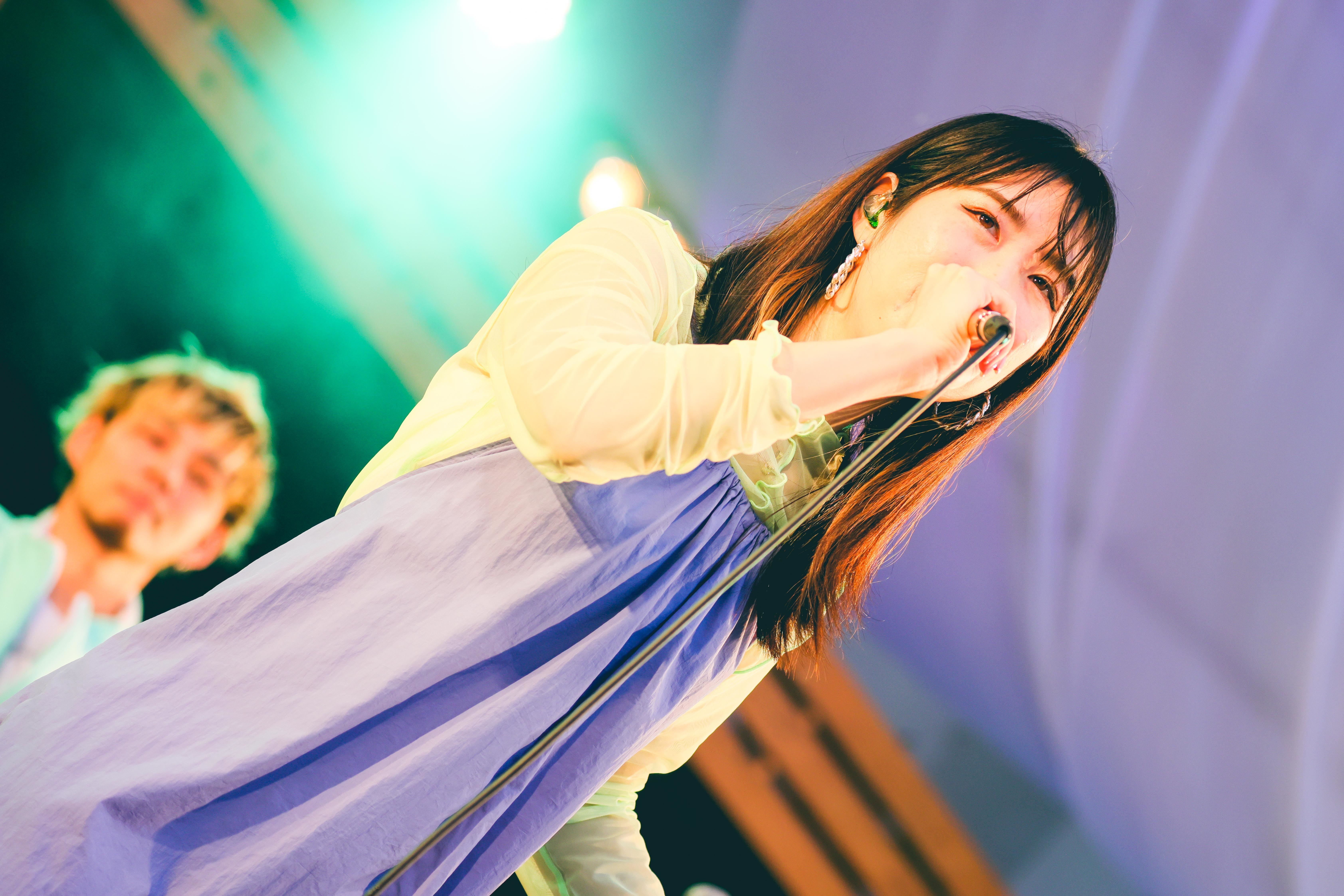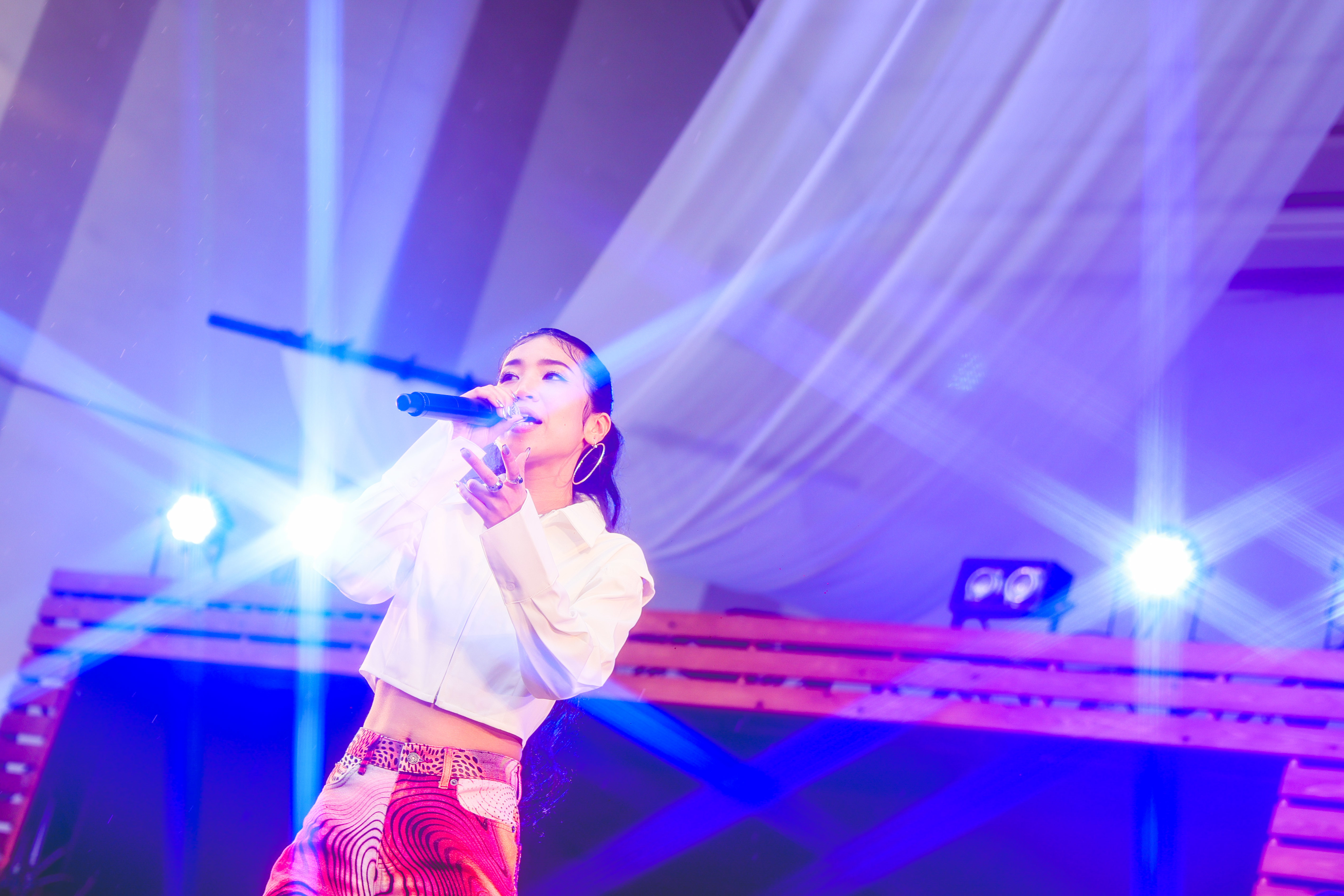 女の子ならではの心情を描いたリリック、オシャレなサウンド×耳がこそばゆくなりそうな柔らかな歌声の「80denier」。緩やかに紡がれるグルーヴに包まれると、花時雨に打たれるのも悪くないなと思えてしまうから不思議だ。まったりとした気分に浸っているところへ、「大阪の人は踊れるって聞いてるんですけど~?」と観客を煽り、nobodyknows+とのコラボレーションで話題となった「ココロオドル」へ。原曲のブチ上げ感とはまた違う、ふわっとしているのにアガり続ける絶妙なアレンジで観客を躍らせると、「雨すら気持ちいいくらい最高!」と声を上げ、ラスト「Lazy」まで観客をしっかりと自身の世界観へとアジテートしていった。