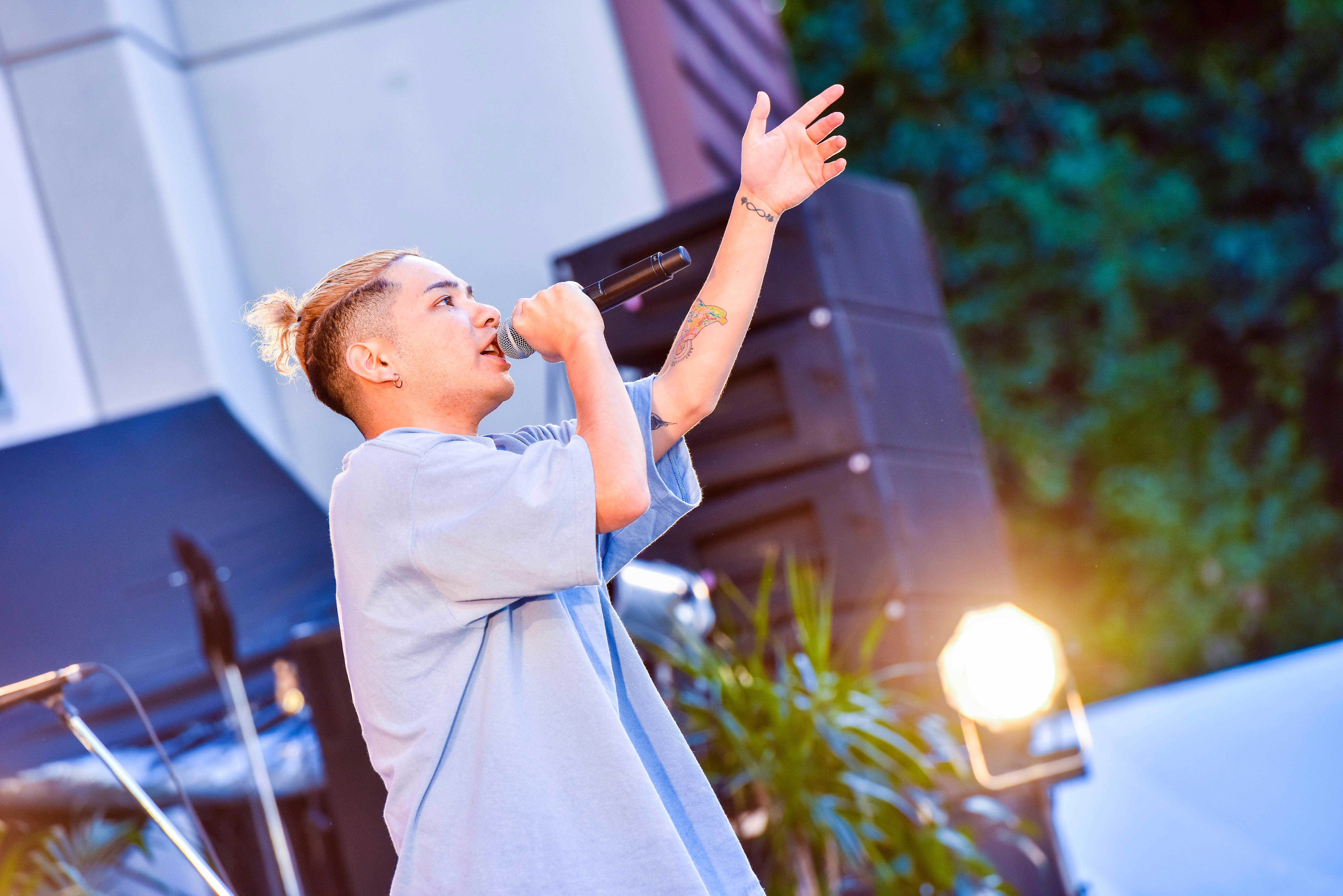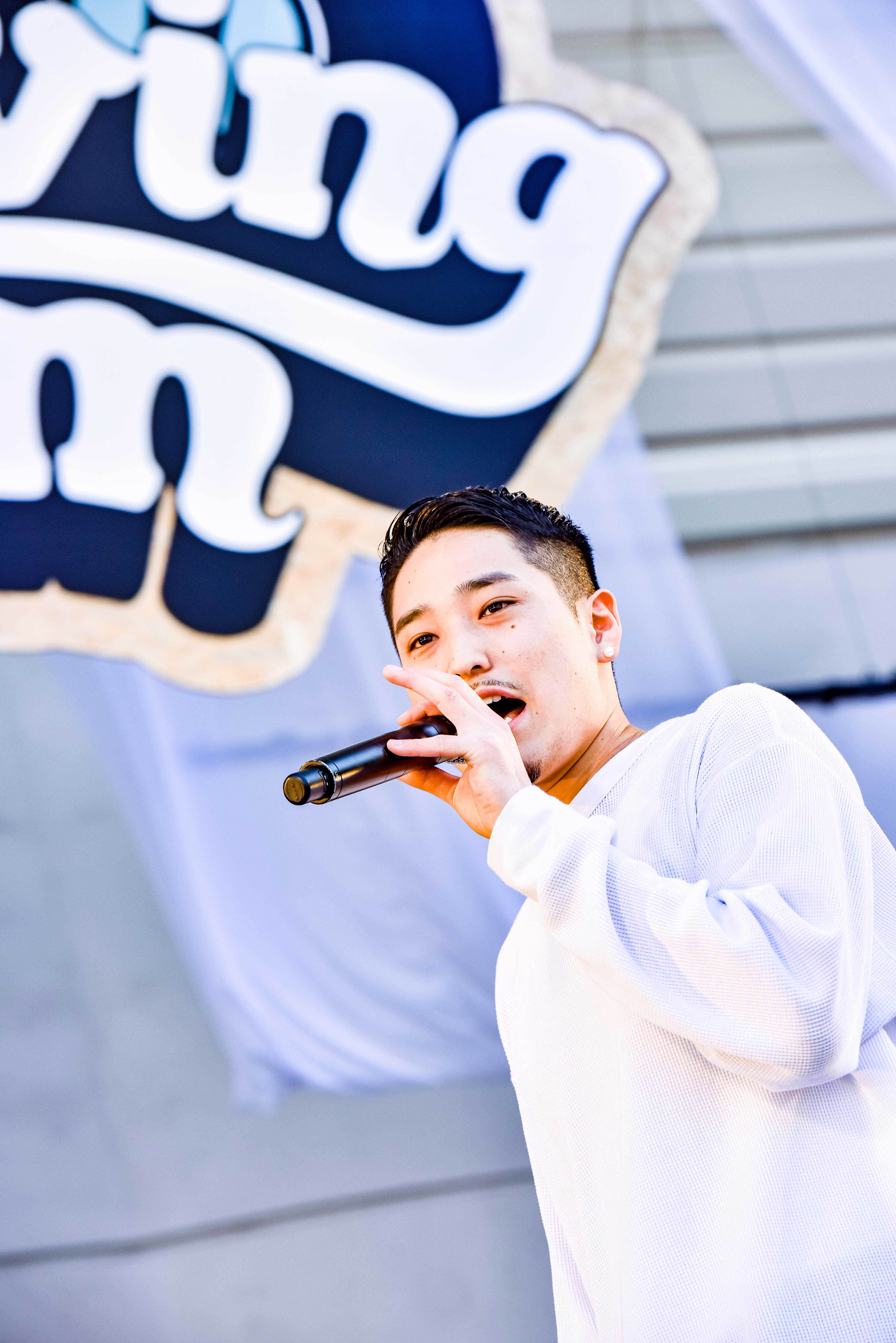 「ホントに音楽好きだな、お前ら!」と、沖縄なまりの言葉で久しぶりの野外ライブにハイテンションで言葉をかける彼。尊敬する祖父からの「夢を諦めるな。叶えろ」という言葉を信じ、これからも音楽に、ヒップホップに活かされている自分自身を鼓舞していきたいと、「Happiness」「It’s only love」など心温まるナンバーを披露。ラストは地元沖縄の仲間と三線の音色とともに、沖縄への「想い」を形にした「うむい」を。フリースタイルで想いを詰め込んだステージ、観客からは温かな称賛の拍手が届けられた。