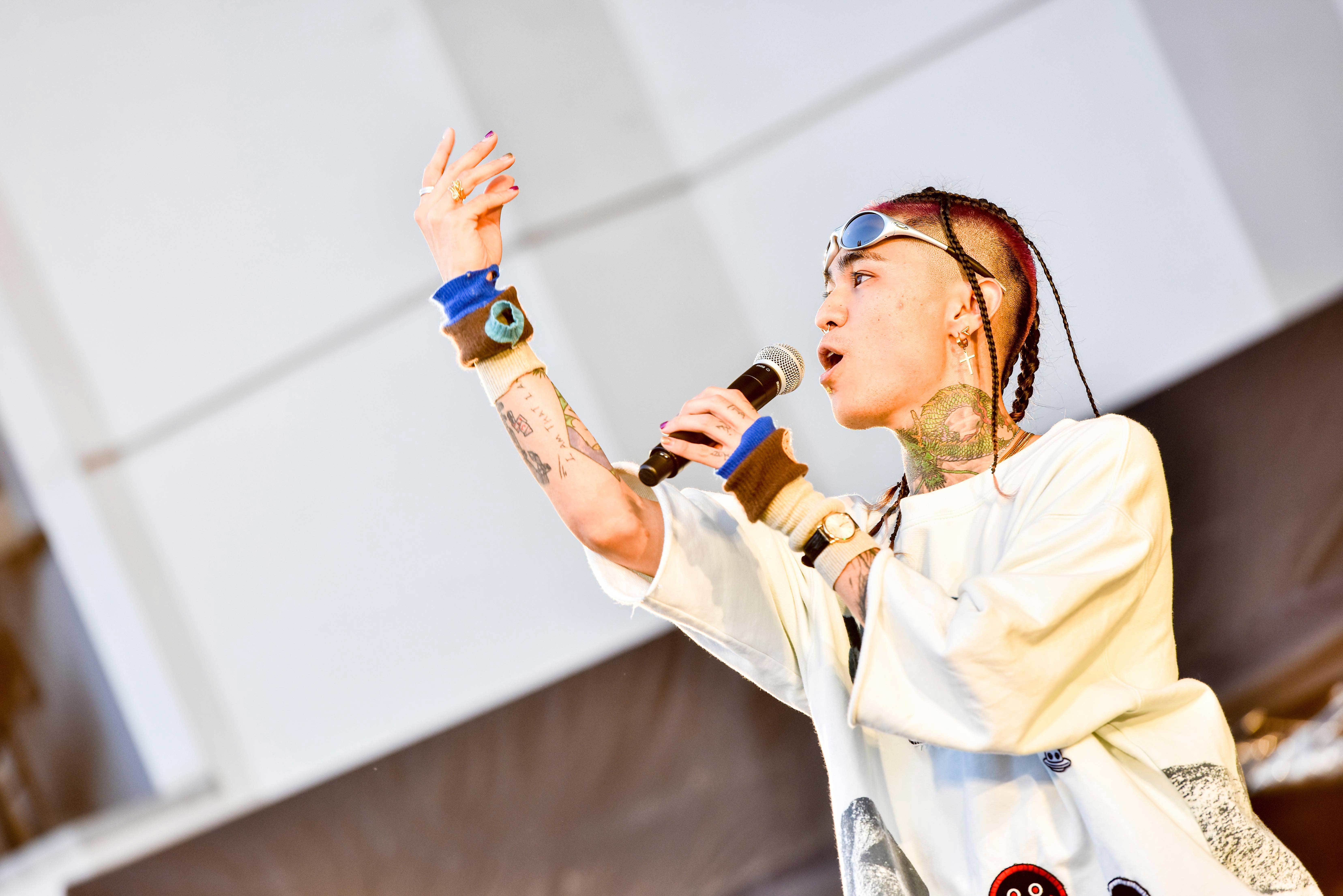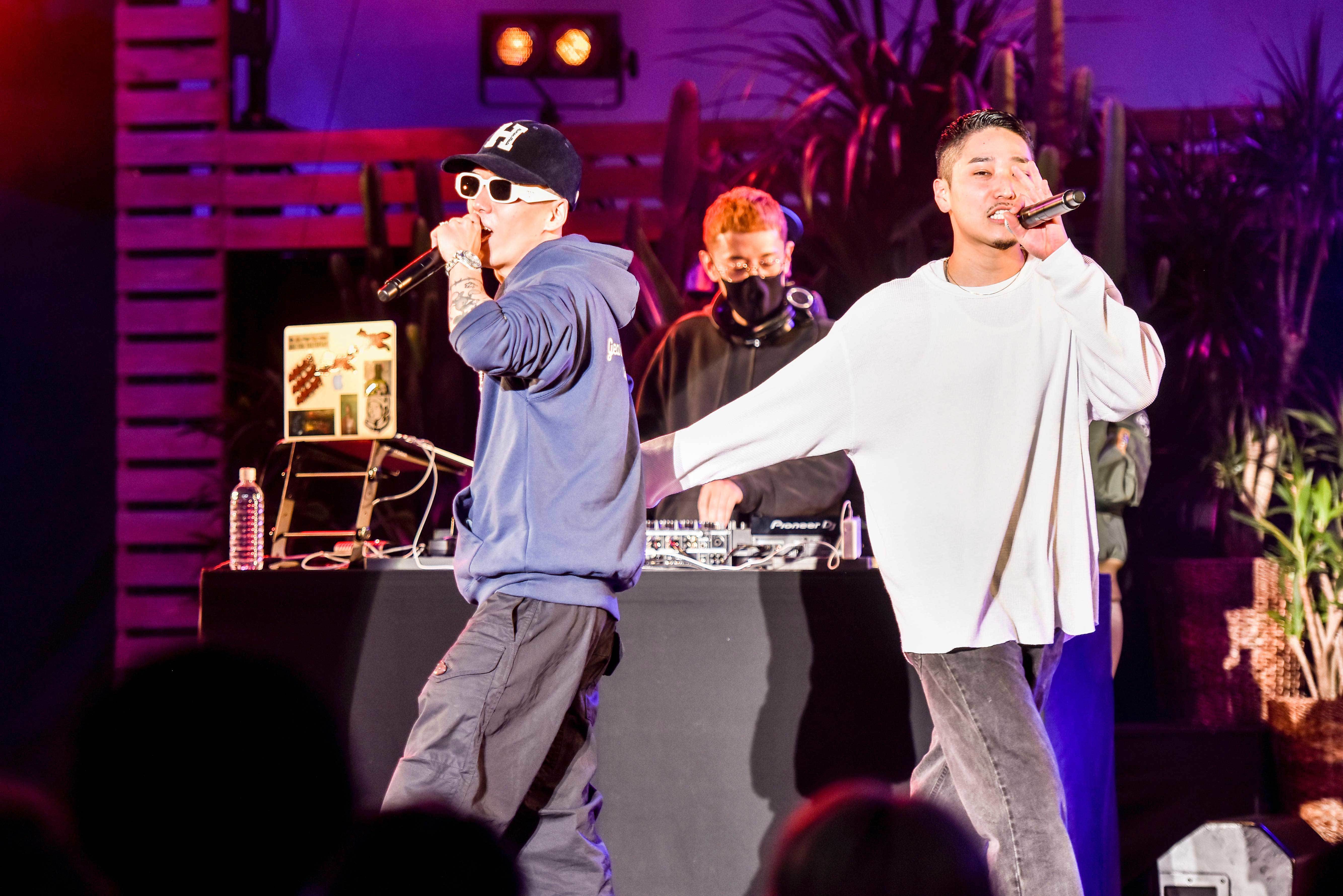 イベント中盤には同じく沖縄出身のラッパー・OZworldが登場。国内トップのアーティストはもちろん、海外アーティストとのコラボも実現させるなど、超異端な才能でシーンの核に迫りつつある彼。インパクト大のド派手なローブを羽織って姿を現すと、まずは手始めに「あさがたのミートパスタ教」でオーディエンスの反応をチェック。3月にリリースされたばかりの「Over Zenith」では観客の反応は上々ながらも、感染症対策の徹底のため歓声が出せない……。そこへ、観客のためにとDJが大歓声の効果音をエフェクトで入れ込むなど遊び心もプラス。