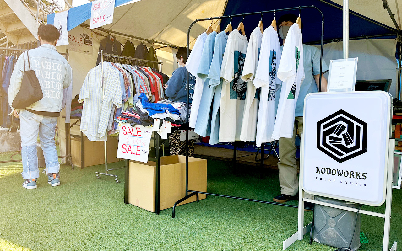 『Grooving Jam』では、ステージ転換の合間にも楽しめるグルメ、ファッションのブースを展開。リメイクブランド「HOWU」のブースではオリジナルブランドのほか、アメリカから仕入れた古着やリメイクアイテムを販売。ほかにも、西日本を中心に活動するプリントスタジオ「KODOWORK」はシルクスクリーン技術を使い、オーダーメイドでイベントオリジナルTシャツなどにその場でイラストをプリント。オリジナル感満載のアイテムはイベントの思い出にもなると、たくさんの観客が集まっていた。