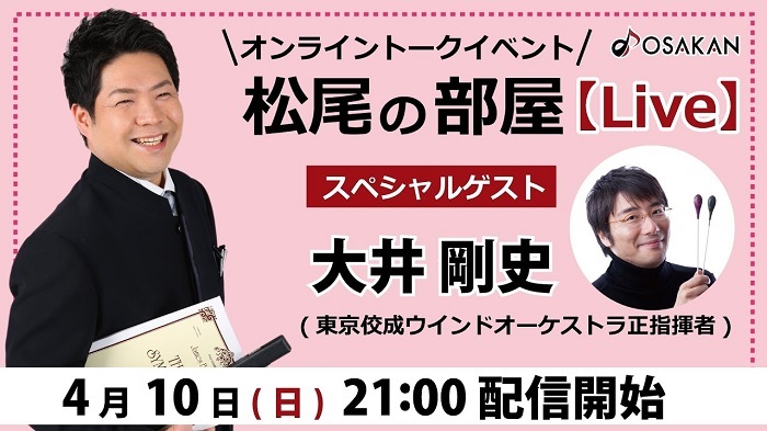 本コンサートは、フィルハーモニック・ウインズ大阪初となる全日本吹奏楽コンクール課題曲のみを取り上げる演奏会。この公演に先駆けて4月10日(日)21時から、指揮者の大井剛史をゲストに迎え、YouTubeでトーク番組をライブ配信することが決定した。