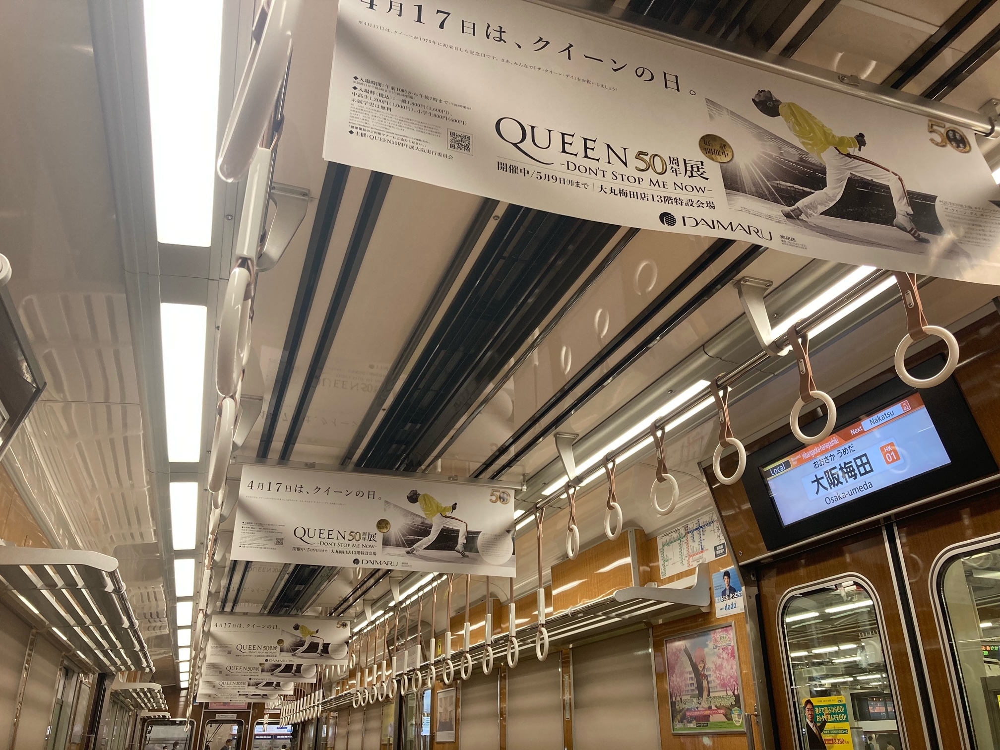 5月9日(月)まで大丸梅田店にて開催中の『QUEEN50周年展』が、クイーン初来日記念日「ザ・クイーン・デイ」にちなみ、4月15日(金)から購入者特典が進呈されるキャンペーンを実施する。あわせて4月11日(金)から、キャンペーンを告知する電車の吊広告がスタートした。