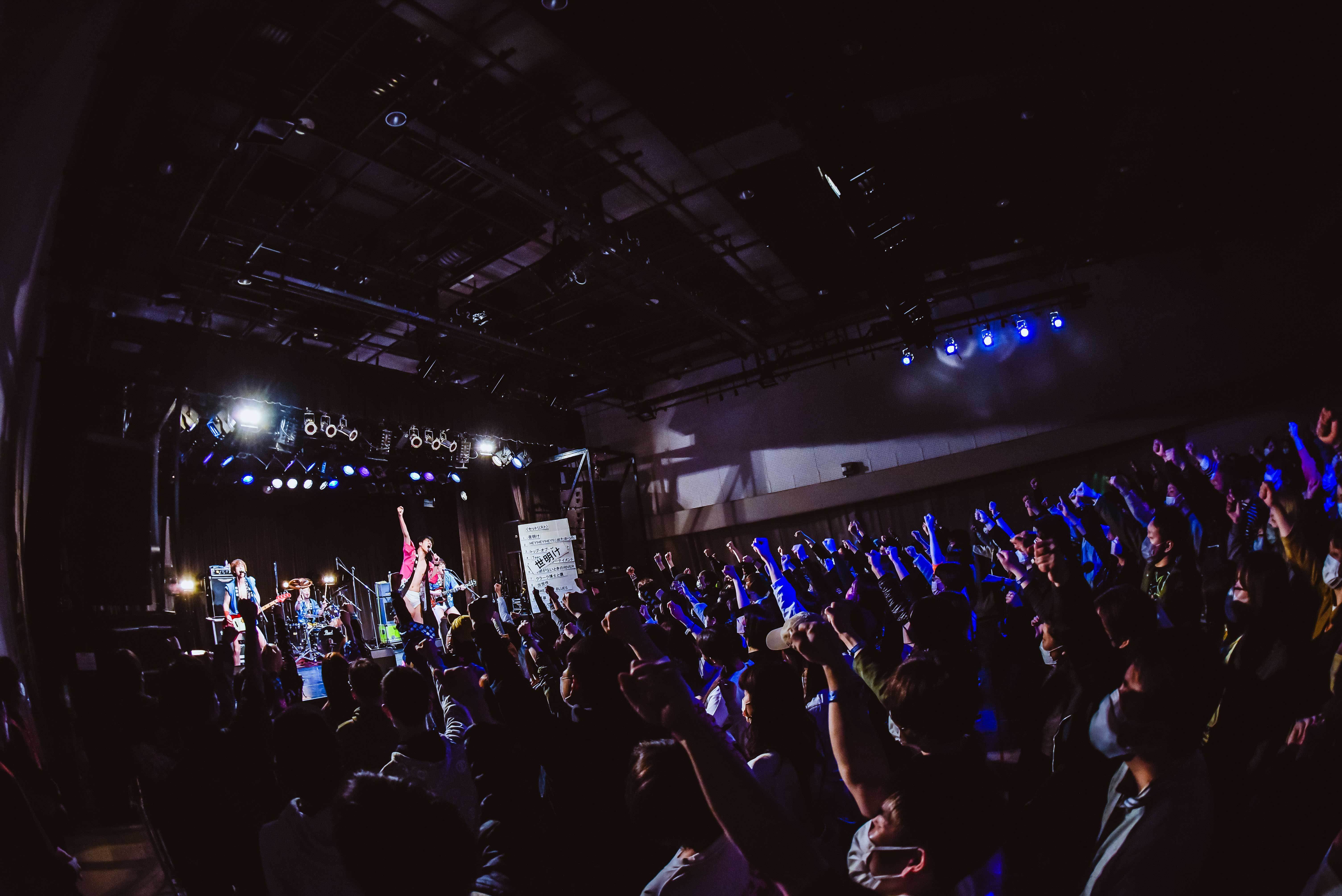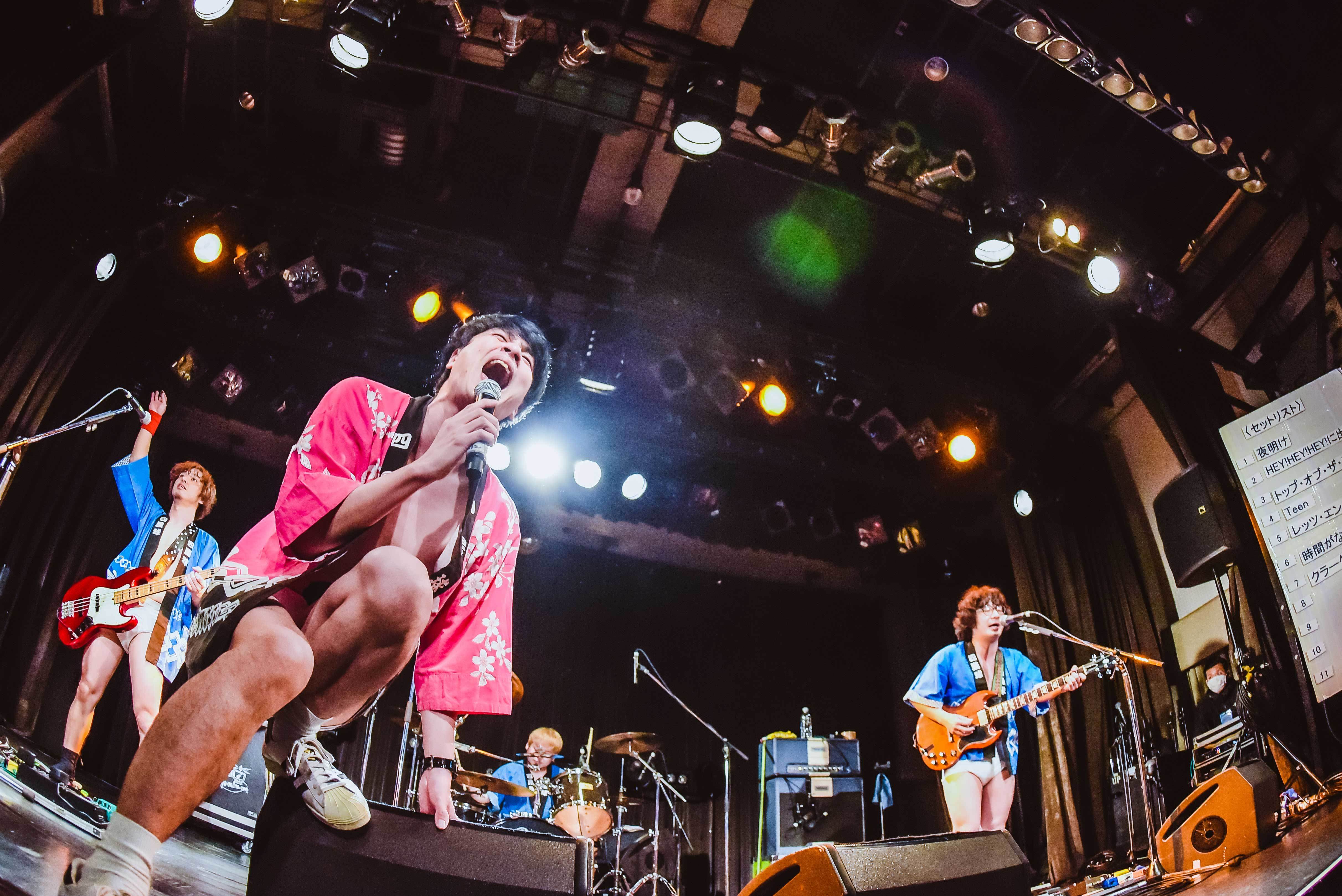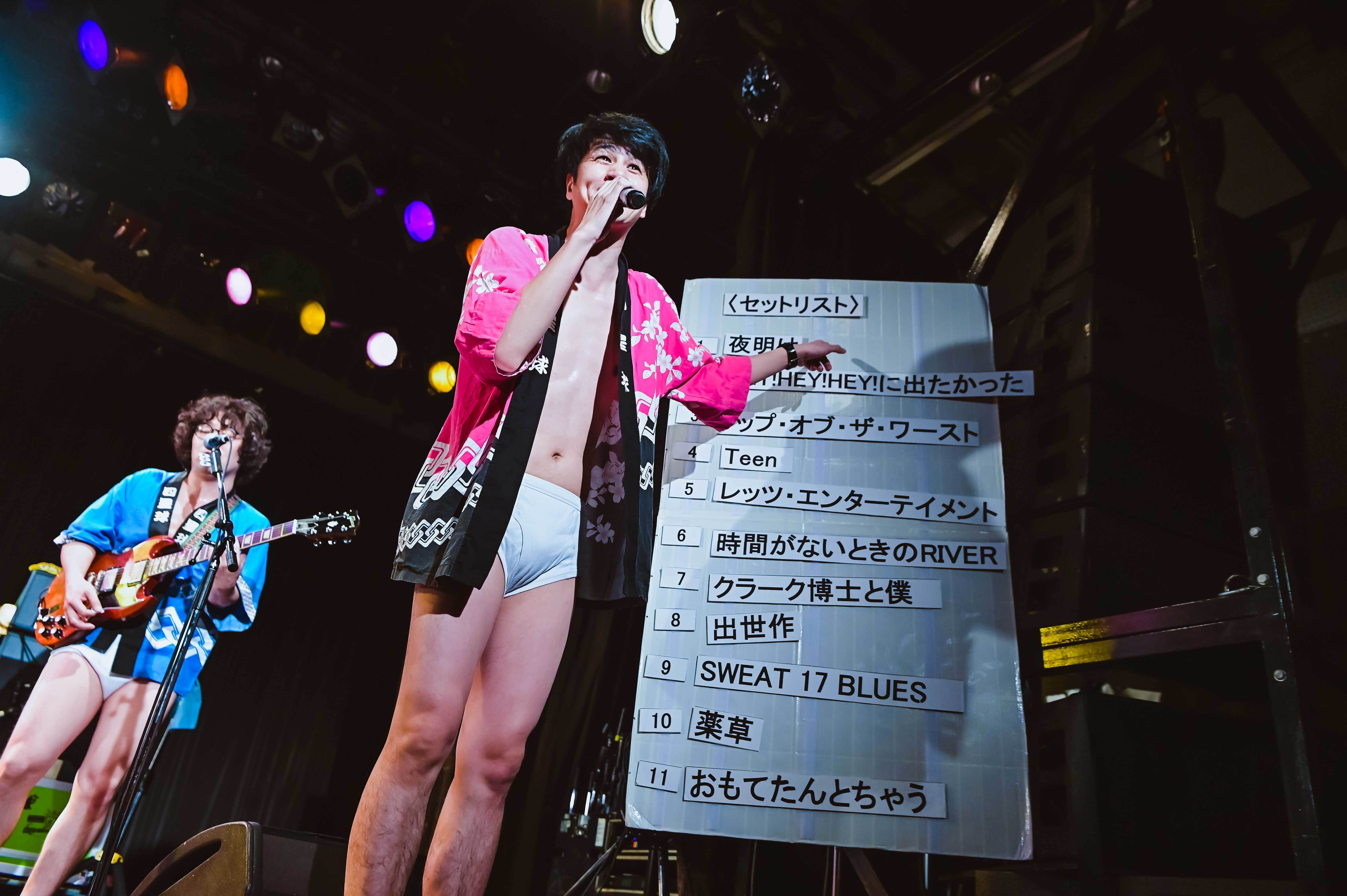 圧巻は、ここからだった。ステージ端に用意された曲順表を振り返っていく。「こんなに待ちわびた「夜明け」は御座いませんでした」から始まり、全曲のタイトルや歌詞を引用しながら11曲を物語にしていく。ラスト11曲目「おもてたんとちゃう」は「おもてたんとちゃうけど楽しかったでしょ!? おもてたんとちゃうことも楽しんでいきましょ!」と締められた。そして、おもてたんとちゃうことは、まだ続き、12曲目「世明け」が歌われる。この嫌な世の中が明けていけばいいのに……、てか、この壮大なライブハウス創作落語は何なんだ……と心から感動していたが、オチはズッコケてしまう下ネタ。まぁ、そんなおもてたんとちゃうところも含めて、やはり壮大なライブハウス創作落語であった。