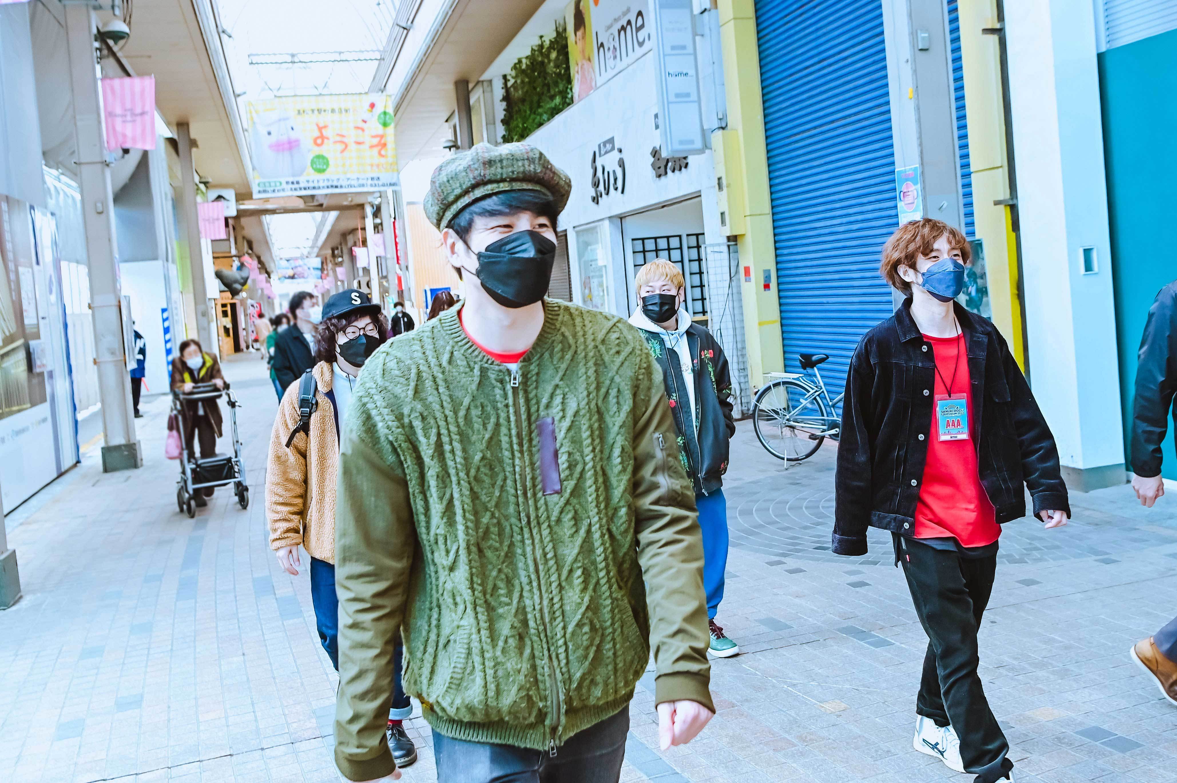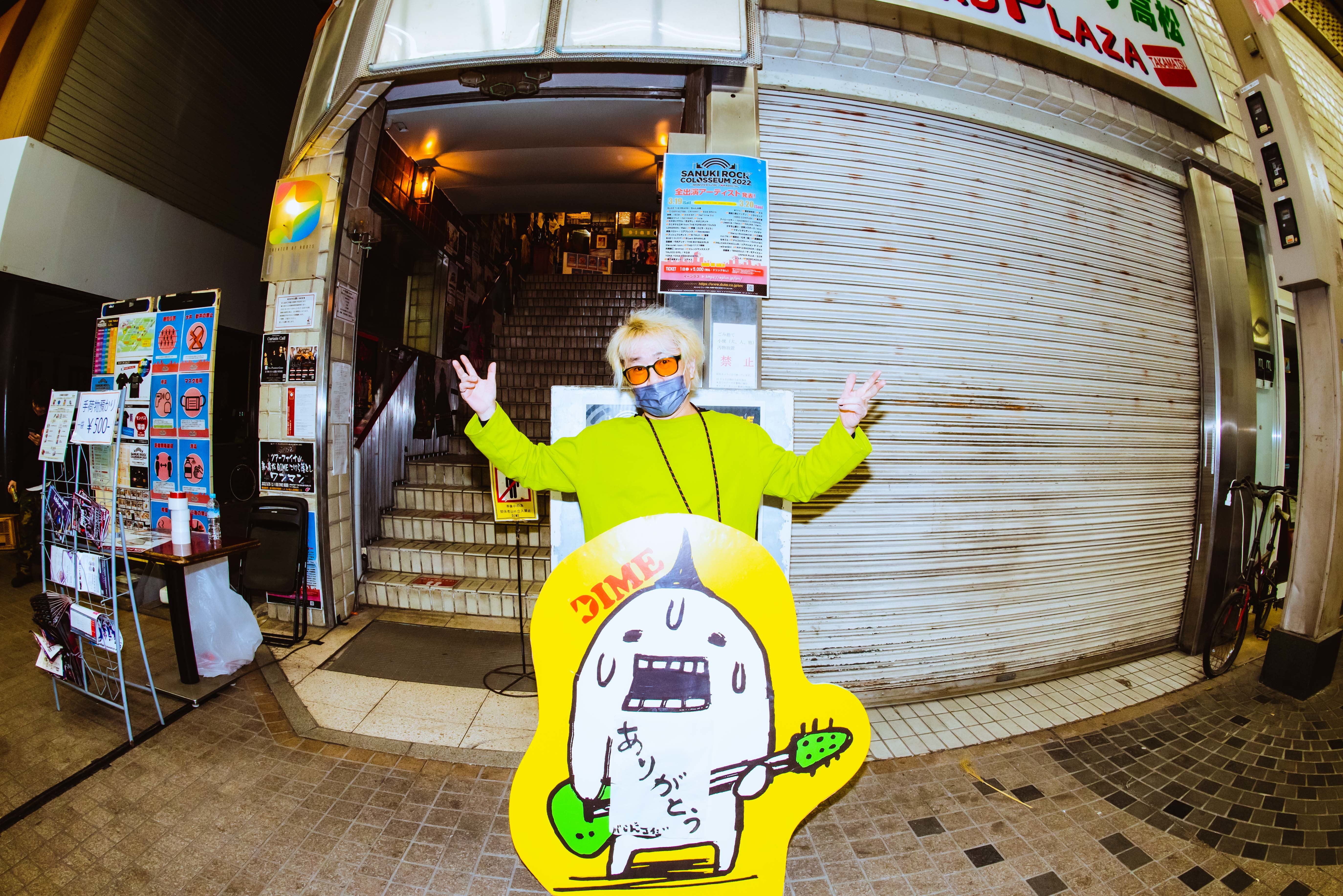公開生放送が終わり、四星球は慌ててオリーブホールに移動するが、車移動や裏口を使うわけでもなく、普通に観客と共に、地上へと向かい商店街を歩く。歩きながら、康雄に井川達雄さんという人物の話を聞いた。去年3月末までFM香川でディレクター兼パーソナリティ、サヌキロック立ち上げにも関わっていた方だという。康雄はラジオ喋りのイロハ全てを教わったと熱く語ってくれる。今、存在を知ったばかりの方なのに、康雄が興奮して喋れば喋るほど、その熱量にやられて、こちらも急激なスピードで康雄の井川さんへの想いに感情移入してしまうから不思議だ。街の人々によって作られてきた大切な祭だということを改めて実感する。そんな井川達雄さん、2021年3月30日(火)のFM香川最後のブログで「去年新型コロナの影響でサヌキロックを中止した際、トキワ街のお花屋さん「カタリ」で買った鉢植え庭桜。来年はみんなが笑える春になりますように!」と写真付きで書いていた。どれだけの思いで、街の人々が2年間を過ごしてきたことか……。先程、知ったばかりの人との思い出で、それも初日始まって20分くらいしか経ってないのに、とてつもなくエモーショナルな気持ちになってしまう。ここから翌日のDIME大トリ四星球まで、僕たちの感情はどうなってしまうのだろうかと嬉しい不安に陥る。