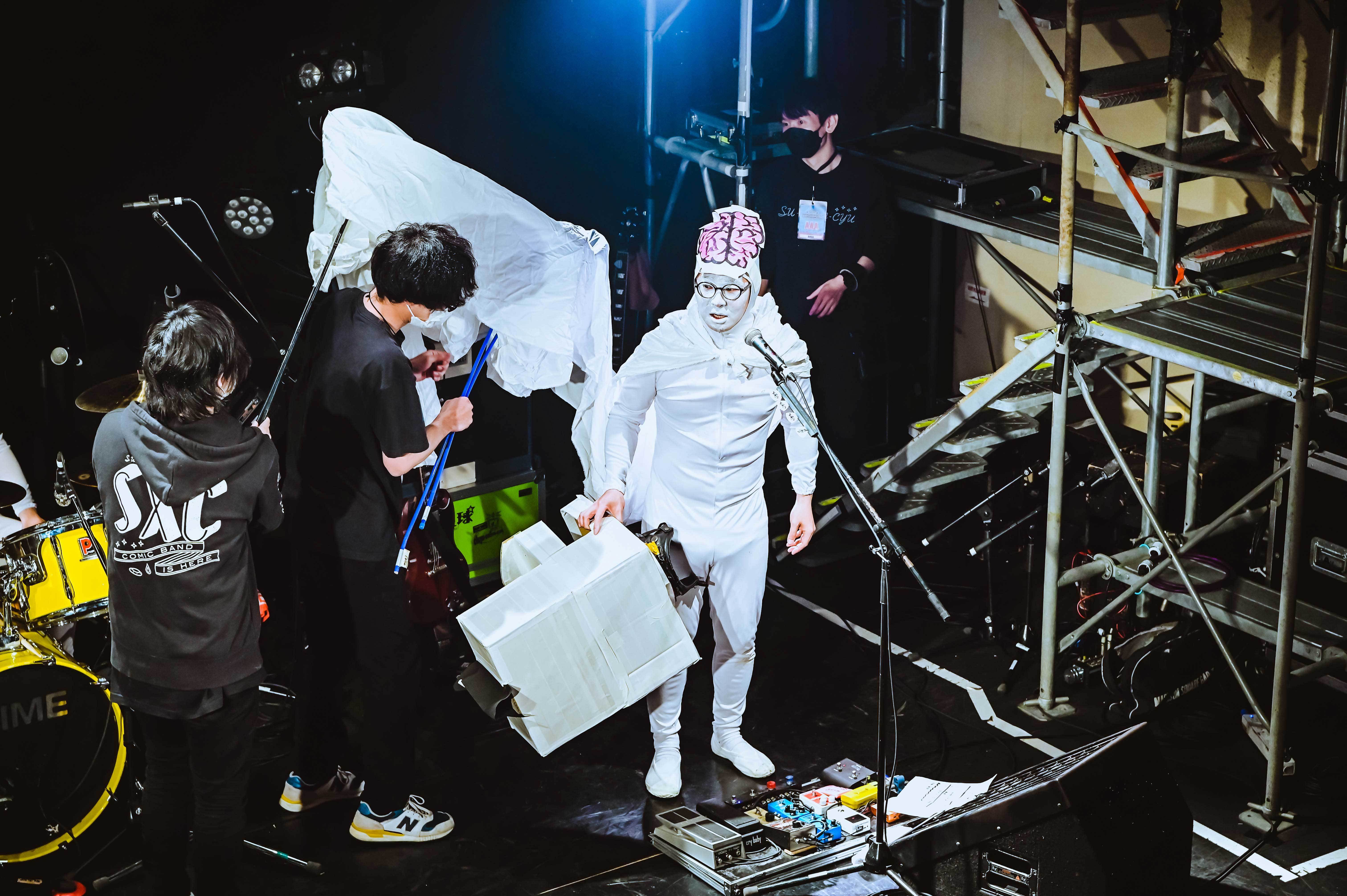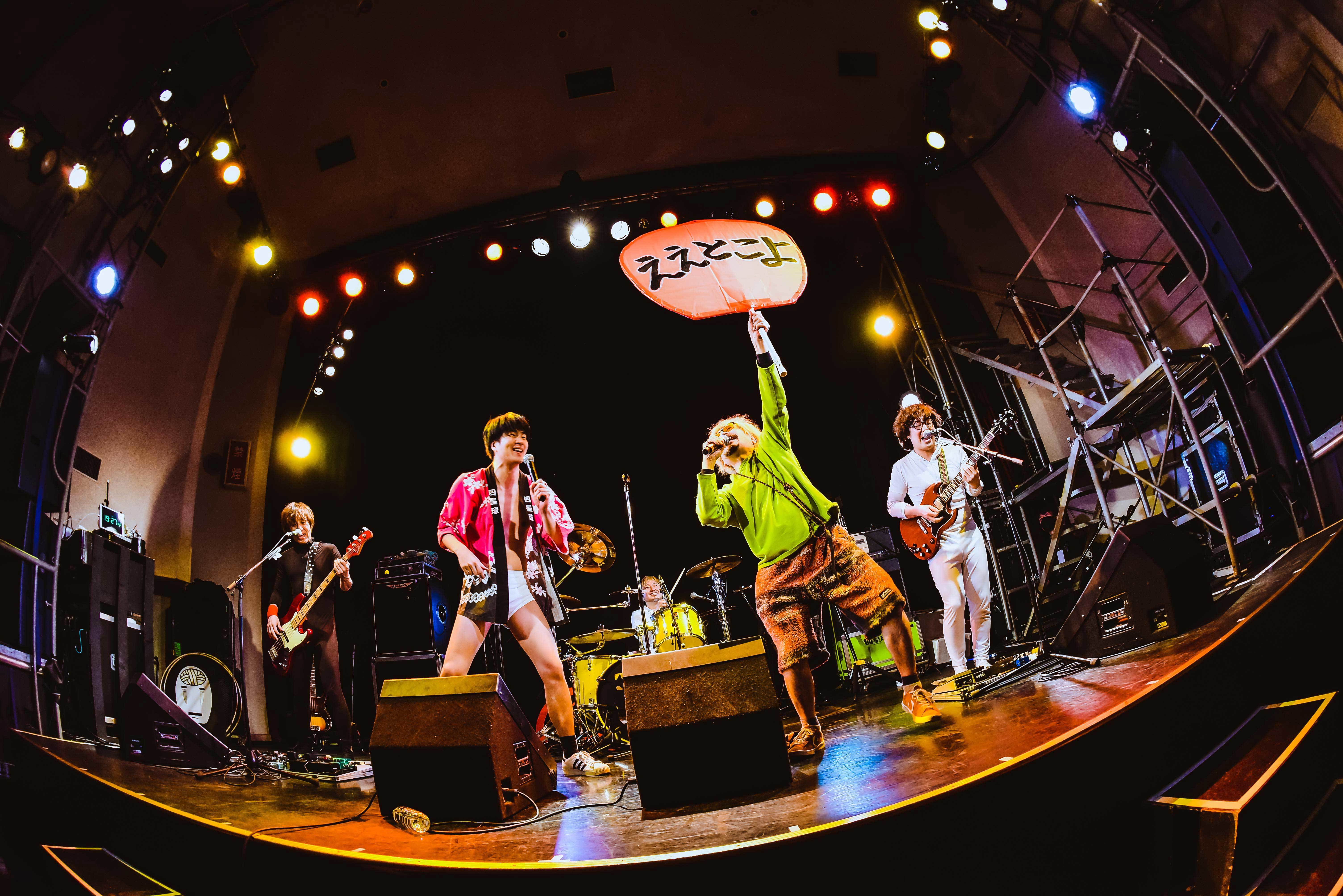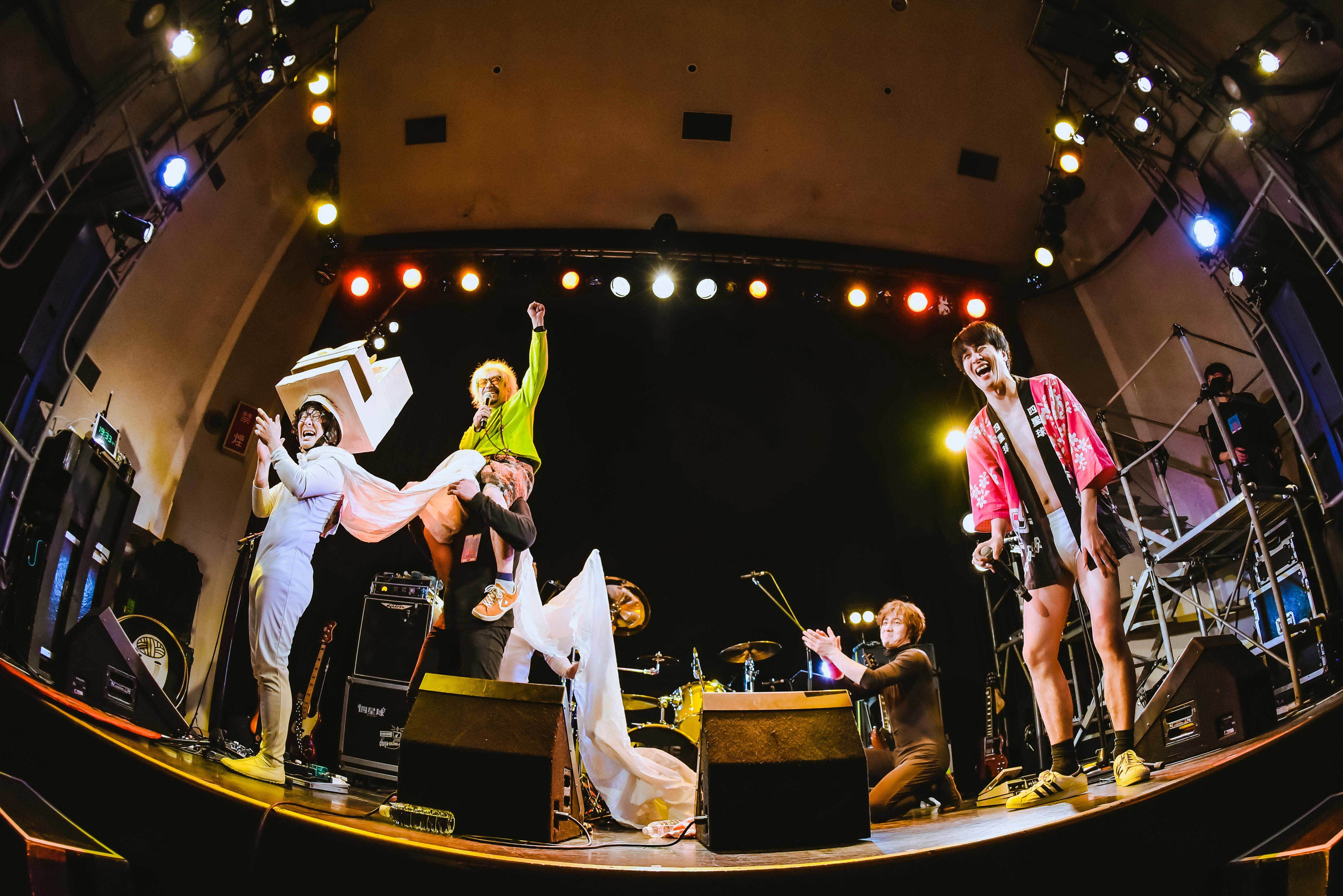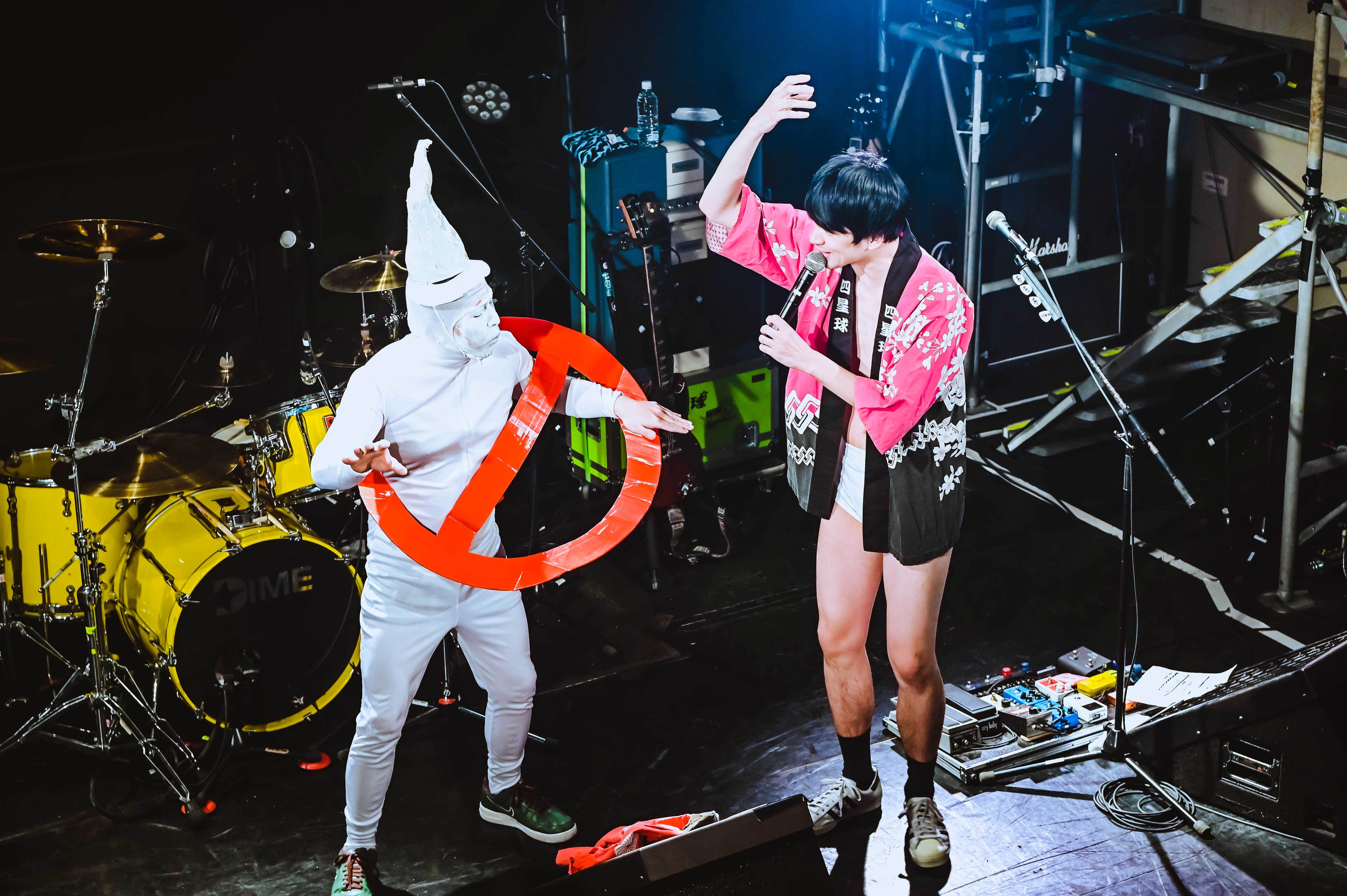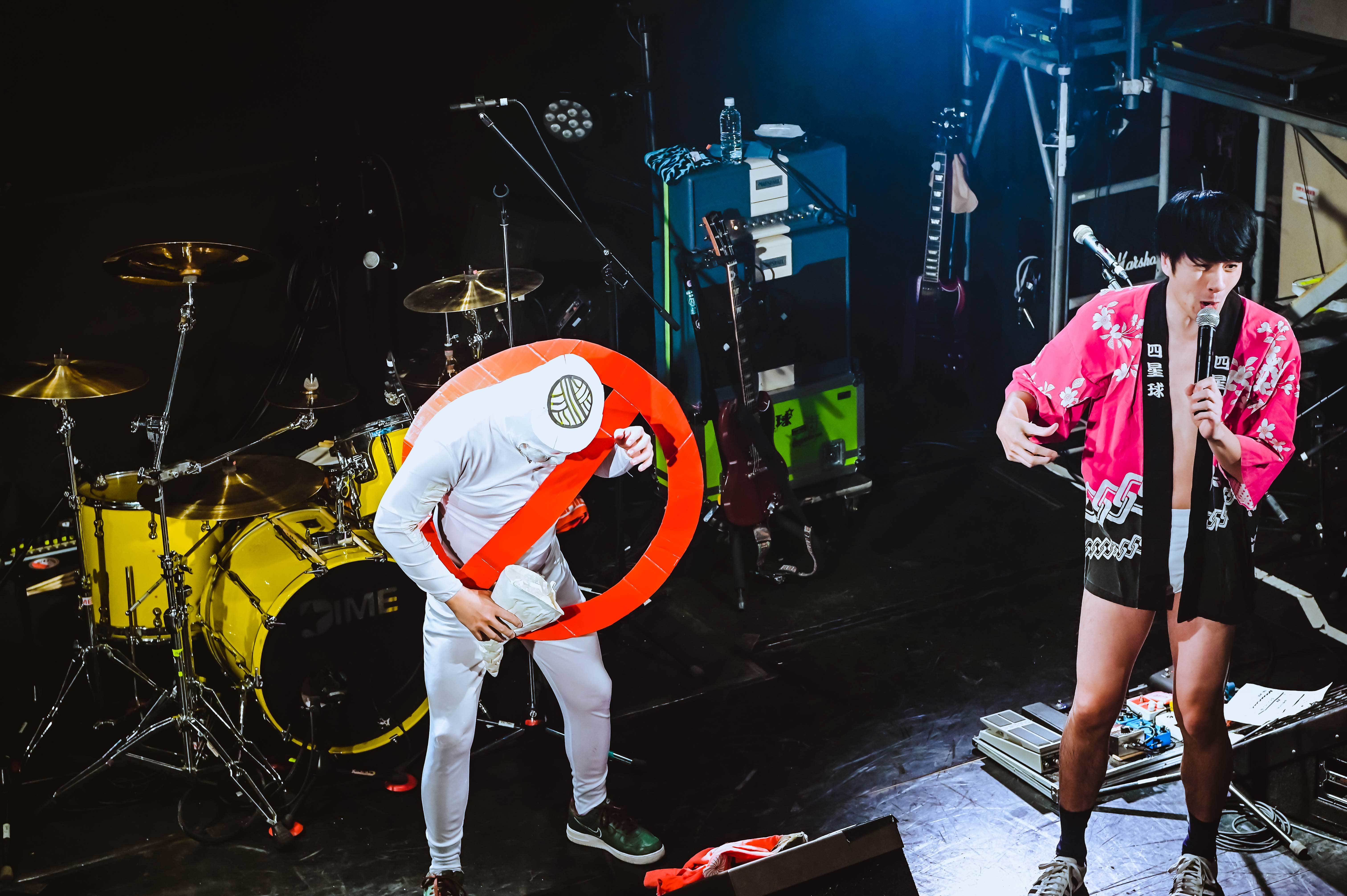 まずは康雄ひとりが袖横の階段から降りてきて、少し喋る。「アカンなぁ、実感湧いてきました……。18年間お疲れ様でした!」とセンチメンタルになりながらも、グッと気持ちを保ち、ライブを始めていく。元映画館という地の利を生かして、名作映画のキャラがDIME移転を惜しんで来てくれてると紹介。まずはモリスが『ゴーストバスターズ』のマシュマロマンに扮して登場。で、頭をパカっと開けると香川だけにうどん脳が姿を現わす。U太は『千と千尋の神隠し』のカオナシに扮して登場。で、頭をパカっと開けると香川だけにうどん脳が姿を現わす。これだけ丁寧にふって、まさやんが『ネバーエンディングストーリー』のファルコンに扮して登場。で、頭をパカっと開けると、まさかのグロい脳みそが姿を現わす! 最初の康雄に引っ張られ、一瞬でも泣きそうになっていた自分が良い意味で馬鹿馬鹿しくなる。康雄の「四星球、始まります!」で最高のスタートを切った。