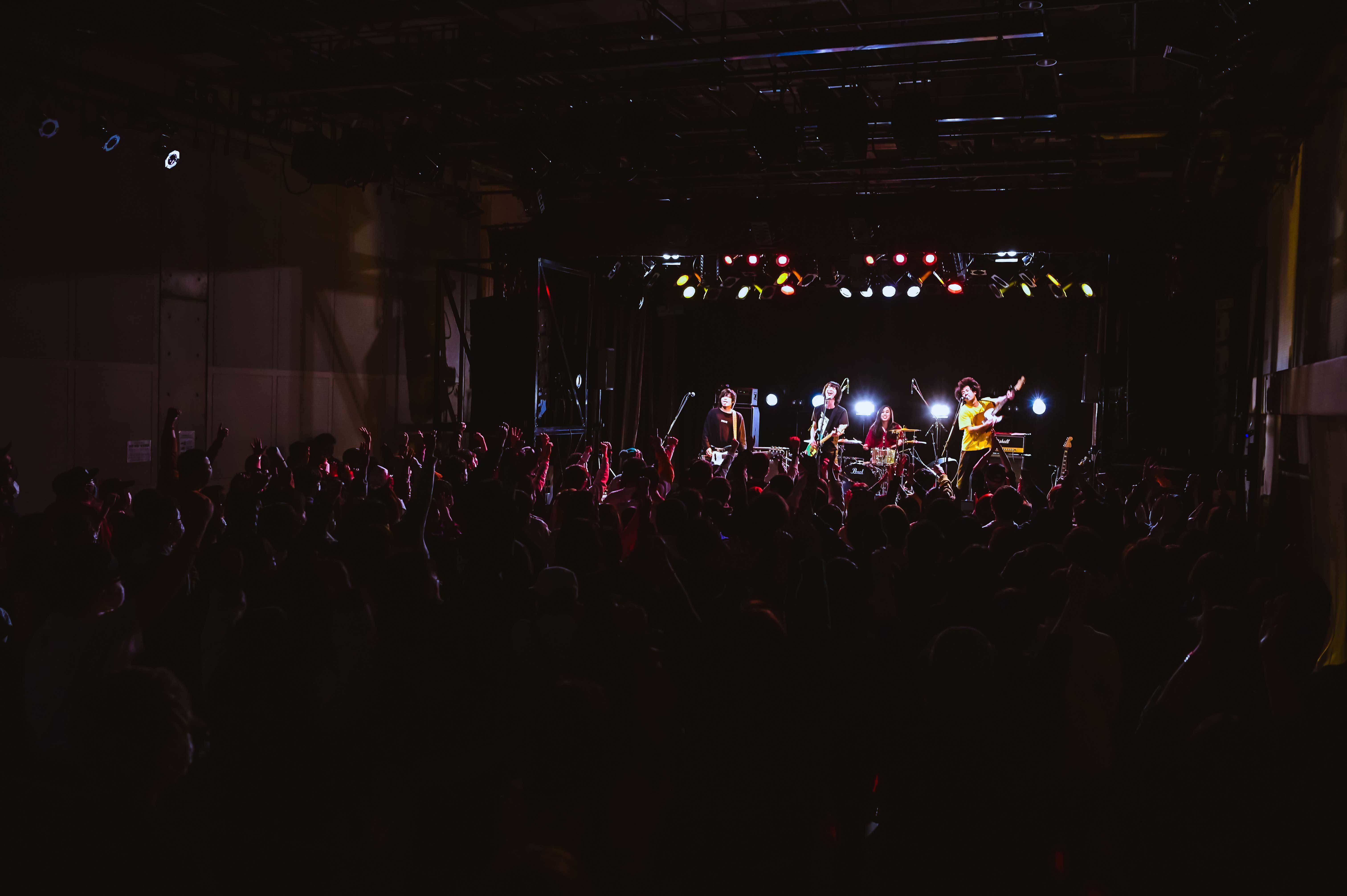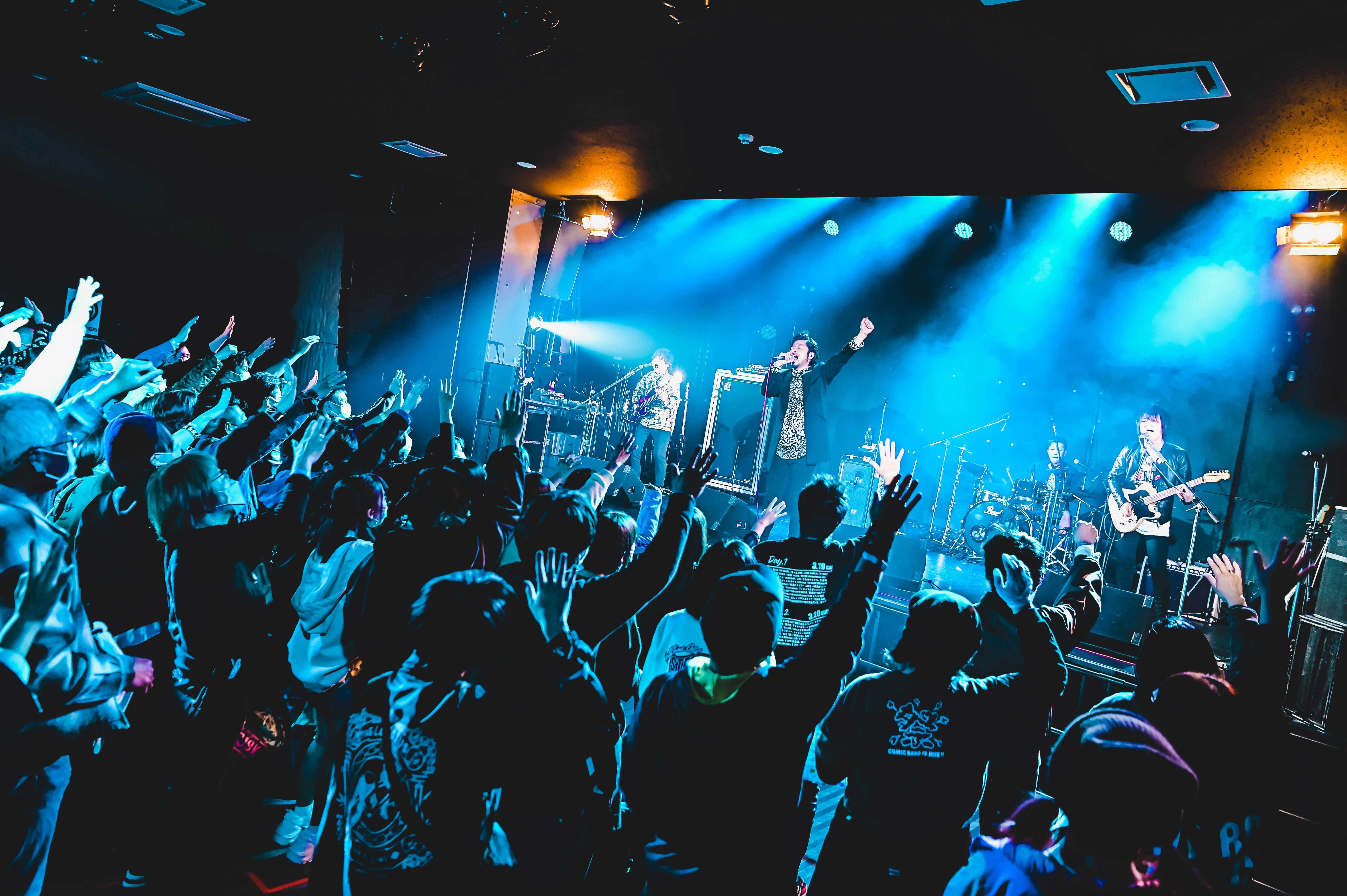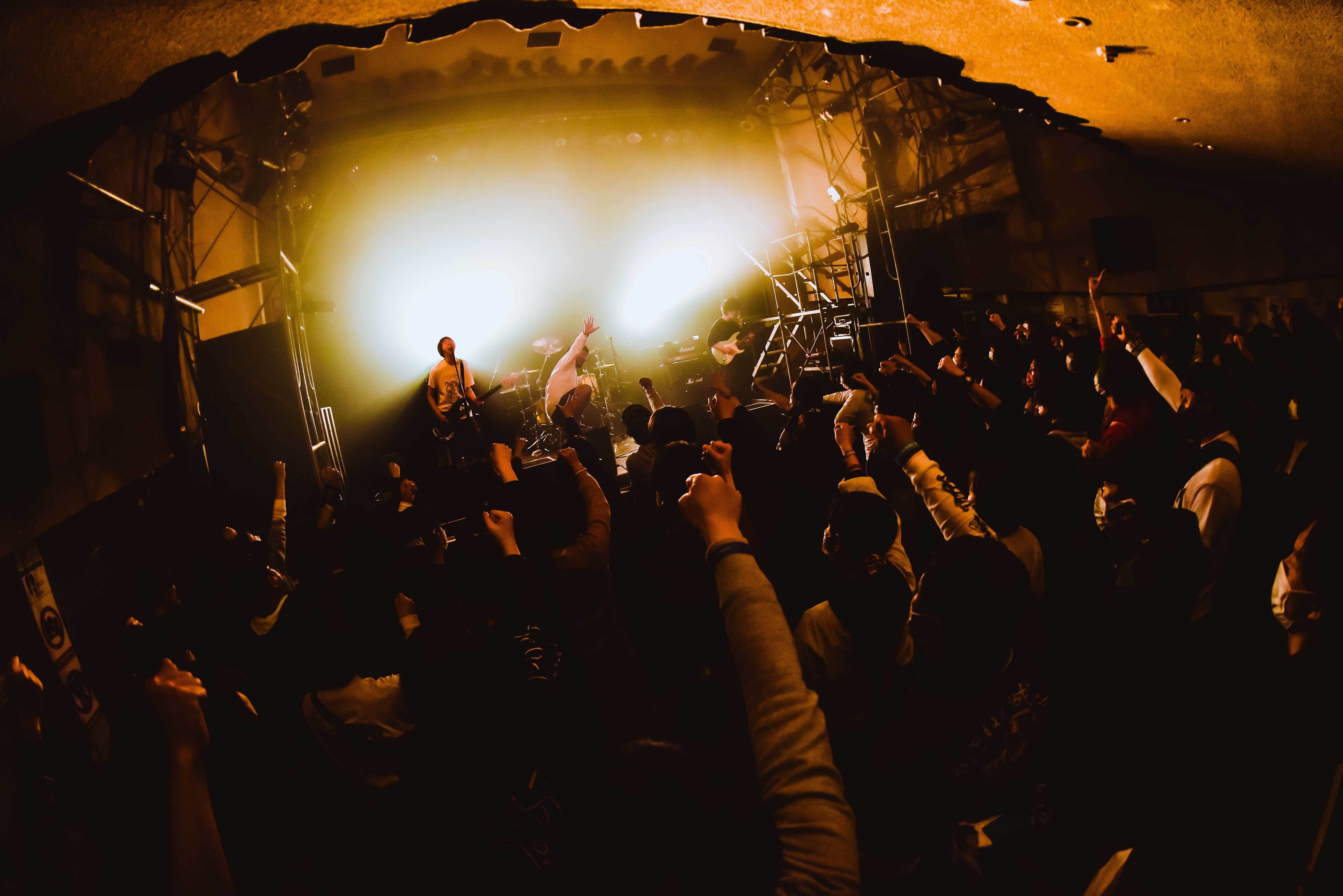 DIMEで数多くの若手バンドがしのぎを削ったのだろう。そんな歴史を勝手に感じながら、DIMEをより知るために、瓦駅町地下広場の特設ステージのトーク企画「DIME引越し会議」を覗きに行く。DIMEと馴染み深い四星球のモリス、ガガガSPのコザック前田、BUZZ THE BEARSの越智健太の3人と、DIMEのエイジ店長がライブの思い出話を中心に話している。さて、2004年8月にオープンしたDIMEだが、エイジ店長の話により、元々は松竹系の『男はつらいよ』などが上映されていた映画館だったと判明。それならば、小ぶりだがステージと天井が高いという内装に納得がいく。商店街に面した雰囲気のある階段も昔ながらの映画館ならでは。DIMEの正体を知れて満足しながら、今回の会場で一番キャパが大きいfesthalleへと向かう。
