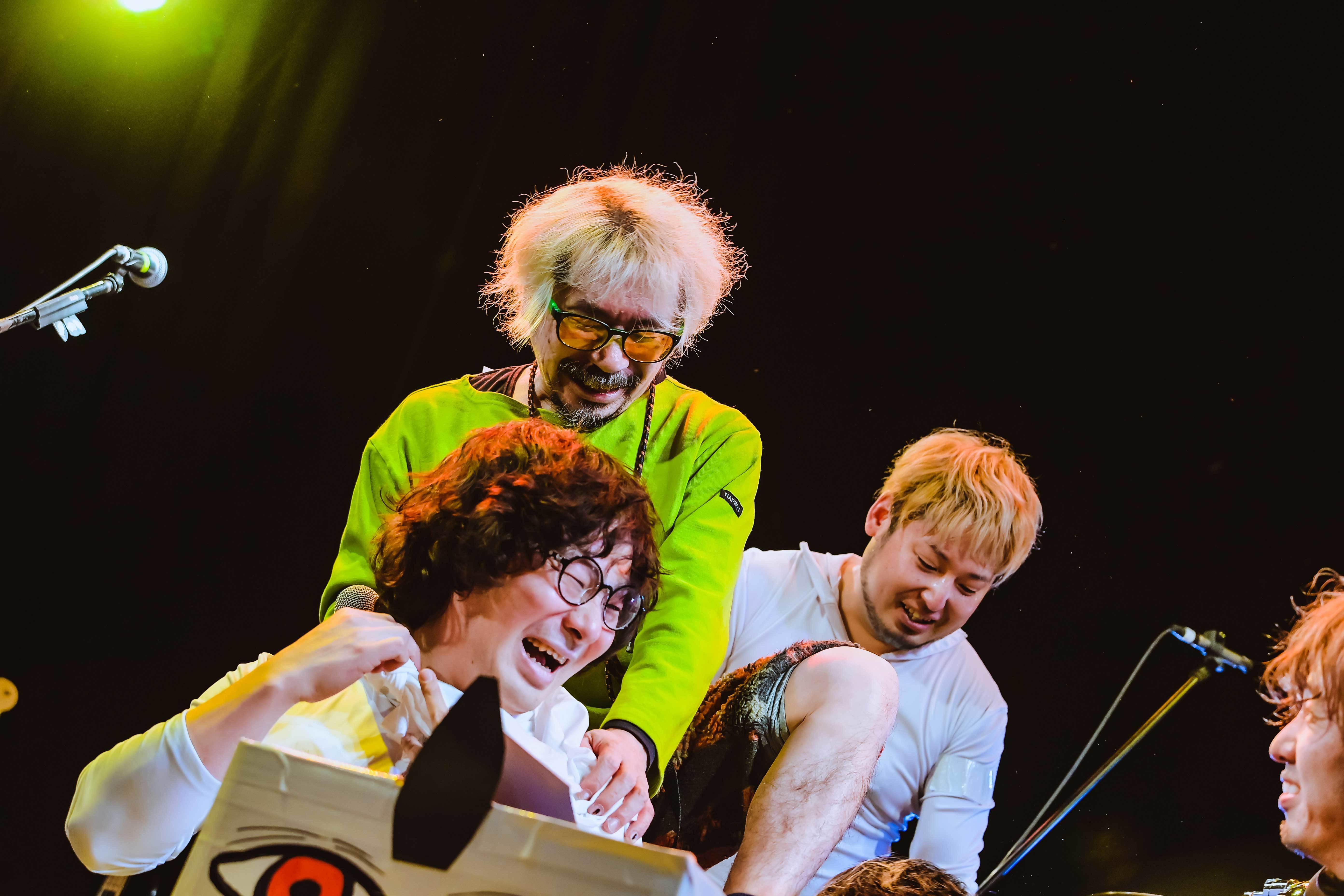 6曲目「薬草」でも、とんでもない流れがやってくる。U太のベースから突如音が出なくなってしまったのだ。最初はどうにかしようと思っていたU太も諦めてベースを放り出して、マイクを持って、康雄の横に並んで歌い出す。四国の大学で出逢った康雄とU太がショーマストゴーオン精神で、何が起きても舞台を止めずに走り続けていく。康雄も刺激を受けたのか、ベースを何とか修理しようとするスタッフからベースを奪い取り、スタッフの首にかけて弾かせようとする。このふたりが刺激し合った時の大爆発が大好きだ。初日の整合性に感嘆するライブとは全く異なる、混沌から暴走する最終日ライブに引っ張り込まれて、いよいよラストナンバーへ。