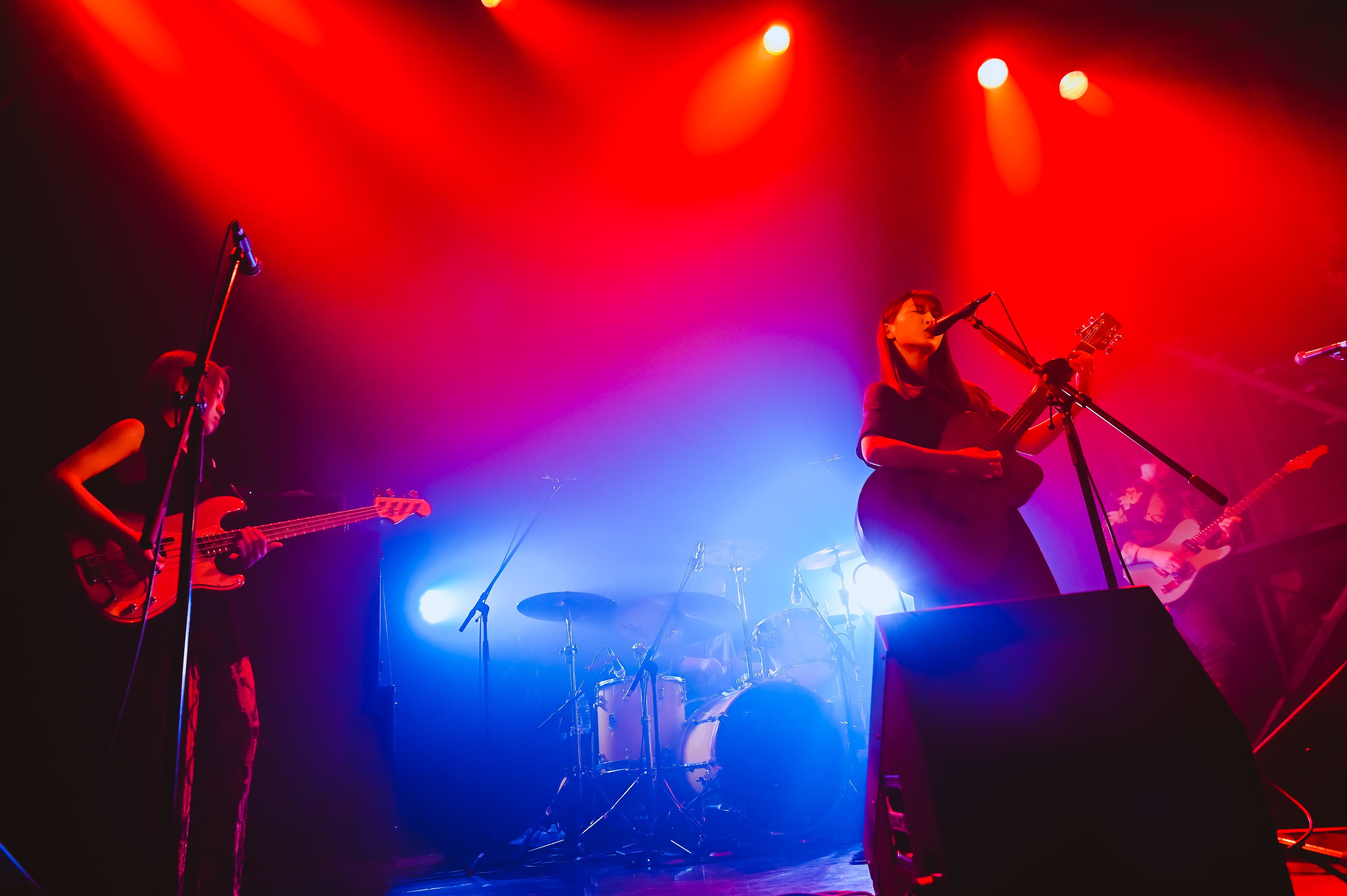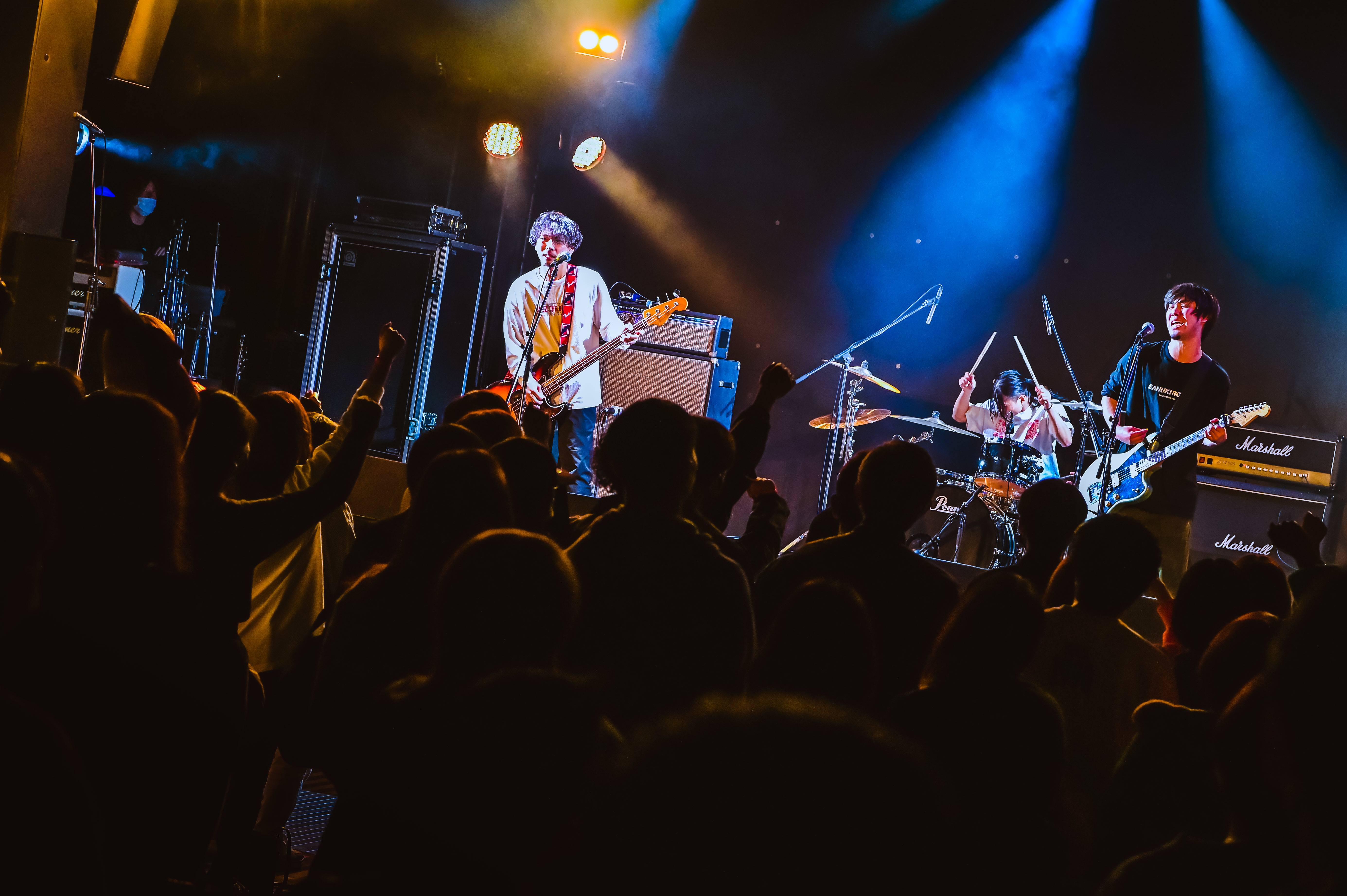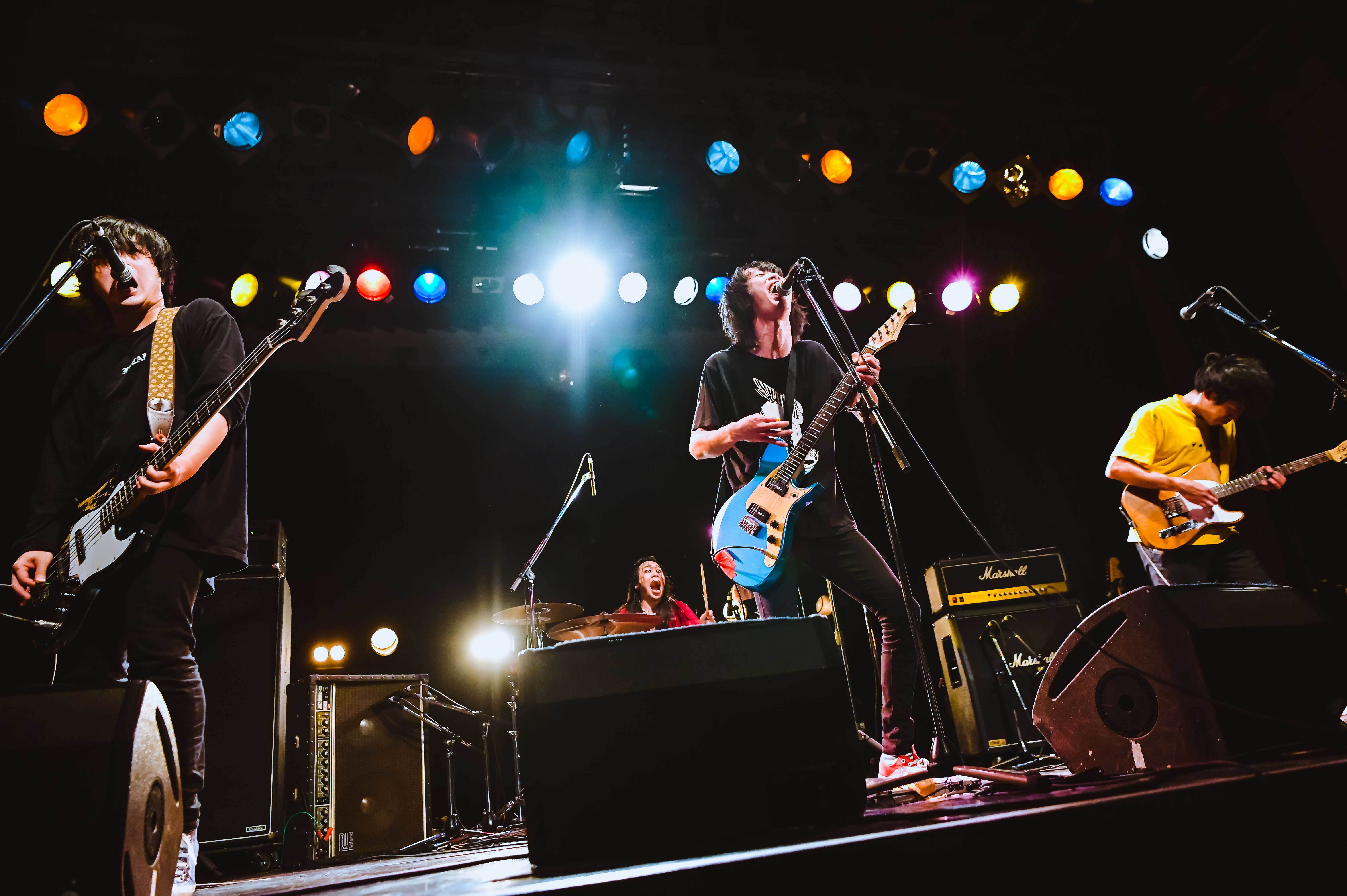 いよいよ初日のラストライブは、festhalleにて地元四国のLONGMAN。一番キャパが大きいライブハウスで、地元四国のバンドがトリを飾るというのは美しい。さわちゃん(Vo.Ba)が元気いっぱいに登場して、LONGMANタオルを掲げる。男女ツインボーカルで、1曲目からさわちゃんが笑顔でベースを弾きながら、ギターの平井くん(Gt.Vo)の後ろを飛び回る。朝のトップバッターから夜のトリまで、8時間ずっとライブを観てきた観客からすれば、その最後をとびっきり笑顔のライブで締められるというのは最高の極みだろう。平井くんが「小6まで高松に住んでました!」と話してからの「Back Home」も爽快だった。