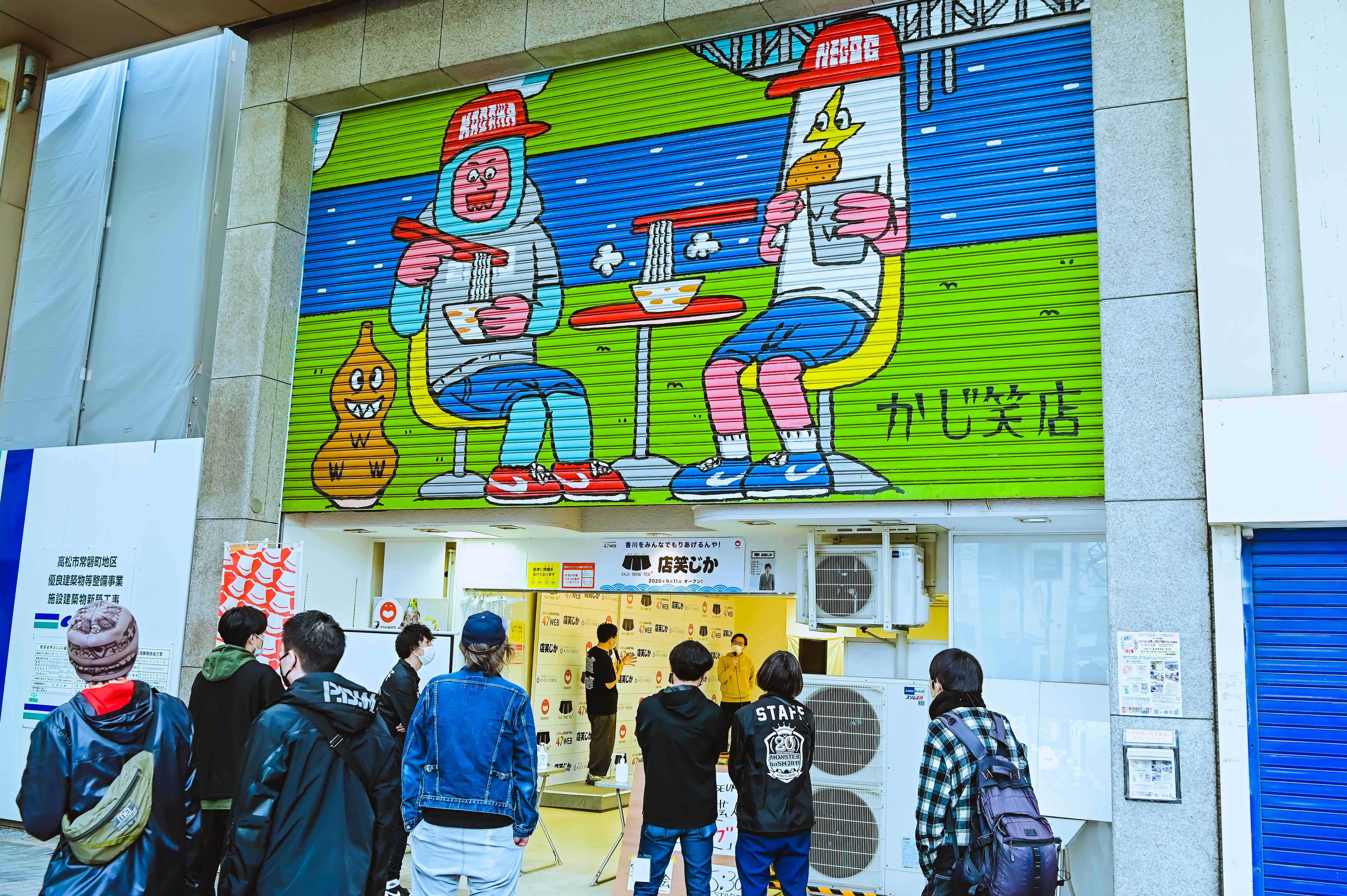 商店街のアーケード内には、ミュージシャンやイベントの物販エリアも設置され、それぞれ段ボール片手に物販準備をしている。その横には町の人たちの日常があたりまえにある。商店街には、「大浦梶」やムーディー勝山との「勝山梶」(後にアイスクリームに改名)といったコンビでも活躍し、現在は地元香川で「よしもと住みます芸人」を務める梶つよしの情報発信スペース「かじ笑店」もあり、出演ミュージシャンたちがトークイベントを繰り広げている。また、飲食店を中心に、21店舗がイベントとコラボしたメニューを提供していたり、イベントのリストバンドを提示すると受けられるサービスもある。中には、日焼けサロンや足ツボにまつわる特典もあり、その幅広い街ぐるみな感じに思わずニヤけてしまう。
