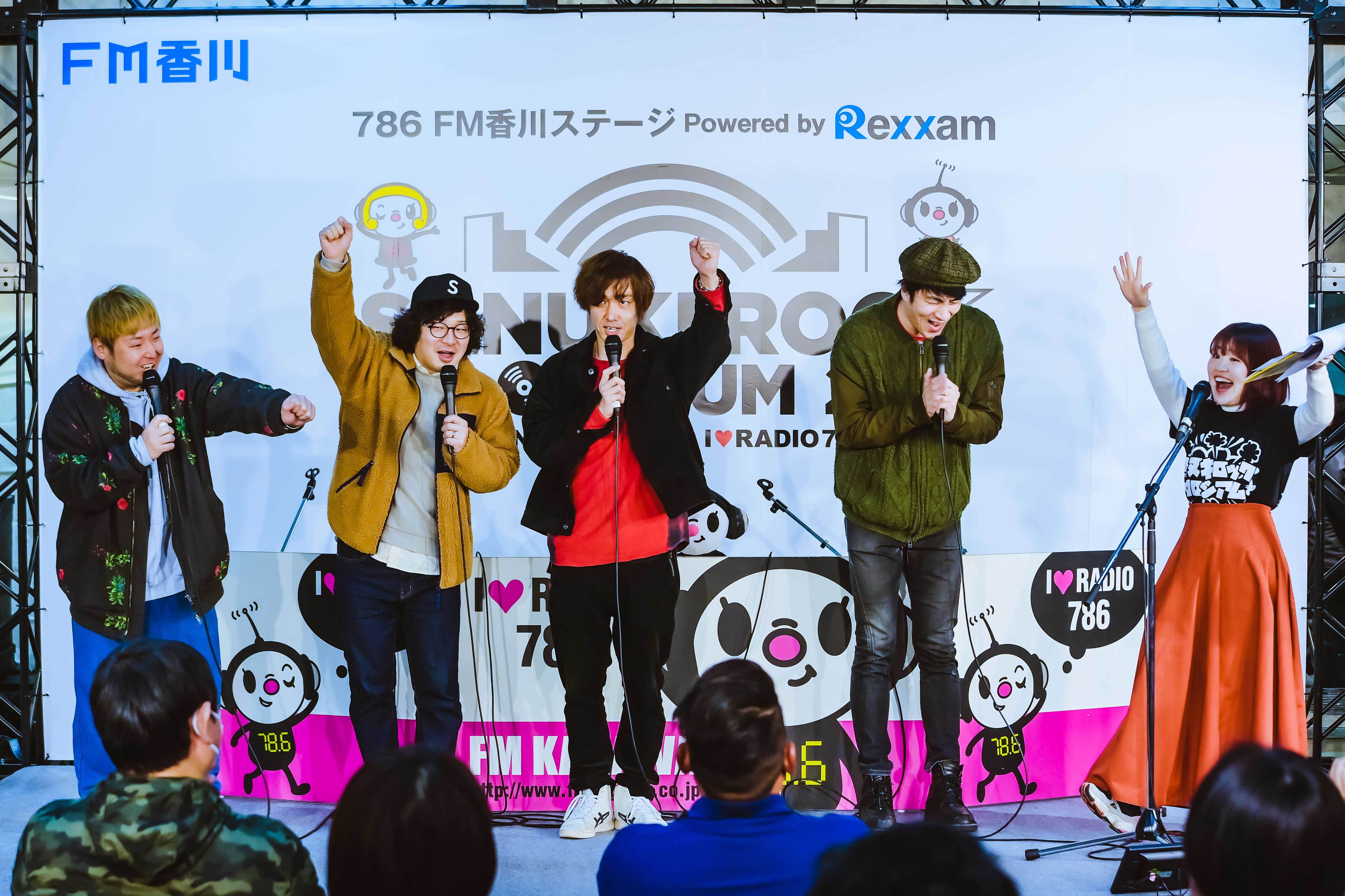 初日の3月19日(土)朝11時。瓦町駅地下広場の特設ステージ「786FM香川ステージPowered Byレクザム」にて、公開生放送特別番組『サヌキロックがやってきた!』からイベントはスタート。四星球のメンバー全員で開幕宣言を行うのだが、12時にはオリーブホールで四星球のライブがある。いくら半径200m以内に会場があるとはいえ、この時間この場所にいるのは、どう考えてもおかしい。でも、おかしい事を本気でやり抜くのが、祭の醍醐味でもある。