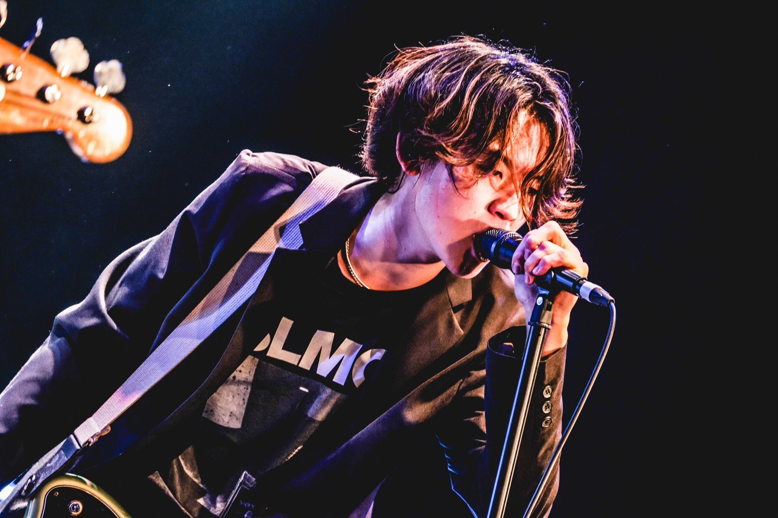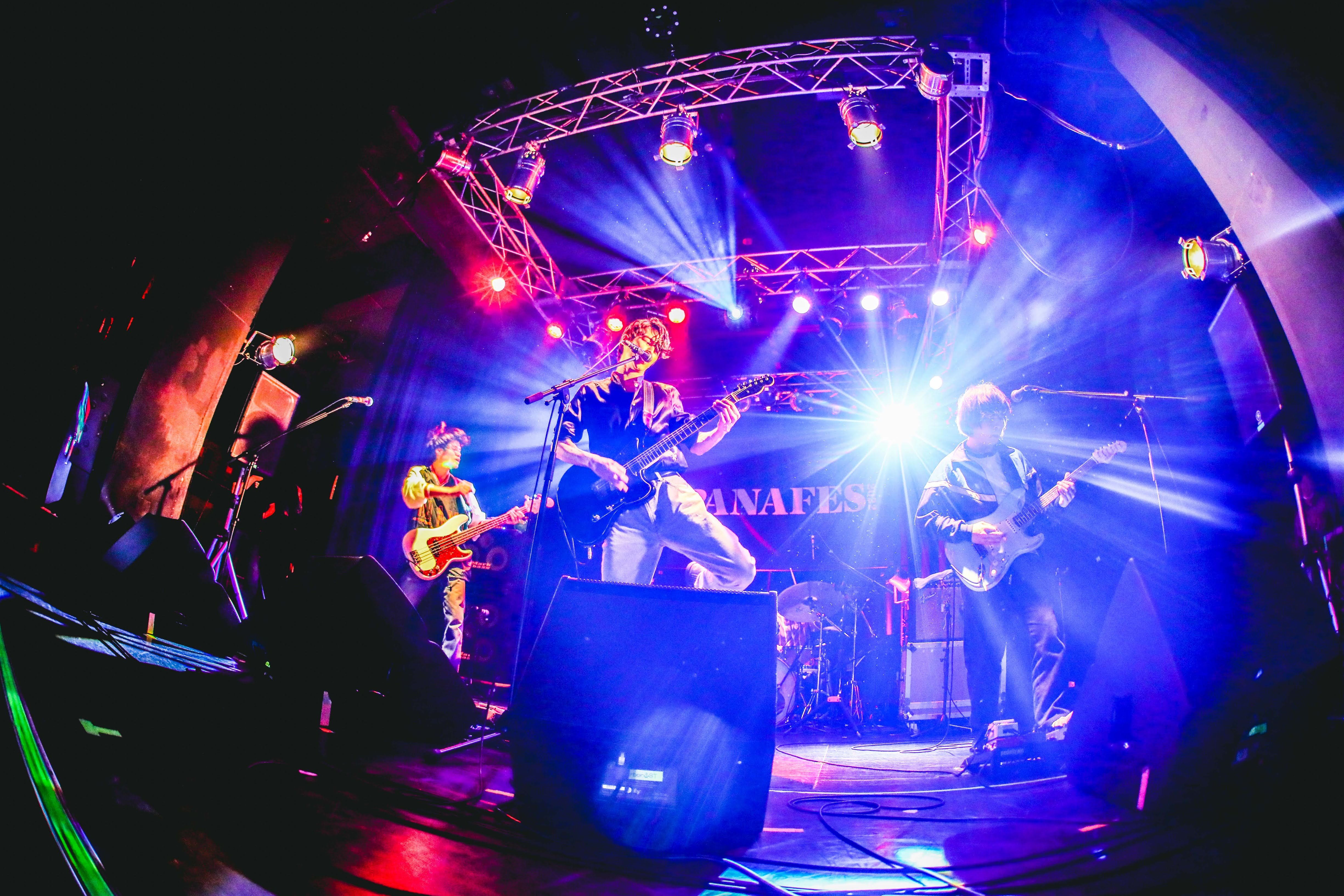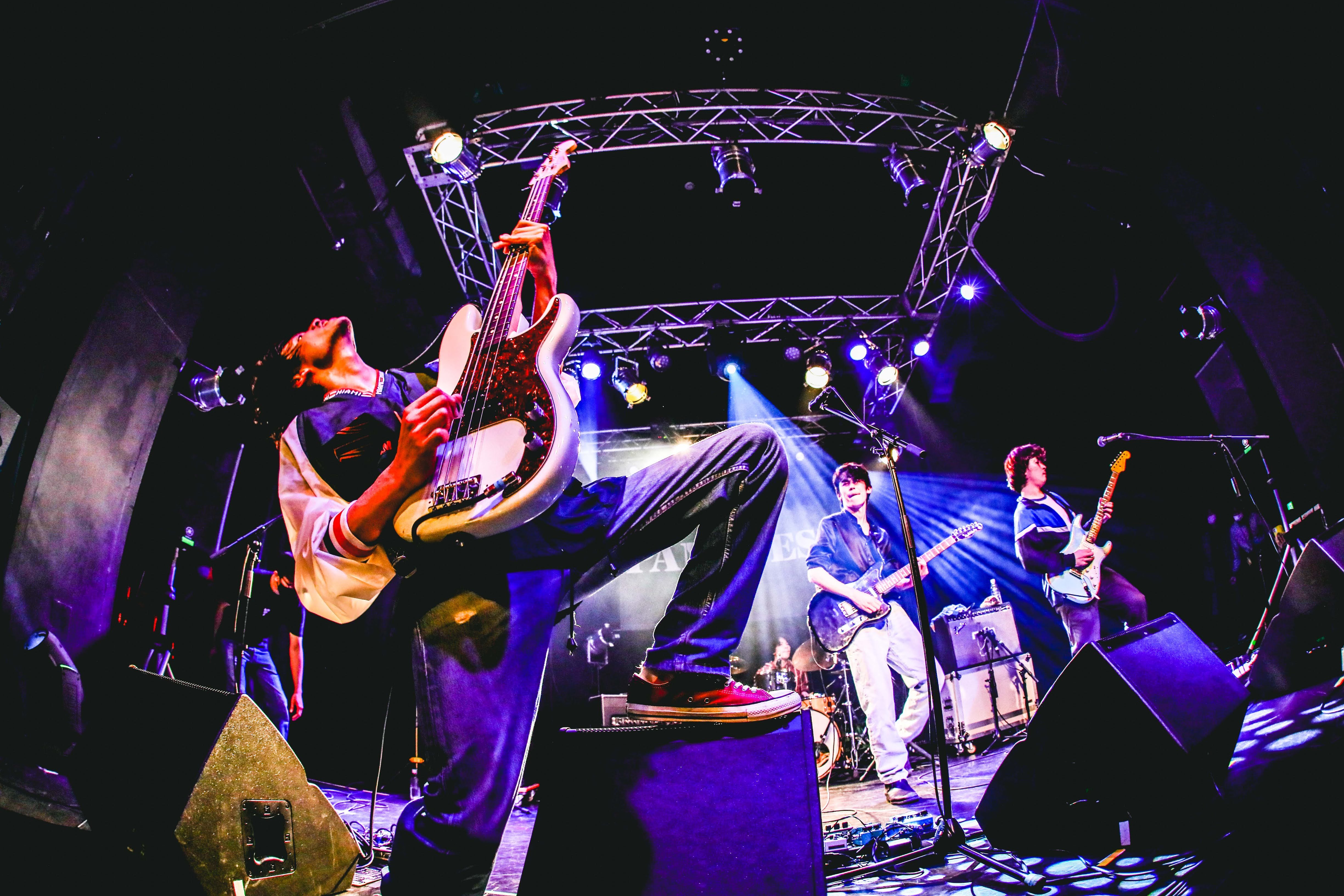 トップバッターは神戸のSLMCT。轟音のSEが流れ、ステージには機材を彩るネオンがスタイリッシュに光る。小川悟(Vo.Gt)がよく通る鋭い声で「Decade」を歌い始め、爆発力のあるサウンドが一気に広がる。個人的に彼らのライブを見るのが結成当初ぶりだったため、楽曲のエッジーさ、サウンドの力強さ、パフォーマンスの男っぷりが遥かに上がっていて驚いた。上羽一志(Dr)はレギュラー・グリップで激しいリズムを叩き込み、島田将羅(Ba)は躍動感たっぷりにプレイ、小川はステージを斜めに突っ切り全力で演奏し豪速球のステージングを見せつける。「Flashback」「TALK」と立て続けにドロップ。帰国子女の小川による流暢な英語詞が耳に心地よく、フロアは一心に体を揺らして手を挙げる。大平 “王将” 雅樹(Gt.)は時折恍惚とした表情でギターを鳴らしていた。