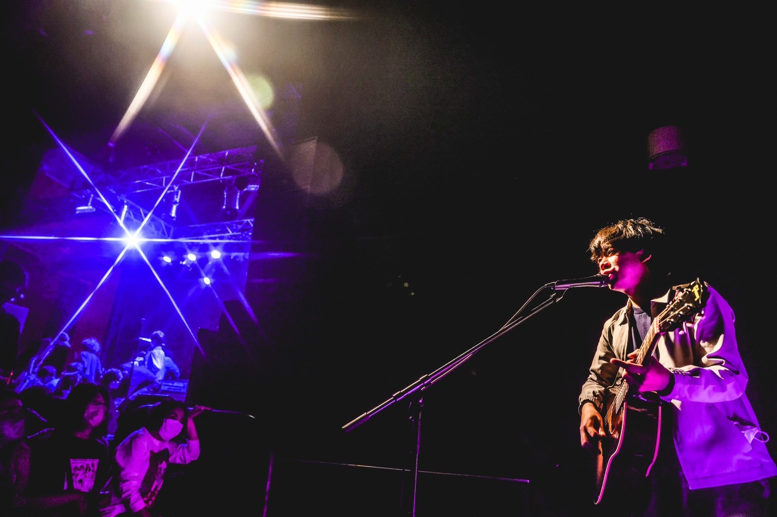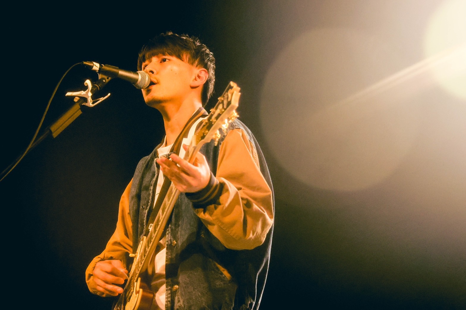 本当ならばバンドでの出演だったが、さえこ(Ba)の体調不良により、急遽、須田亮太(Vo.Gt)の弾き語りに変更となったナードマグネット。1人ステージに登場した須田は「ギリギリまで何とかバンドでできないかという道を探ってたんですけど、なかなかうまくいかず、家にアコギを取りに帰る時間もなく、バンドで使う予定だった機材で僕が1人で歌うことになりました」と状況を説明。さらに「人の事情はわからないものですからね、僕だってあなたがどんな人生を歩んだ上で今日ここに集まってるのかもわからない。だからこそゆっくりお話しをするところから始めていきませんか」と、エレキギターの弾き語りで「僕は知らない」を演奏。透明感のある歌声がまっすぐに飛び込んでくる。続く「HANNAH / You Are My Sunshine」では、高く天井に吸い込まれそうな高音が響き渡る。力強い声量はさすがだ。ギターだけのシンプルな演奏だからこそ須田の歌声がハッキリと引き立ち、バンドサウンドとは違った面を見せてくれた。