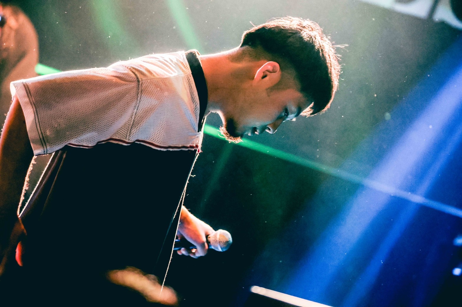 続いて、空きっ腹に酒のユキテロ、memento森の慧、にゃおみの3MCと、インダストリアル・ノイズ系ビートメイカーのShin Wada(UZMK/iLU)によって結成されたS.L.N.M(サルノメ)が登場。1曲目の「Forgod」では、紅一点のにゃおみ(MC)を挟み、ユキテロと慧が両サイドから高速フロウを叩き込み、S.L.N.Mワールドに巻き込んでゆく。慧が「調子どうですか神戸!」ユキテロが「いけてんなら手挙げてくれ!」と叫ぶと一斉にハンズアップ!「遊びに来たんやろうが!」と、まくし立てるようにフロアを煽りまくり、「AGURA」を投下。ほぼ動かず、クールビューティーな歌声を奏でるにゃおみと、思いっきりステージを動き回る慧とユキテロ。そして曲を支えるShin Wadaのビート。目の前で起こる唯一無二の化学反応についていくだけでやっとだ。ユキテロが「夕方16時にやることちゃうで(笑)」と言うほどディープな熱狂を見せたフロア。さらに「swipe!!!!」「My life」を続けざまにドロップ。