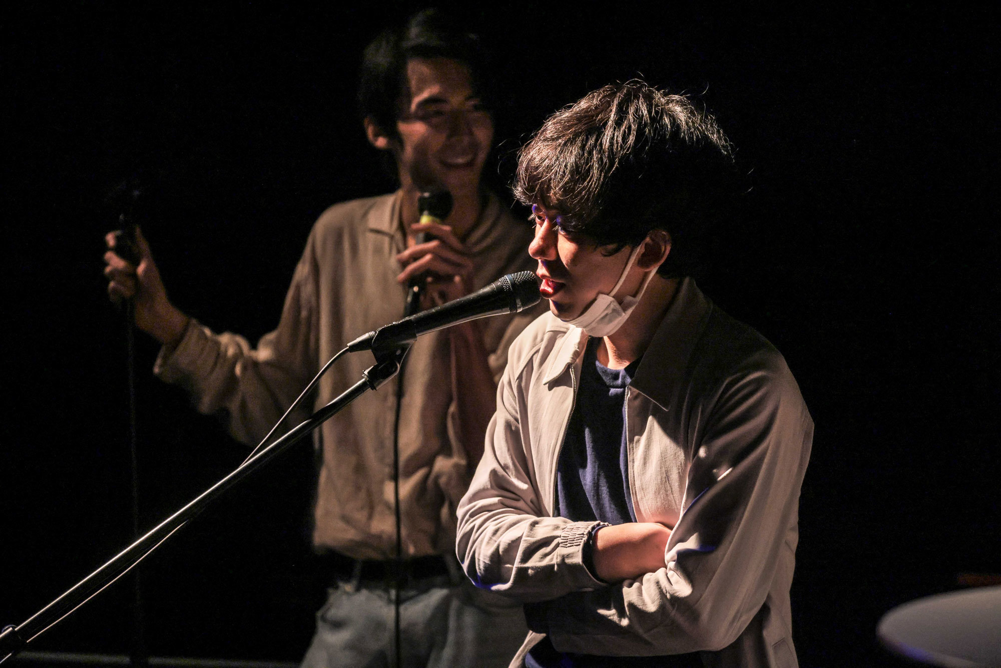 お待ちかねのフリースタイル嘘話では、カーミタカアキ(URTLA CUB)が再び登場。サブステージの後ろでは、バンド仲間たちがガヤガヤとカーミを見守る。カーミ曰く「ウケたことない」「大舞台であればある程大失敗する」と豪語(?)していたのだが……。「Twitterのスペースで聞いて、めちゃめちゃ面白くて楽しみにしていた」という岩渕から「パナフェス・恩師・2会場」、客席とSLMCT島田から「スプリングバレー・新開地・まぼろし」というお題をもらって嘘話を2本披露。ここぞというタイミングで、タノアキヒコ(Ba)がアークティック・モンキーズの「Brianstorm」を掛けたり、何だかんだで盛り上がり、大きな拍手が贈られた。「来年もやりたいな」とのことで、『パナフェス』の新たな名物コーナーが誕生した瞬間に立ち会えた(かもしれない)。来年も是非楽しみにしておこう。